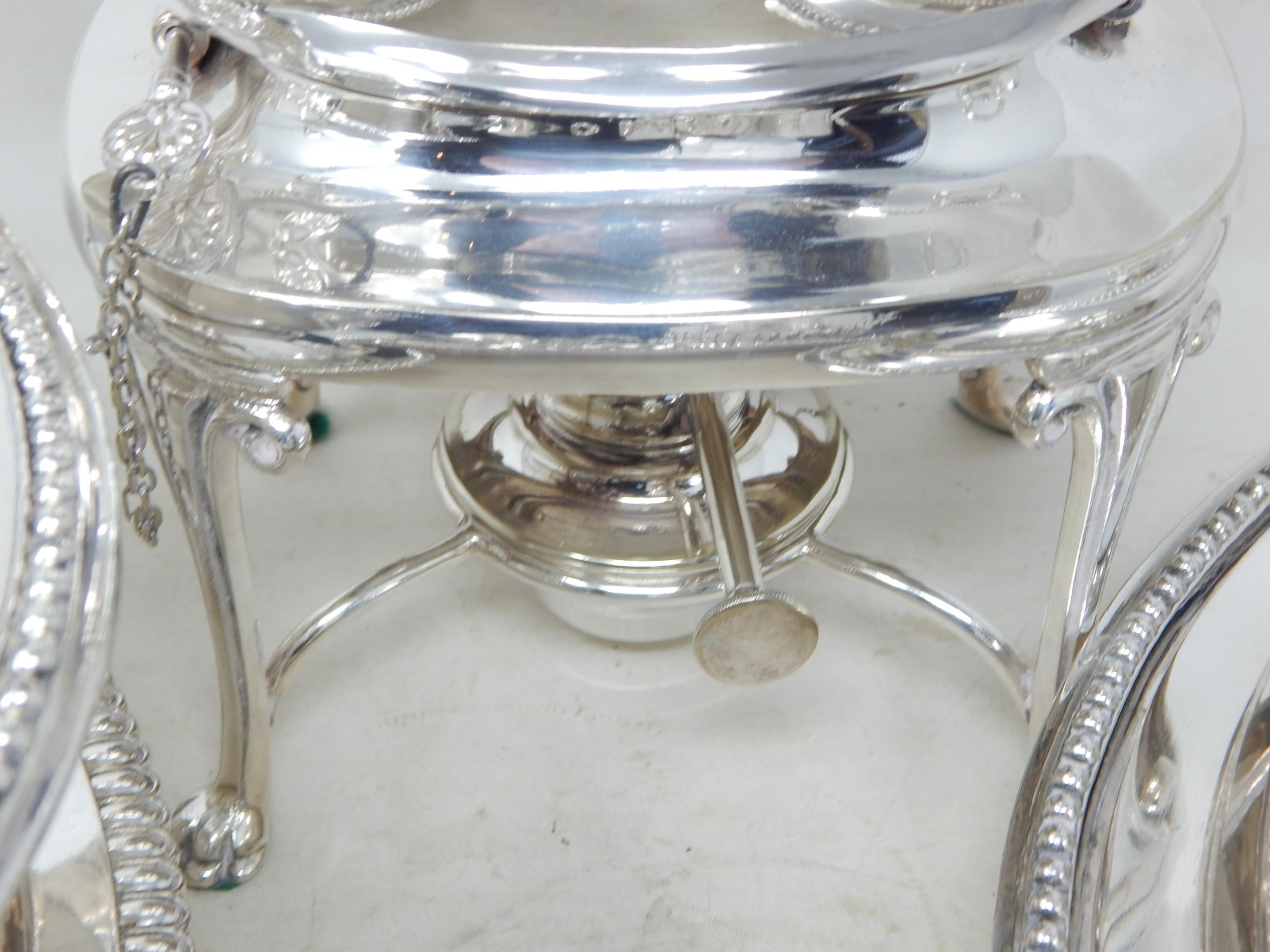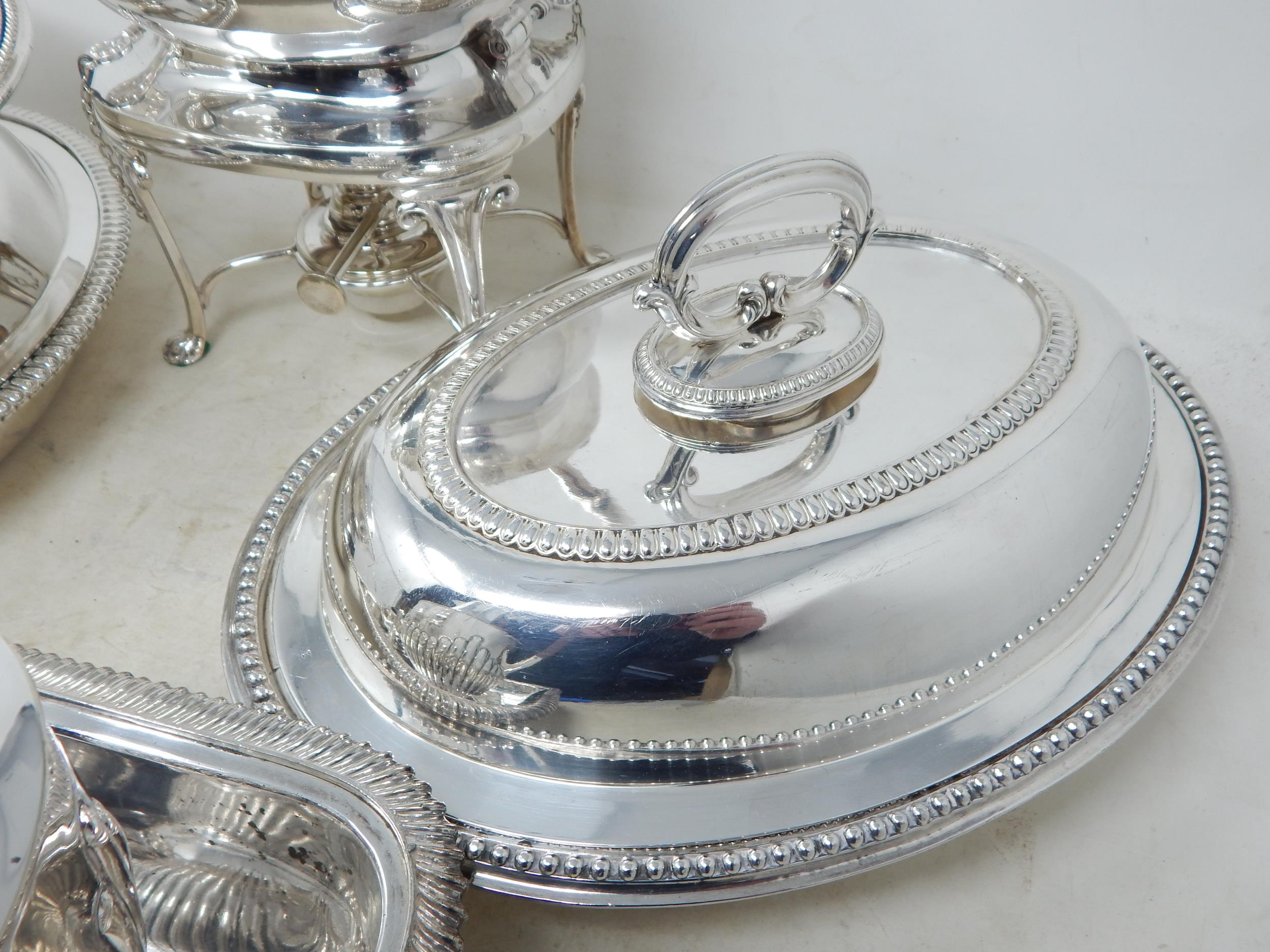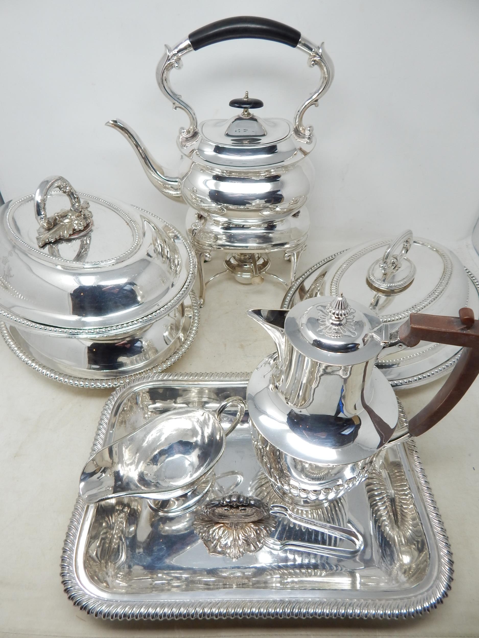 Quantity of 19th Century & Later Silver Plated Wares to Include a Tea Kettle on Stand with Burner, Entree Dishes etc (lot)