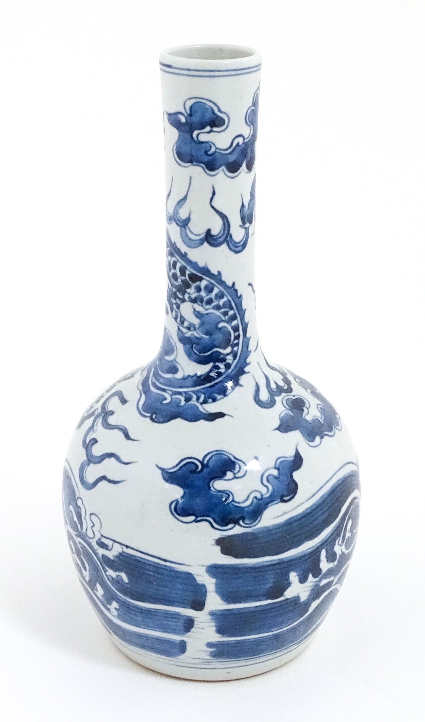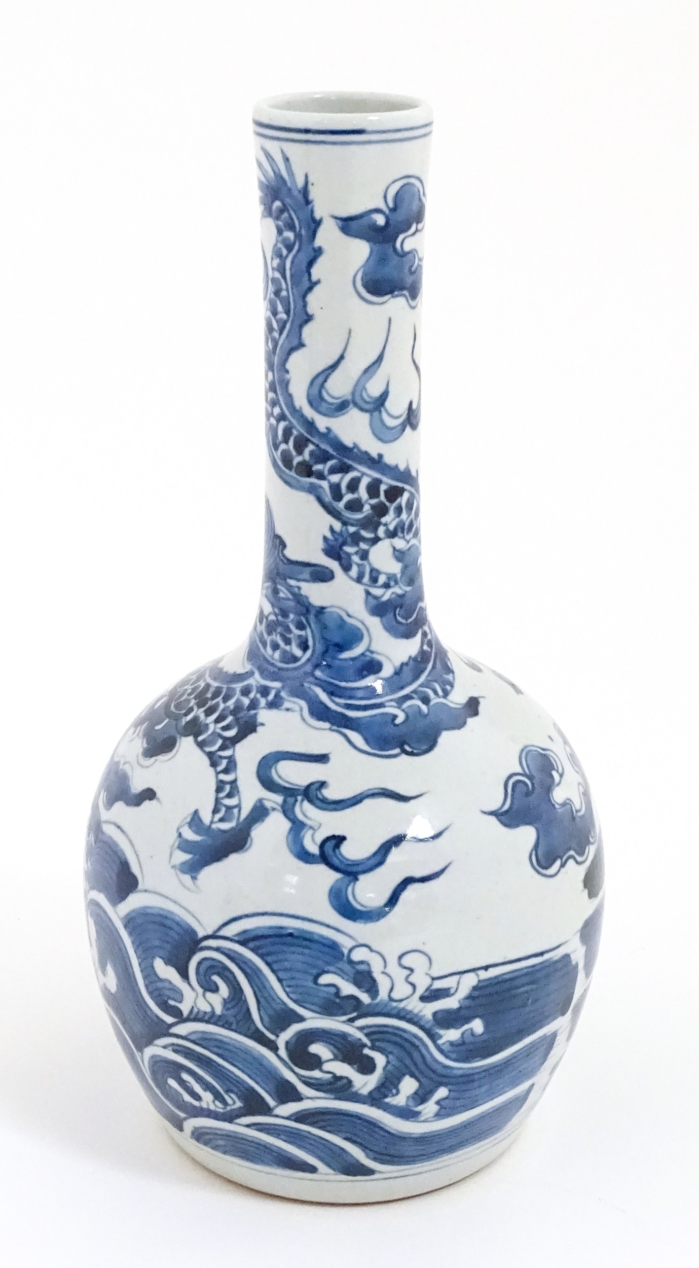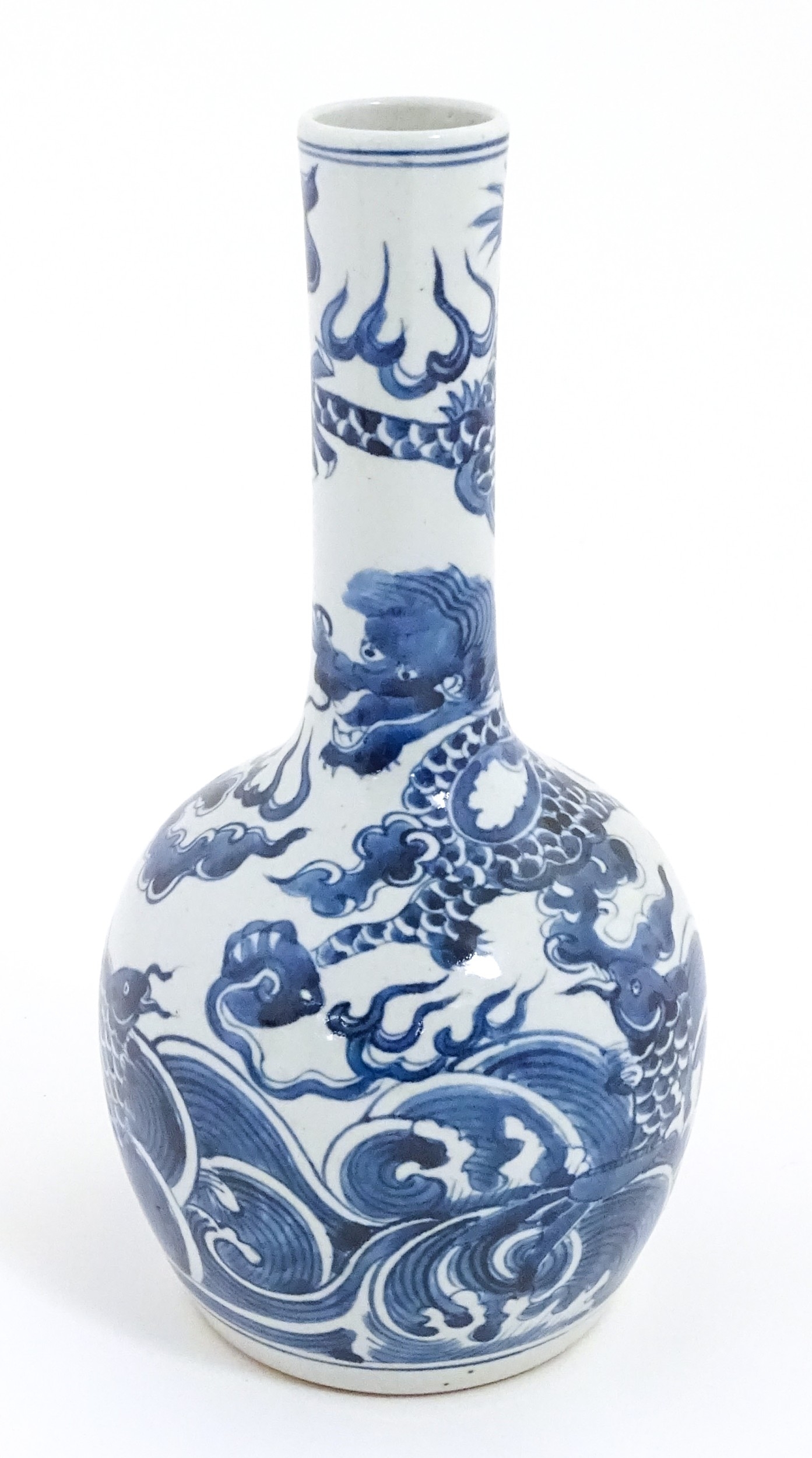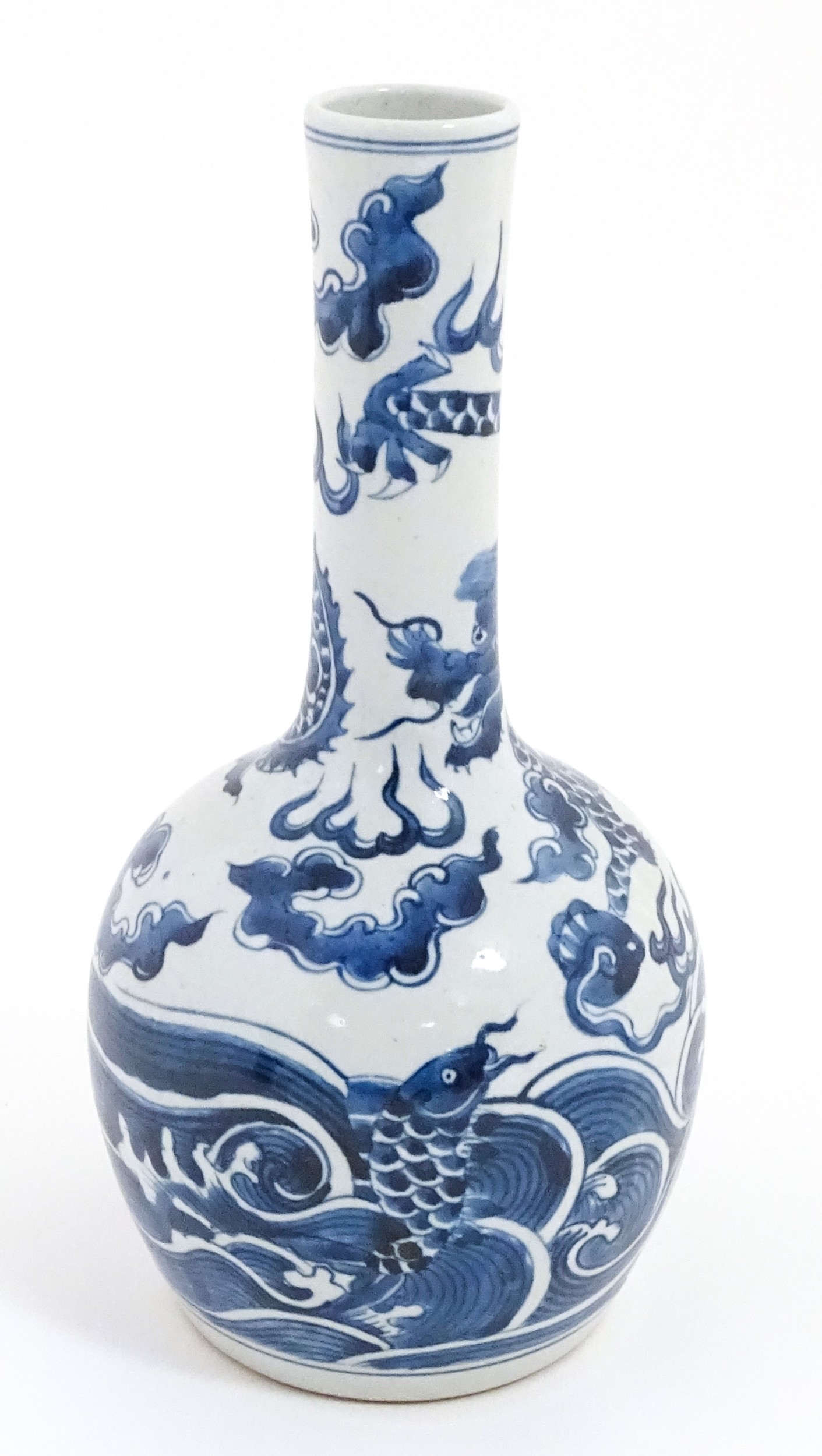 A Chinese blue and white vase decorated with a dragon above waves with fish. Character marks under. Approx. 10 1/2" high