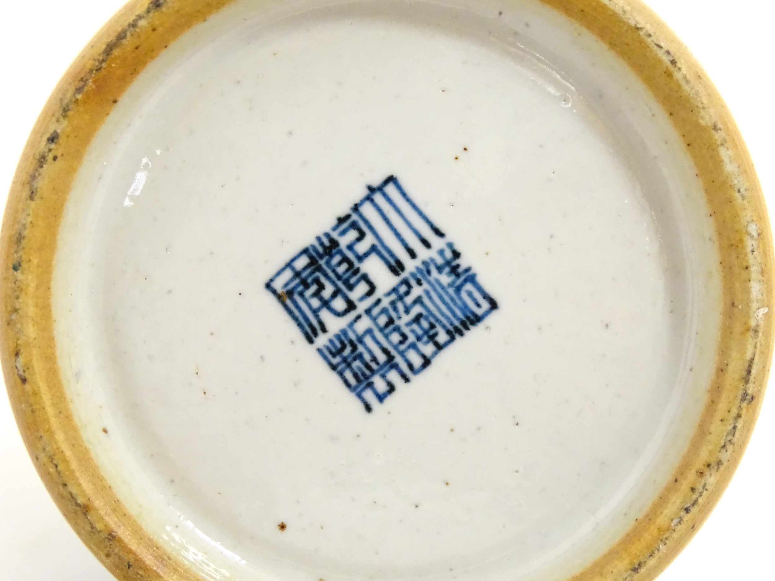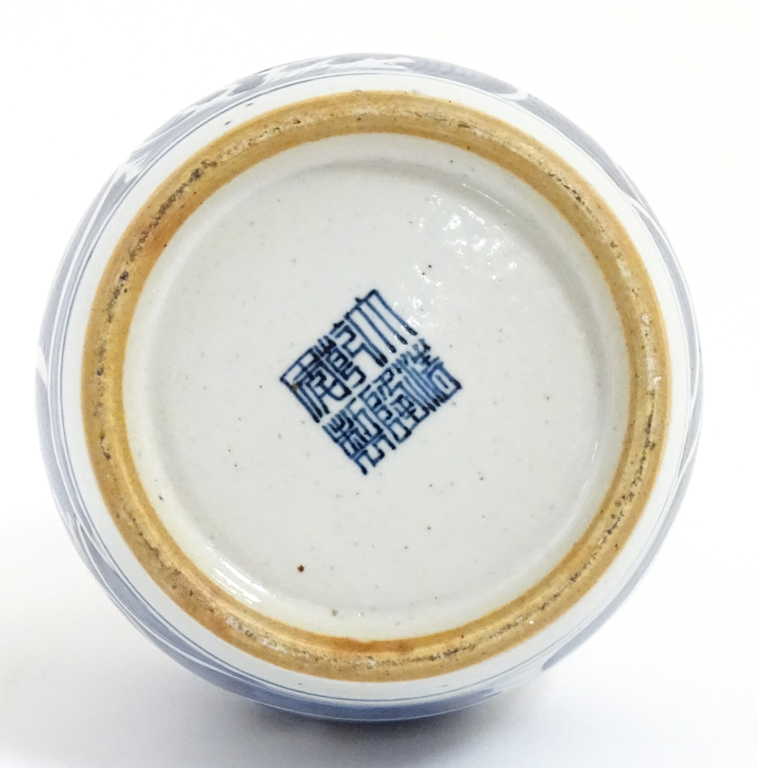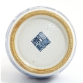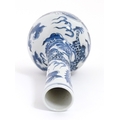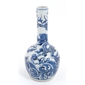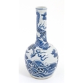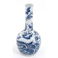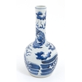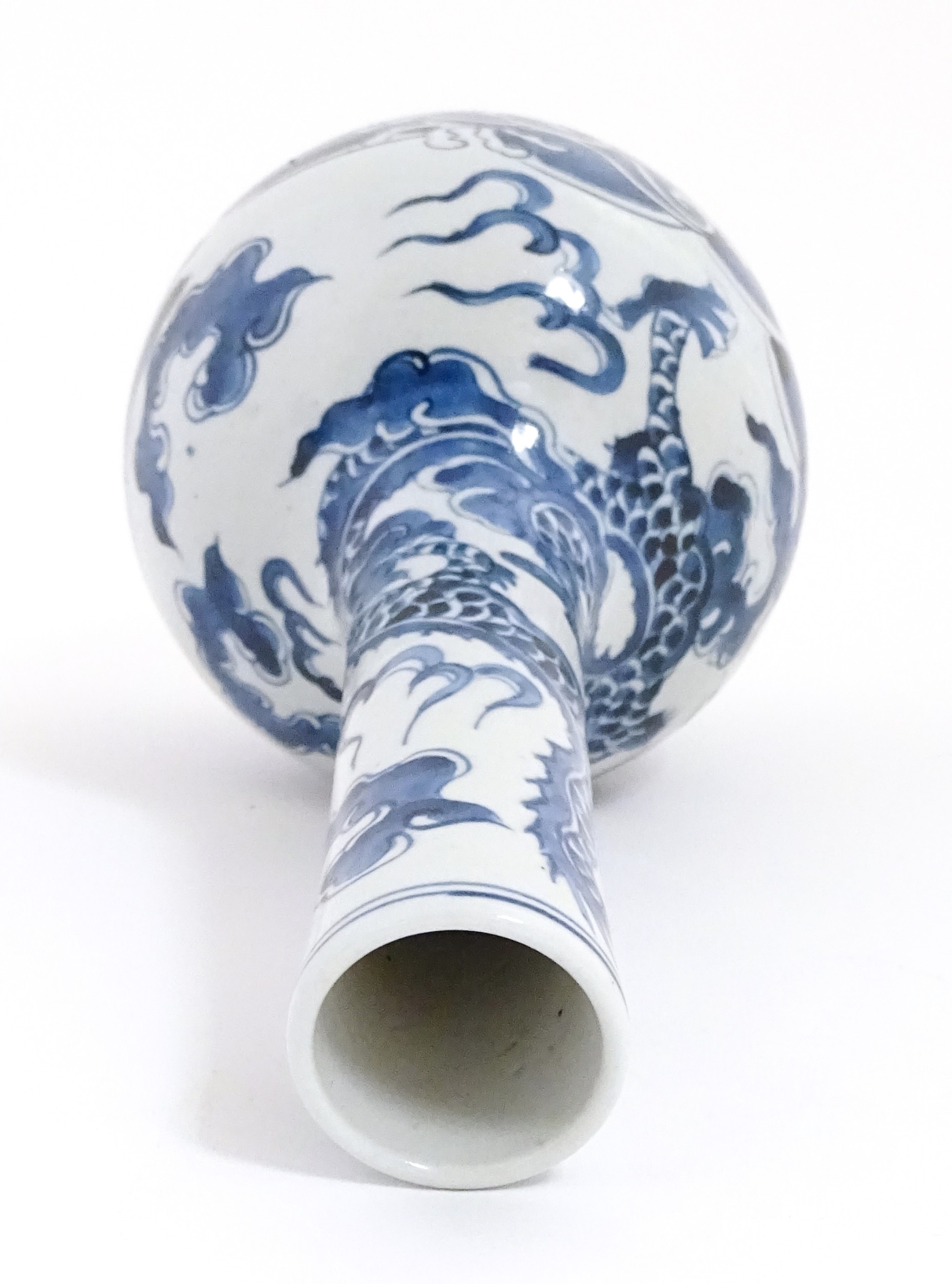 A Chinese blue and white vase decorated with a dragon above waves with fish. Character marks under. Approx. 10 1/2" high