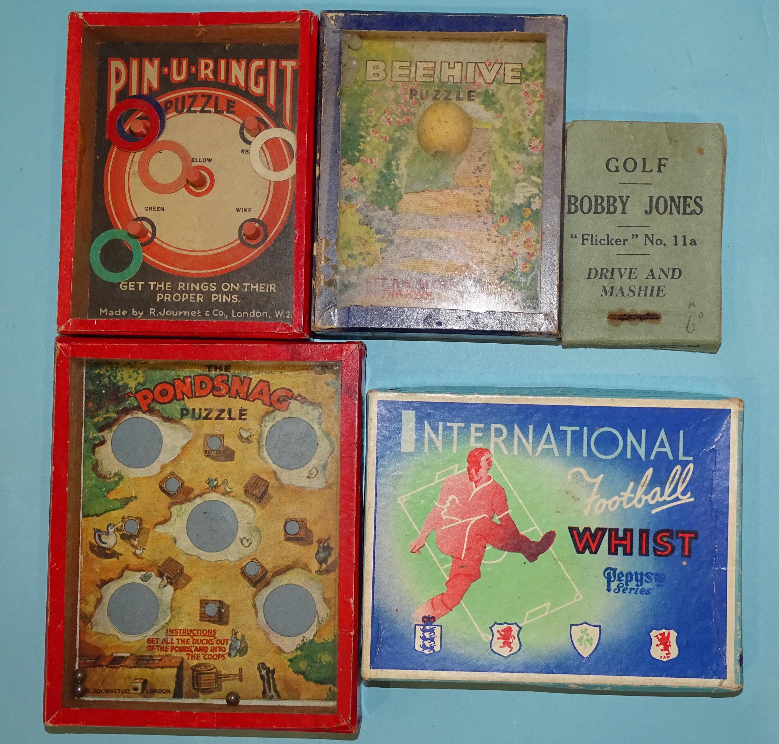 A "Flicker" No.11a book 'Golf, Bobby Jones, Drive and Mashie', three R Journet London puzzles: The Pondsnag', 'Pin-U-Ringit', 'Beehive' and a Pepys Series 'International Football Whist' game, (5).