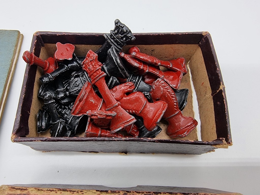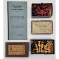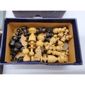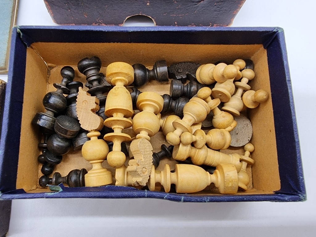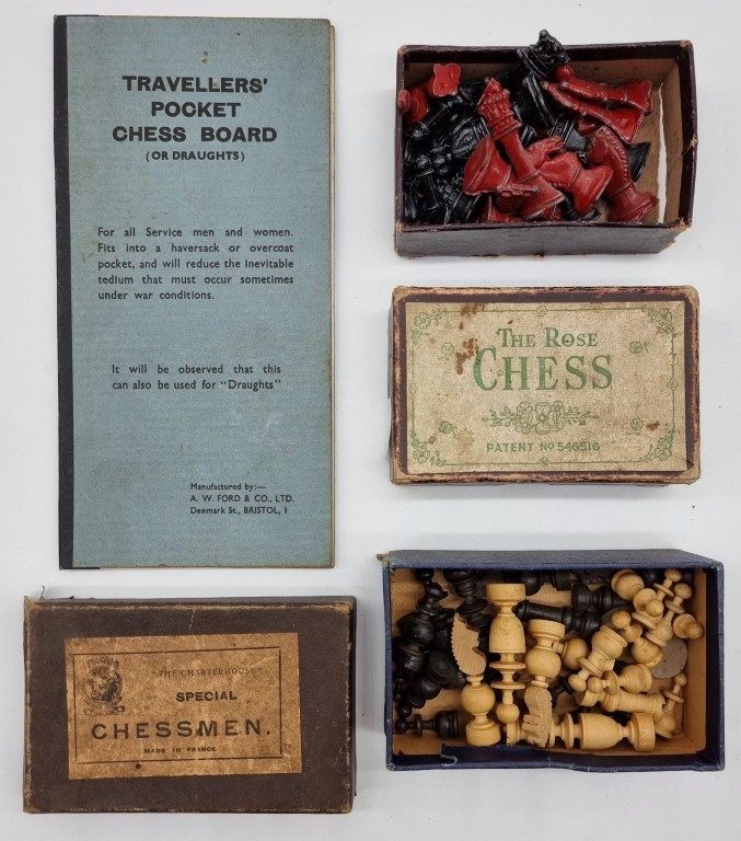A boxed set of 'The Charterhouse Special' boxwood and ebonized 'Chessmen', king 5.5cm, pawn 2.5cm, (lacking one black pawn); together with another boxed 'The Rose' painted metal chess set, king 5cm, pawn 2.8cm.