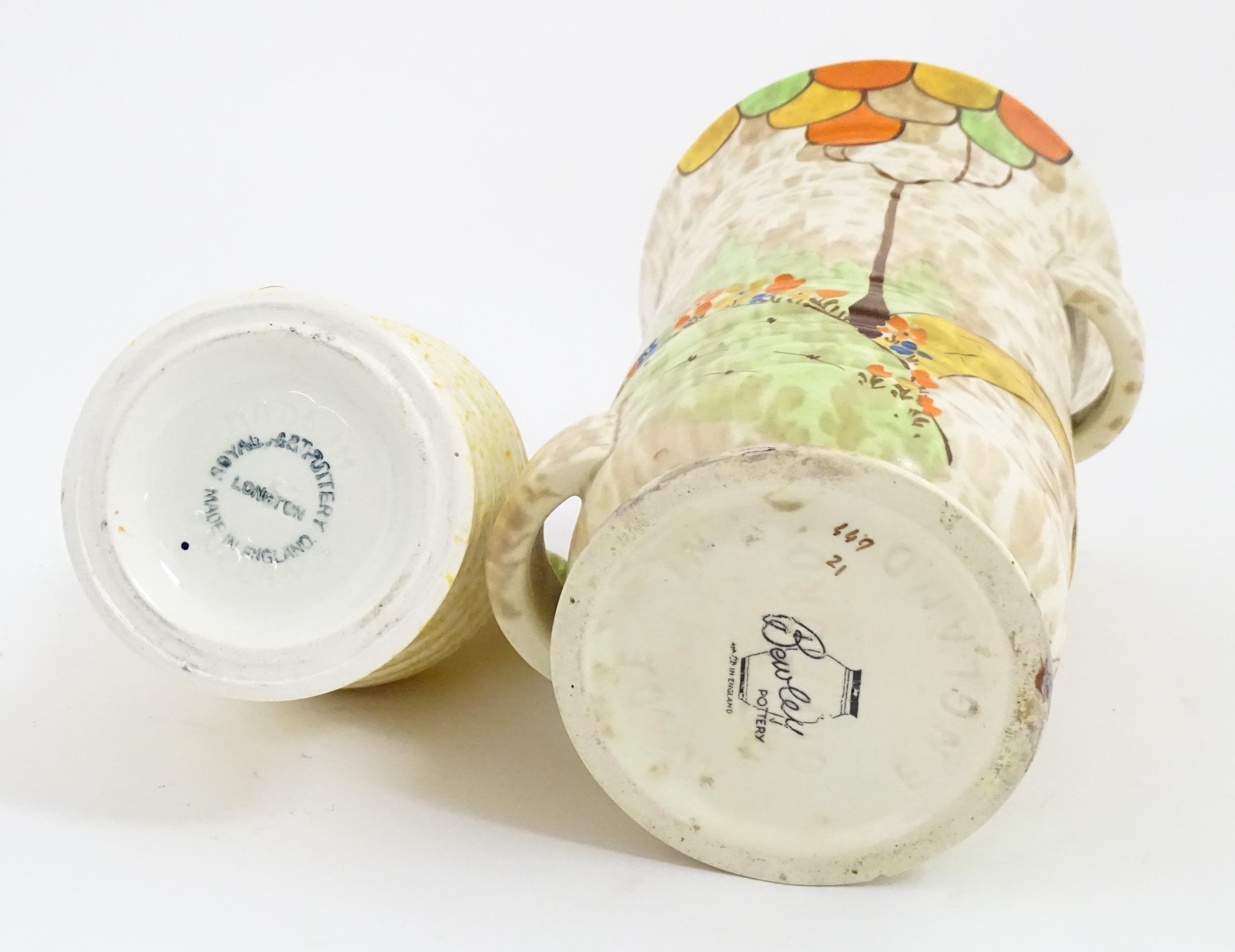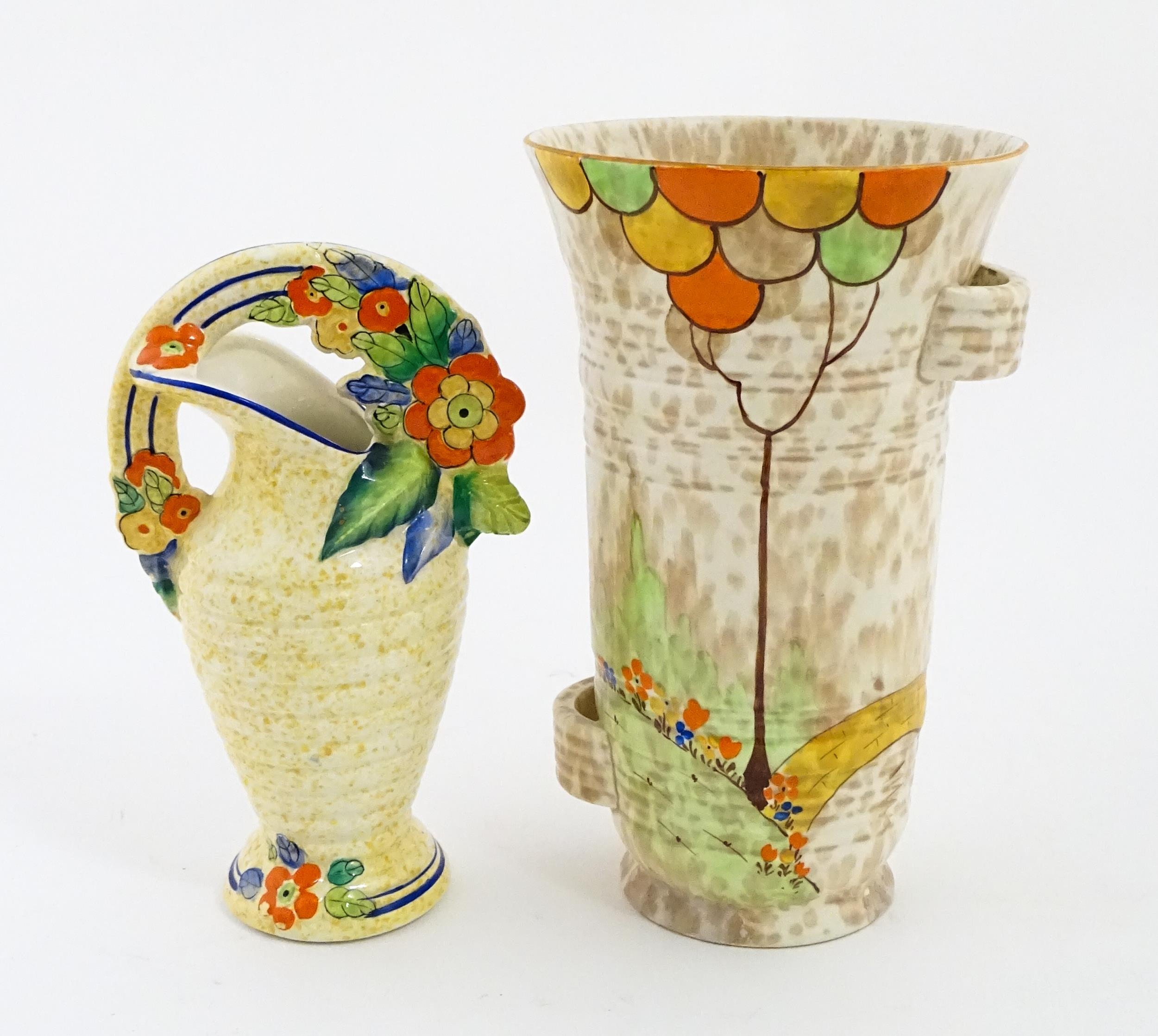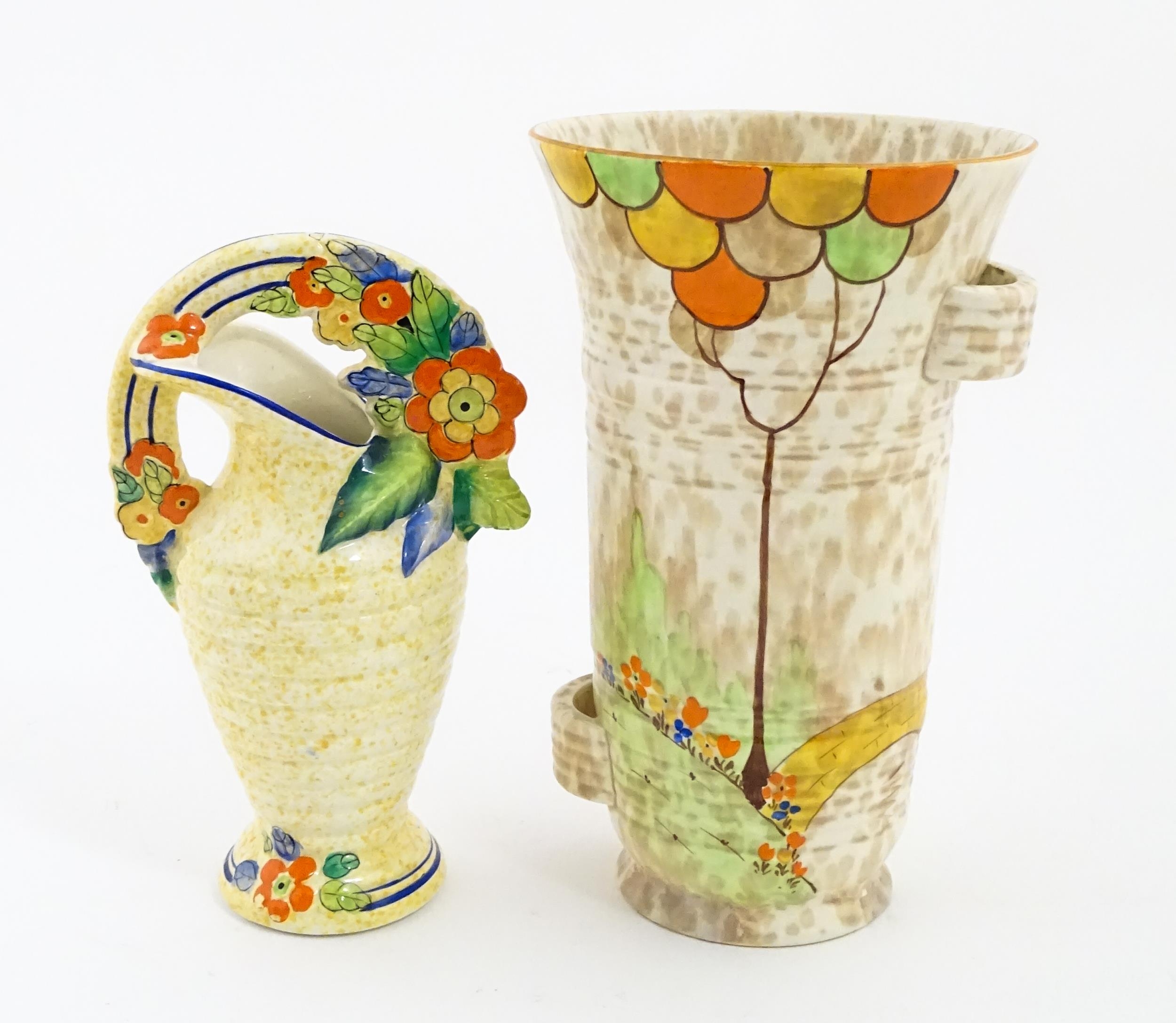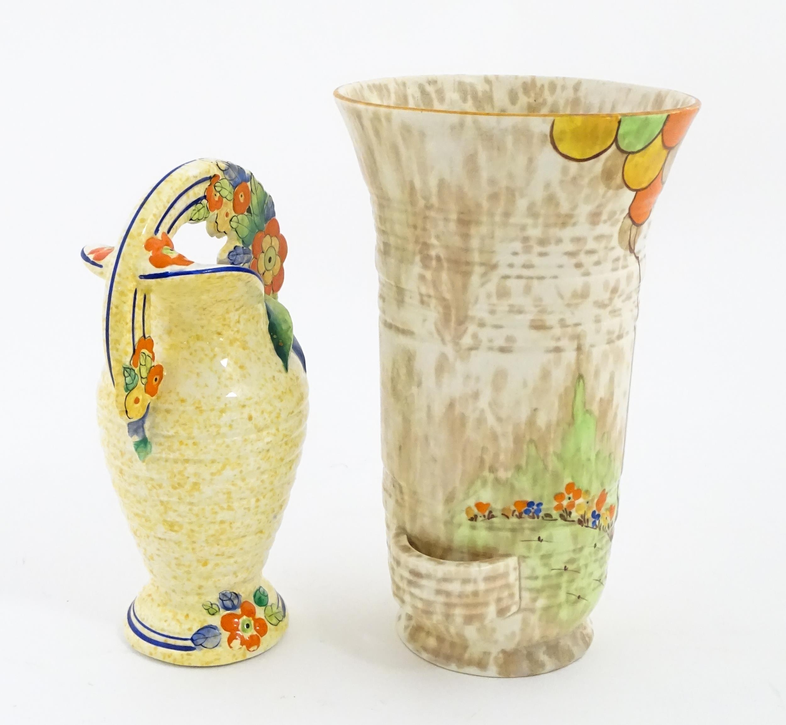 A Bewley Pottery Art Deco vase of flared form with hand painted landscape decoration, in the manner of Clarice Cliff. Marked under and numbered 449 / 21. Together with an Art Deco jug with ribbed body and flower decoration. Marked under. Largest Approx. 10 1/2" high