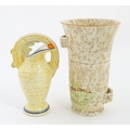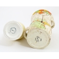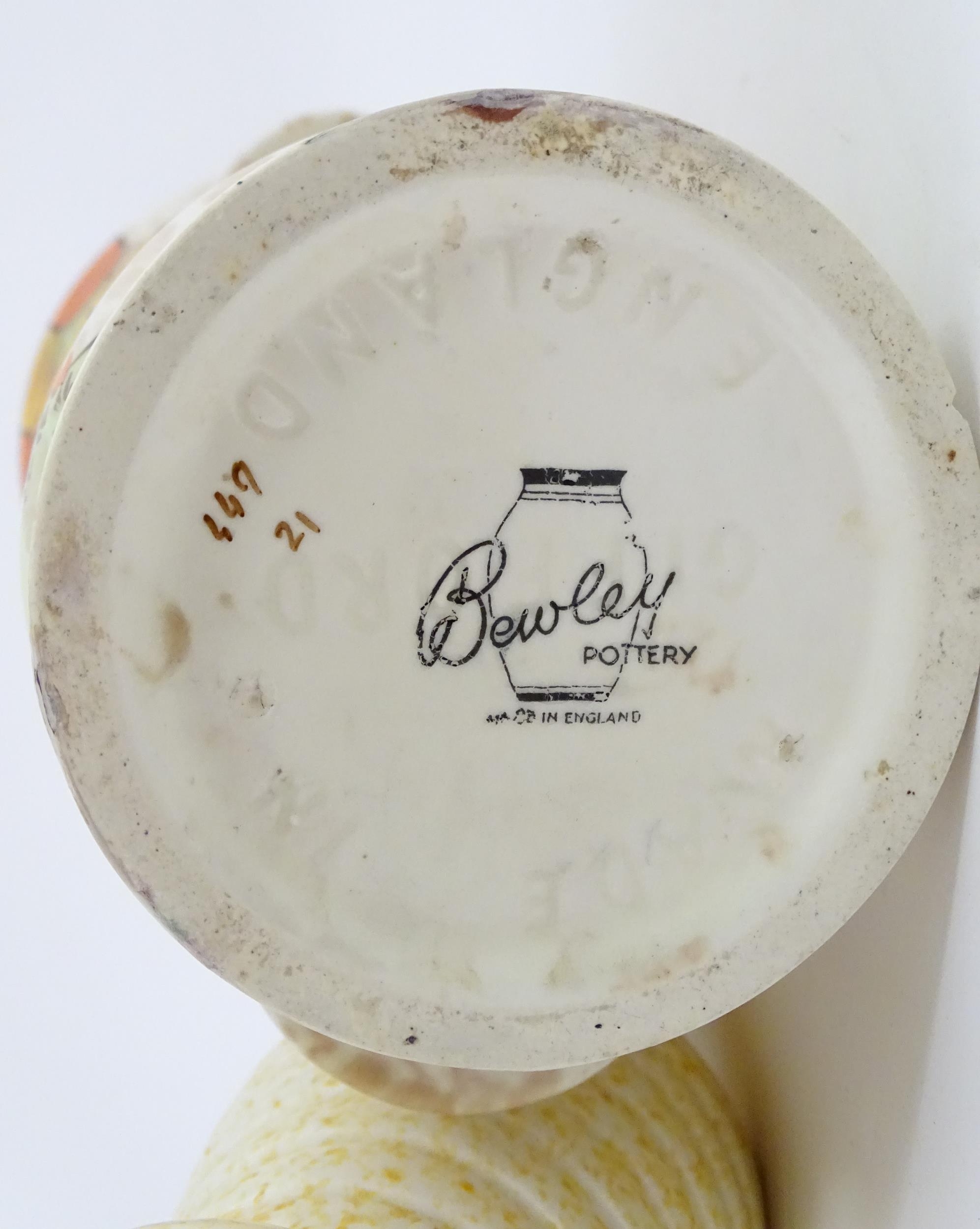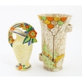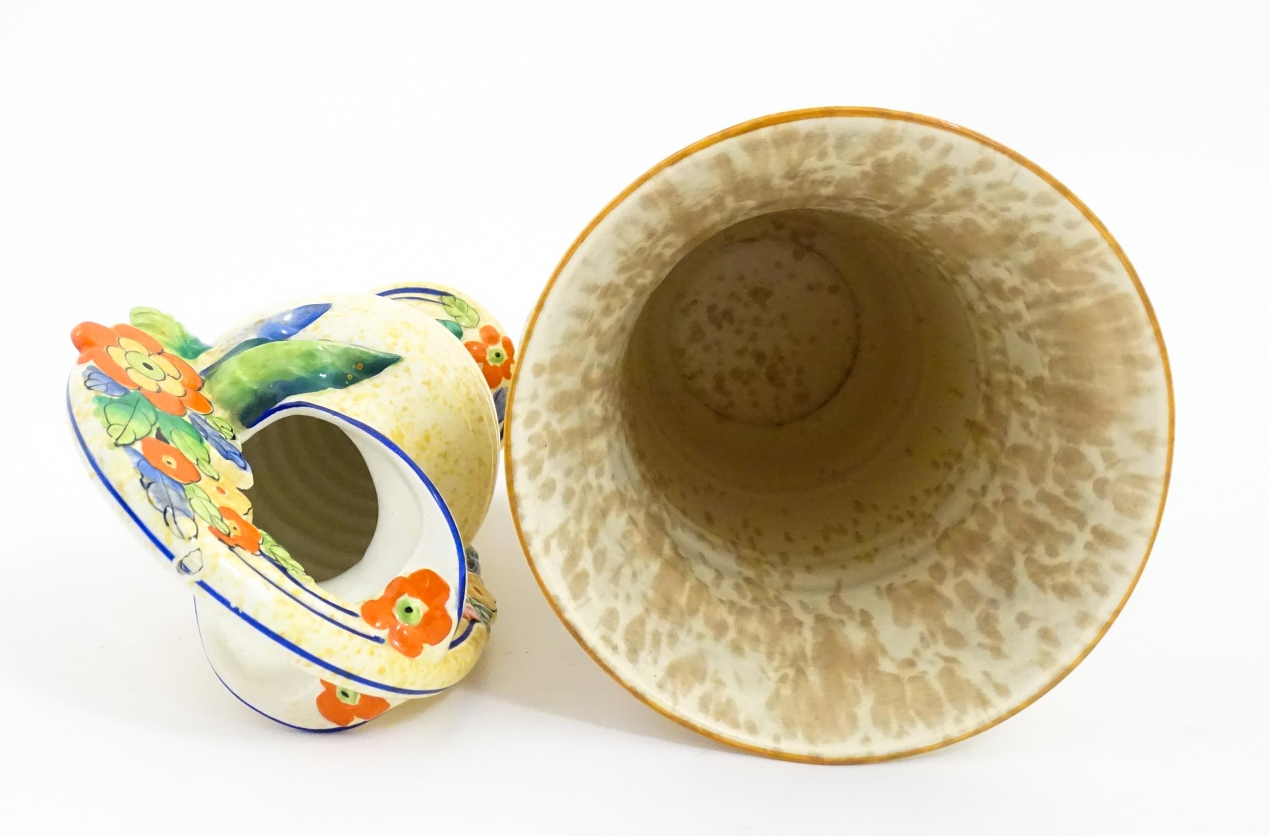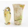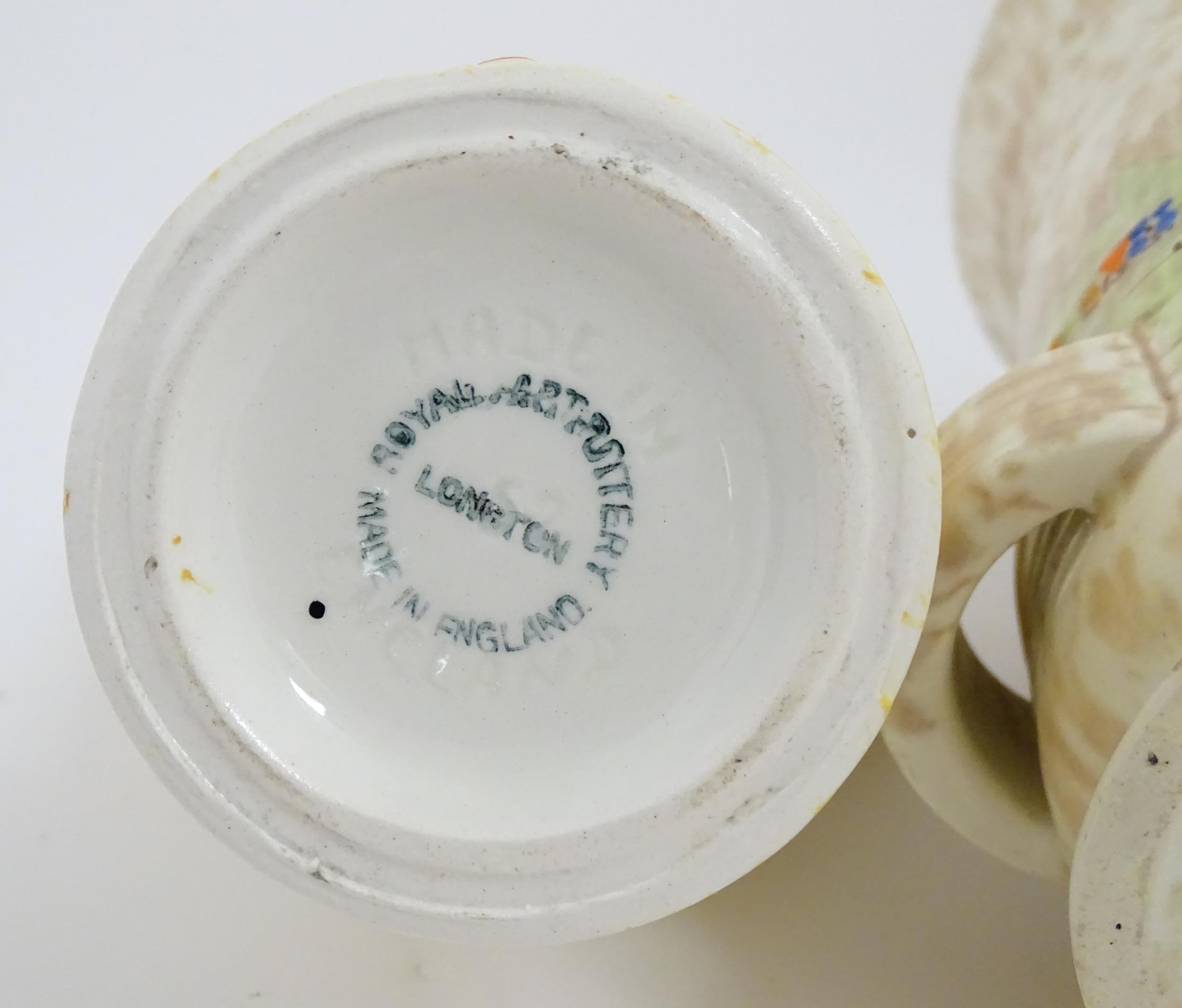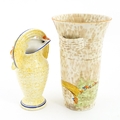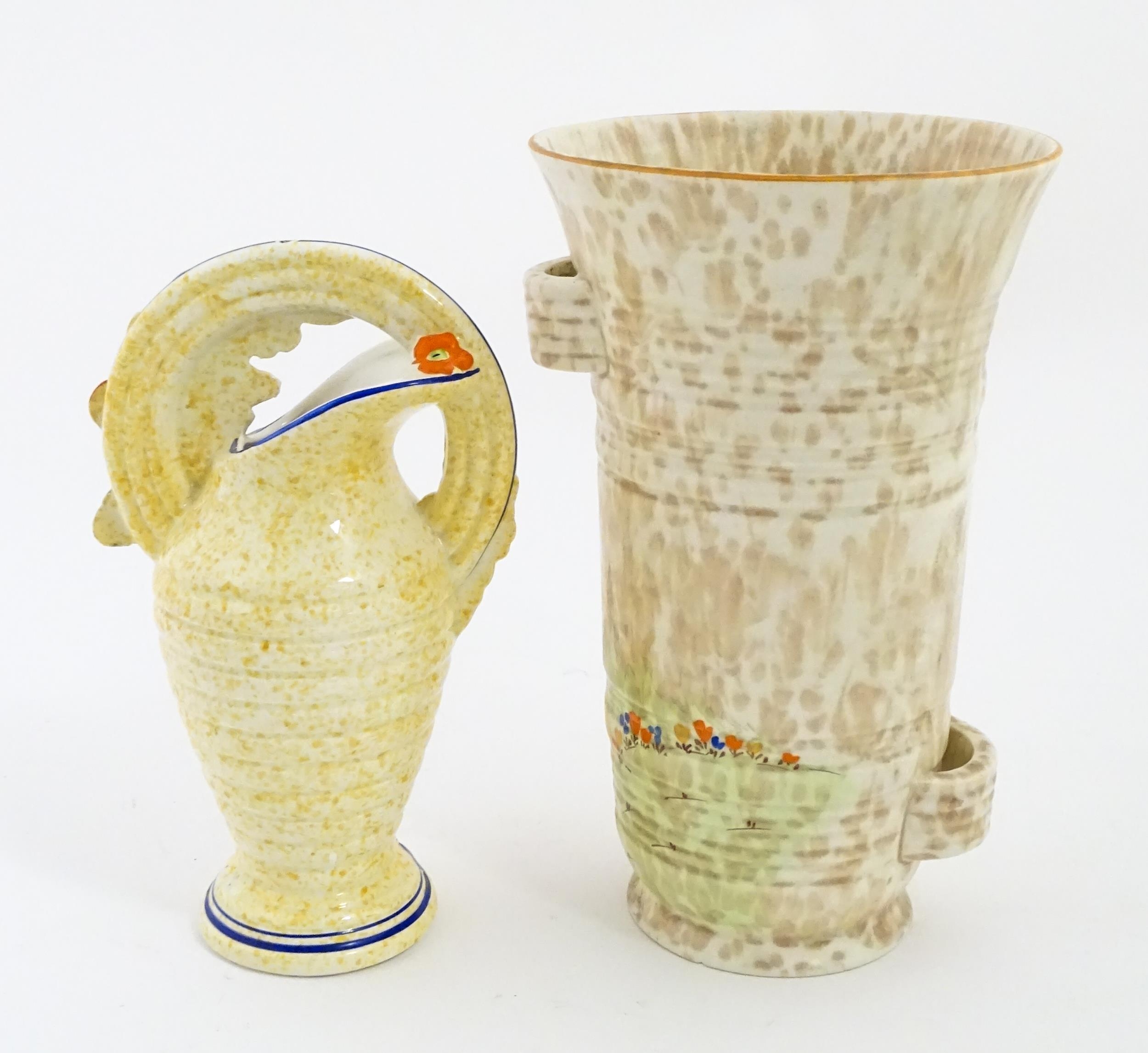 A Bewley Pottery Art Deco vase of flared form with hand painted landscape decoration, in the manner of Clarice Cliff. Marked under and numbered 449 / 21. Together with an Art Deco jug with ribbed body and flower decoration. Marked under. Largest Approx. 10 1/2" high