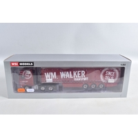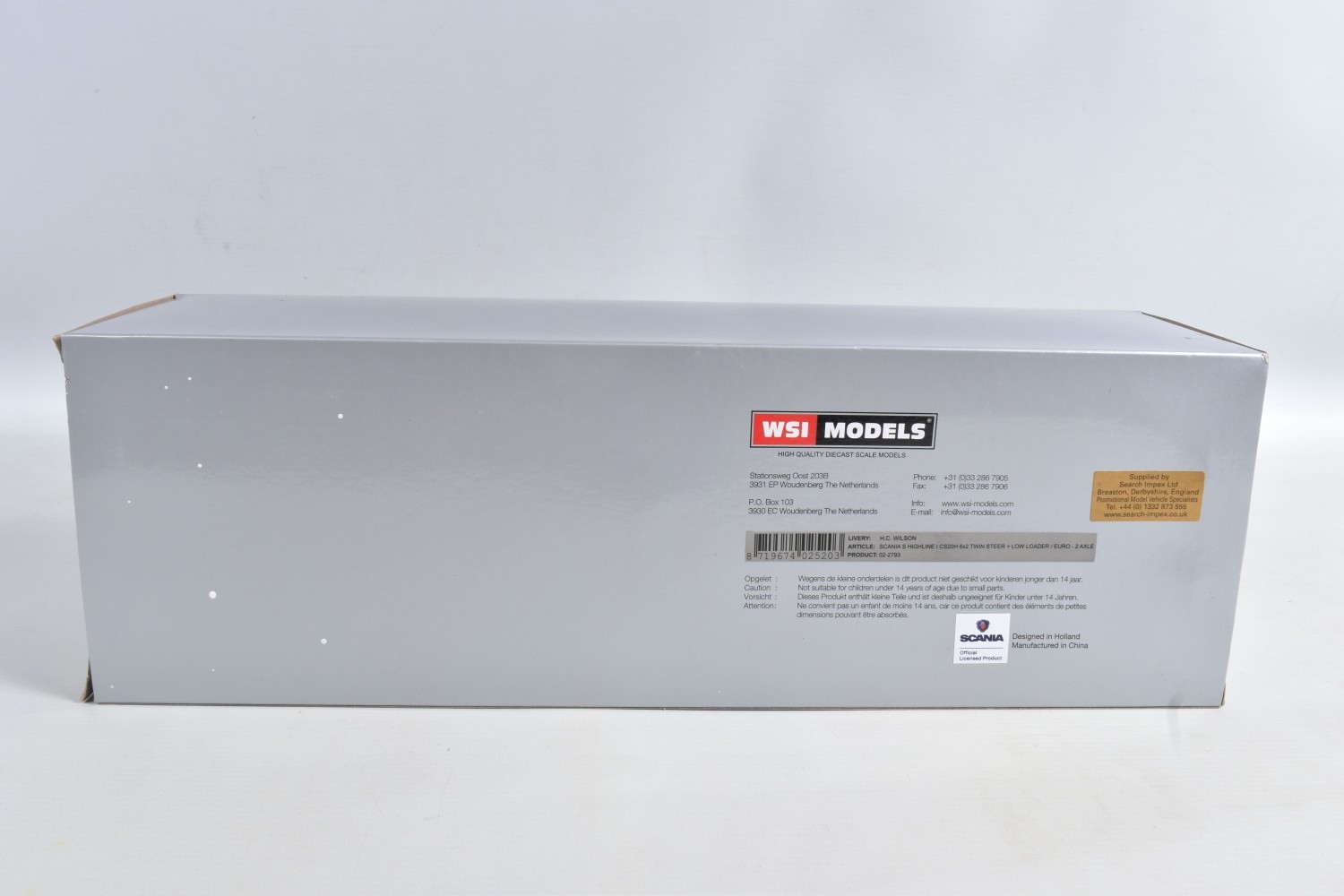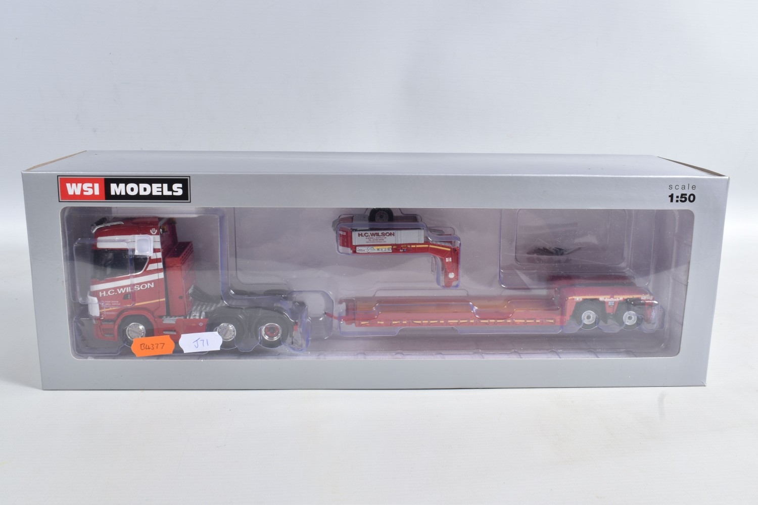 A BOXED WSI MODELS SCANIA S HIGHLINE I CS20H 6x2 TWIN STEER + LOW LOADER/EURO 2 AXLE - H.C. WILSON, No.02-2793, 1/50 scale, limited edition with Certificate of Authenticity No.131 of 205, booklet and unattached accessories, appears largely complete and in very good condition, box complete but has some minor damage, marking and wear