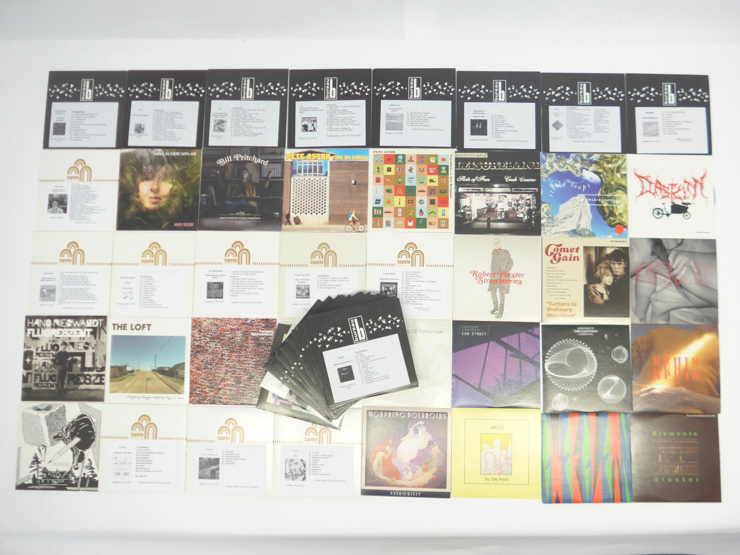 Krautrock / Ambient / Electronic / Indie - A collection of sixty-two promo CD albums on the Tapete and Bureau B labels, artists to include Faust, Moebius, Martin Rev, Tolouse Low Trax, Pyrolator, Karl Bartos, Von Spar, Qluster, CEL, Tin Man, Saeko Killy, S.Y.P.H., Kreidler, Hans Nieswandt, The Loft, Das Kinn, Robert Forster, Comet Gain, Die Wilde Jagd, Datashock, Conrad Schnitzler & Ball & Mortimer, The Telescopes, Amy Rigby, Bill Pritchard, Pete Astor, Wreckless Eric, unhappybirthday, Robocop Kraus, Foyer Des Arts, Eat-Girls, Gunter Schickert, Chickiss, Krishna Goineau, Jimi Tenor, Heiko Maile & Julian Demarre, Supersempfft, Station 17, Conrad Schnitzler & Ken Montgomery, Harald Grosskopf, Die Welttraumforscher, Heldon, Richard Pinhas, Harmonious Thelonius, Neuzeitliche Bodenbelage, Silberstreif (62)