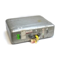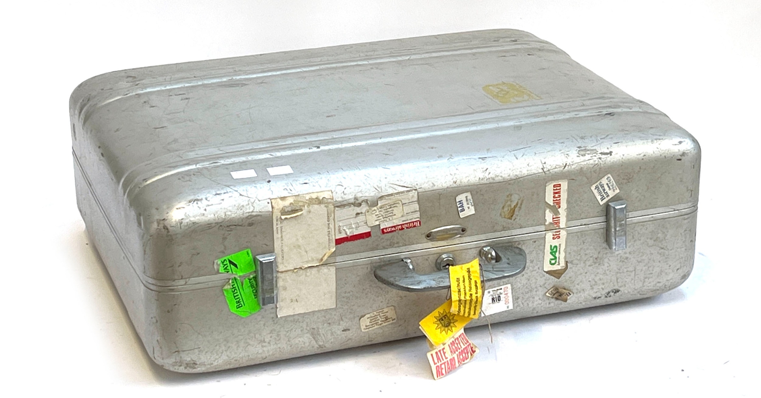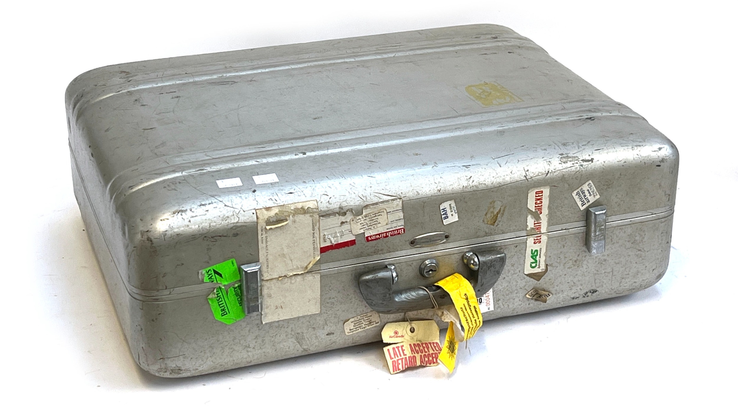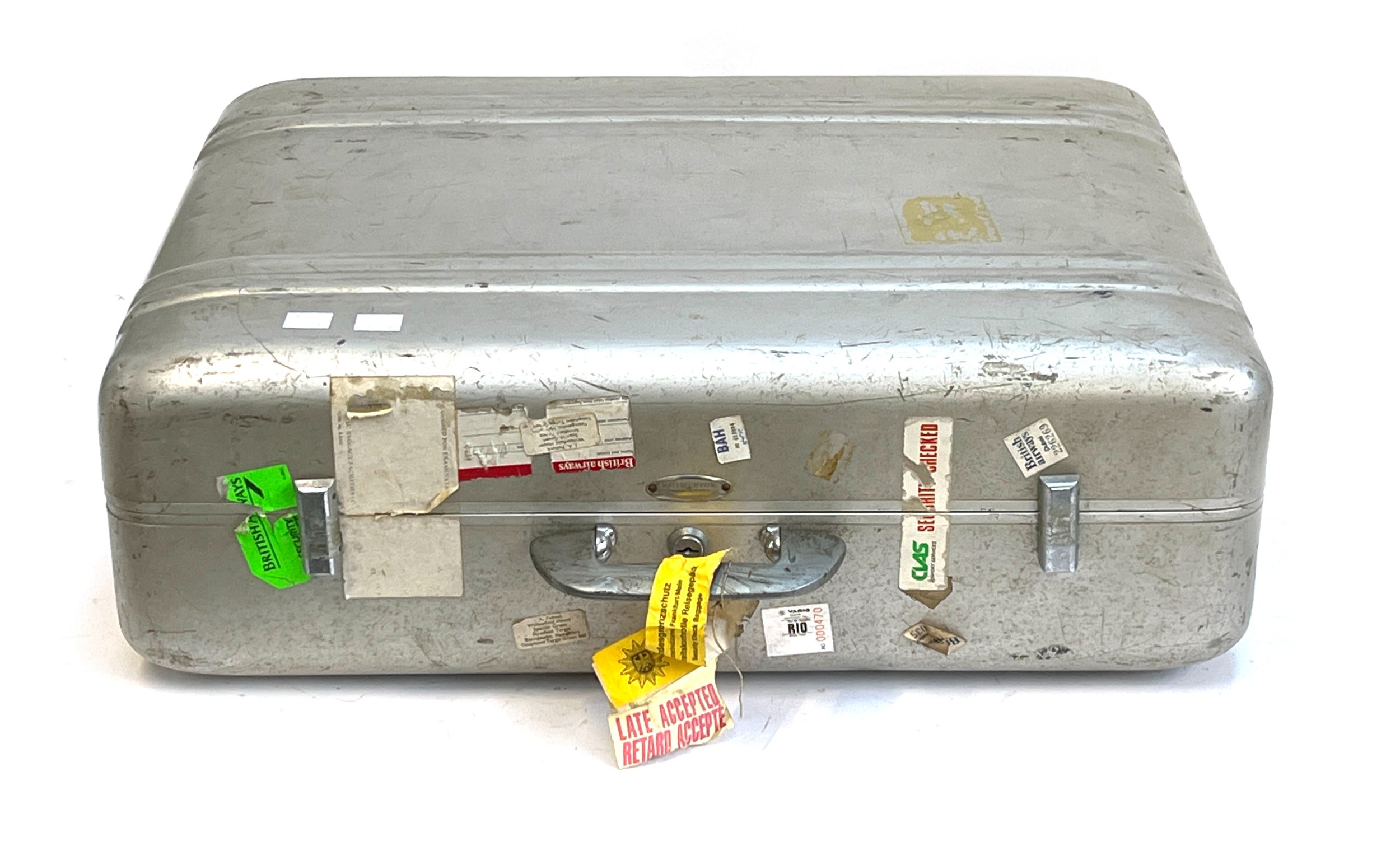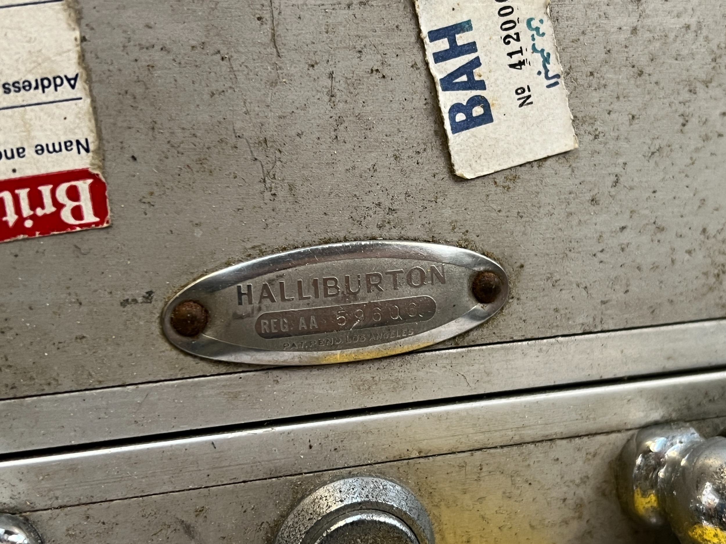 A vintage 1950s Halliburton aluminium suitcase, with travel stickers, 61cm wide
