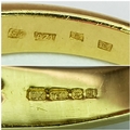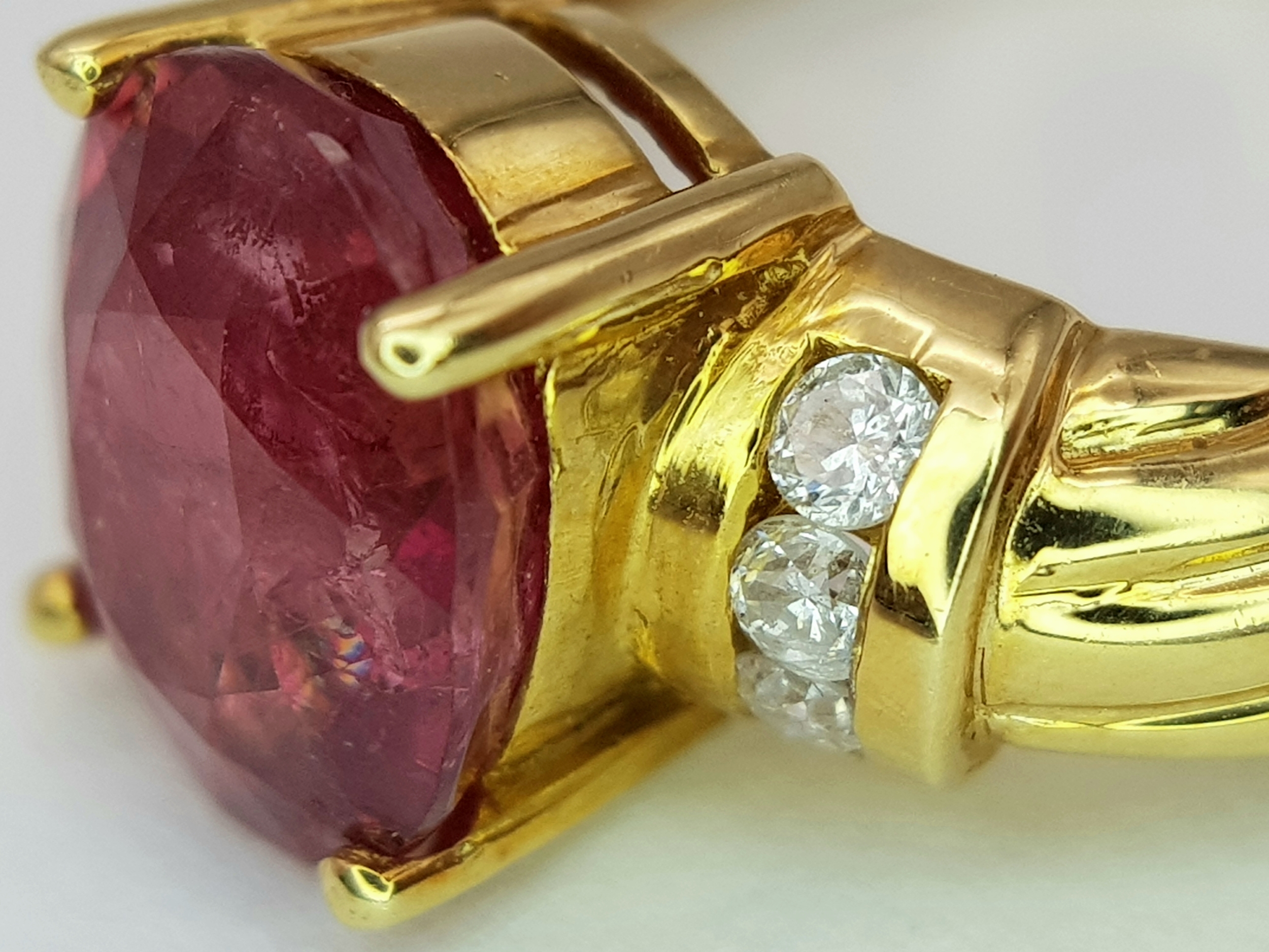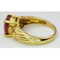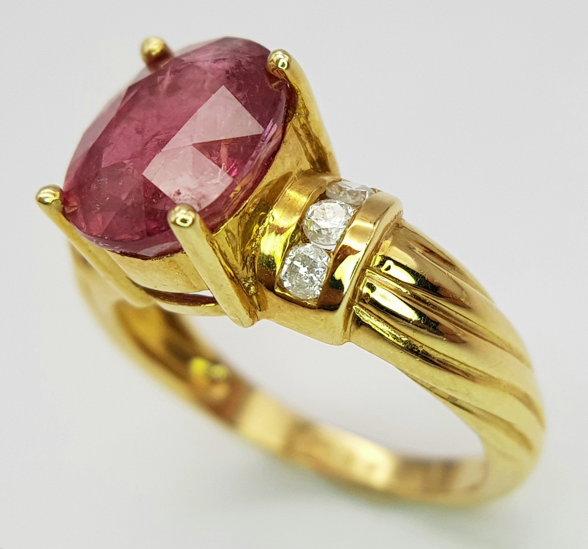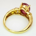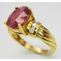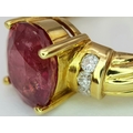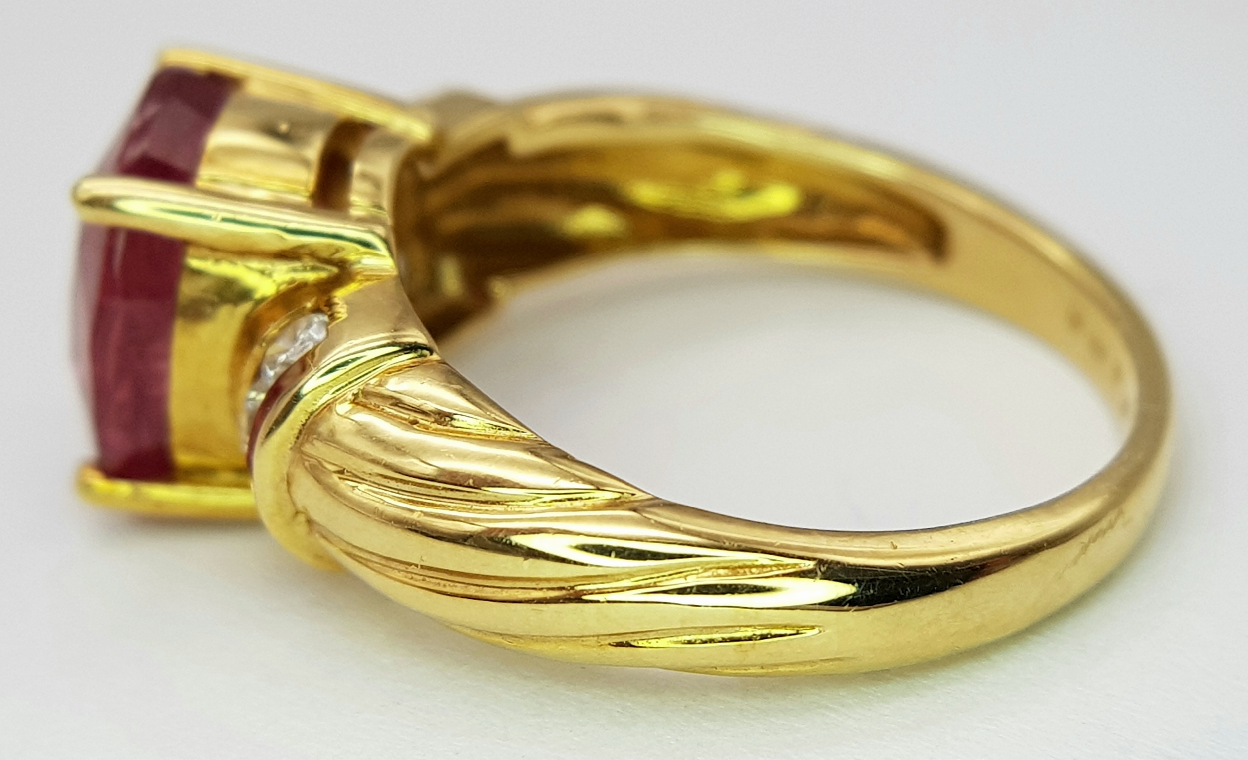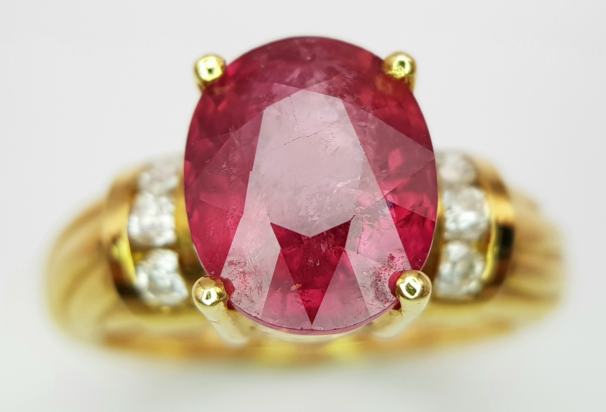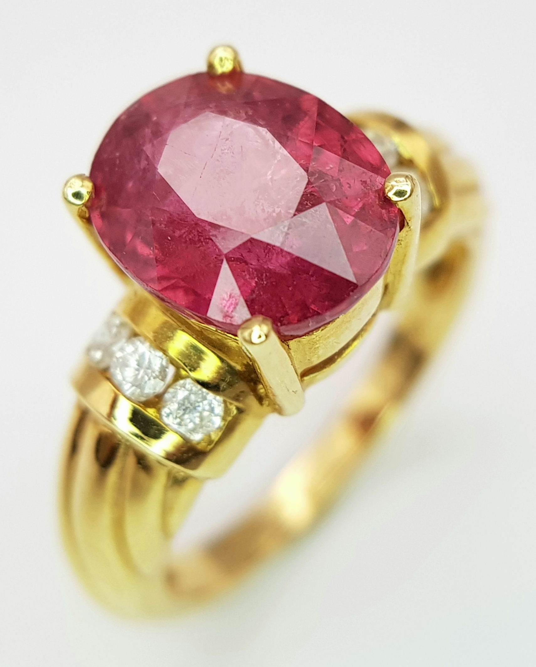 An 18K Yellow Gold Ruby and Diamond Ring. A Natural, Unheated 2ct oval cut ruby with six round brilliant cut diamond accents - c. 020ctw. Size N 1/2. 6.17g.