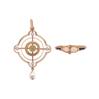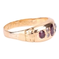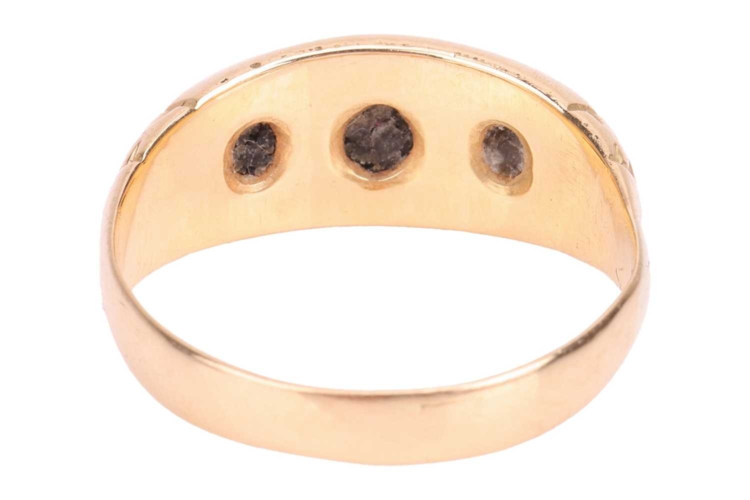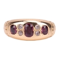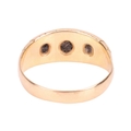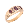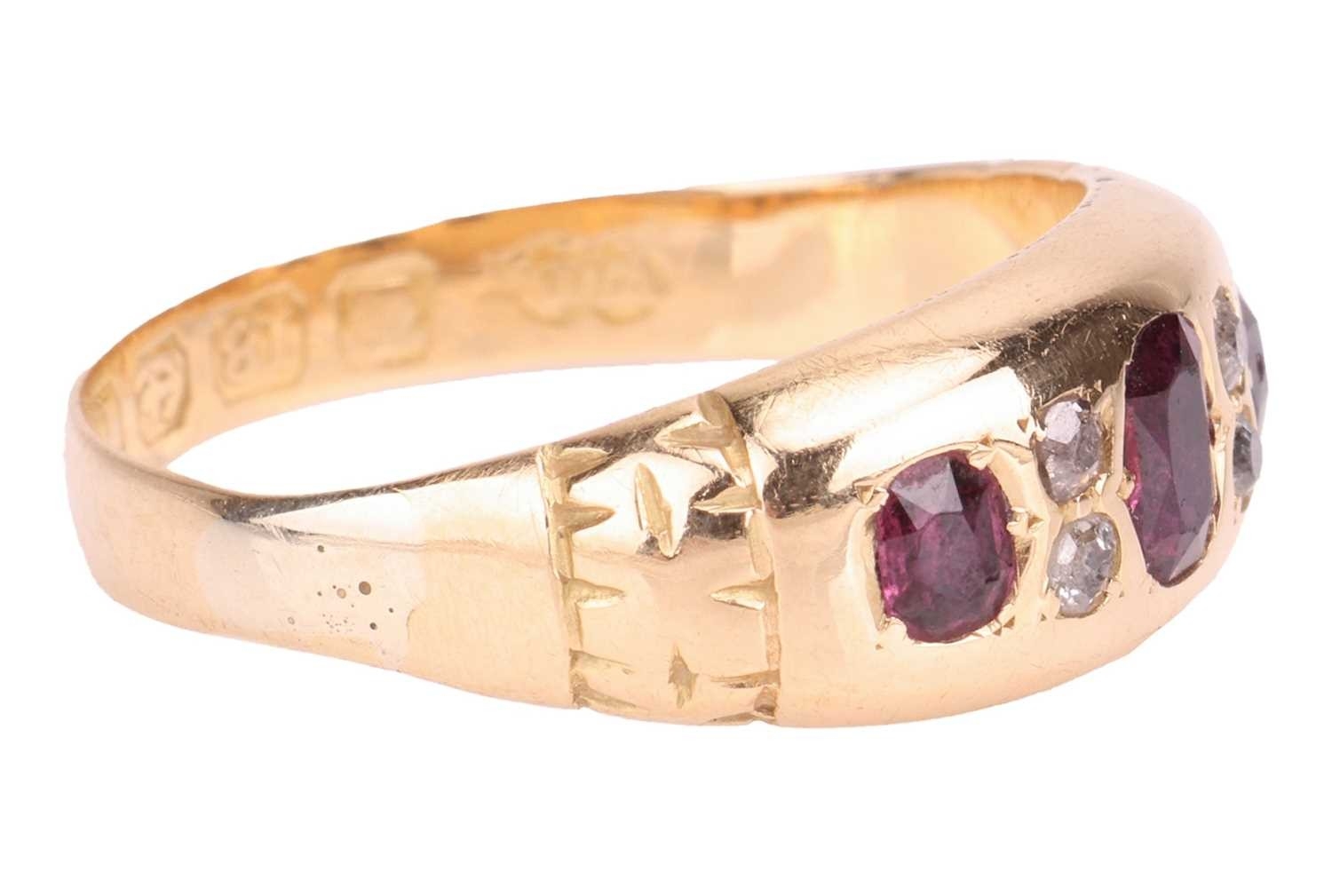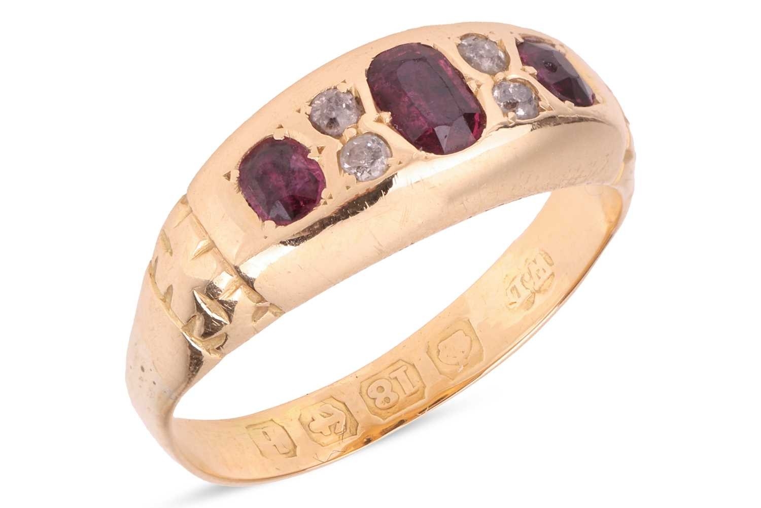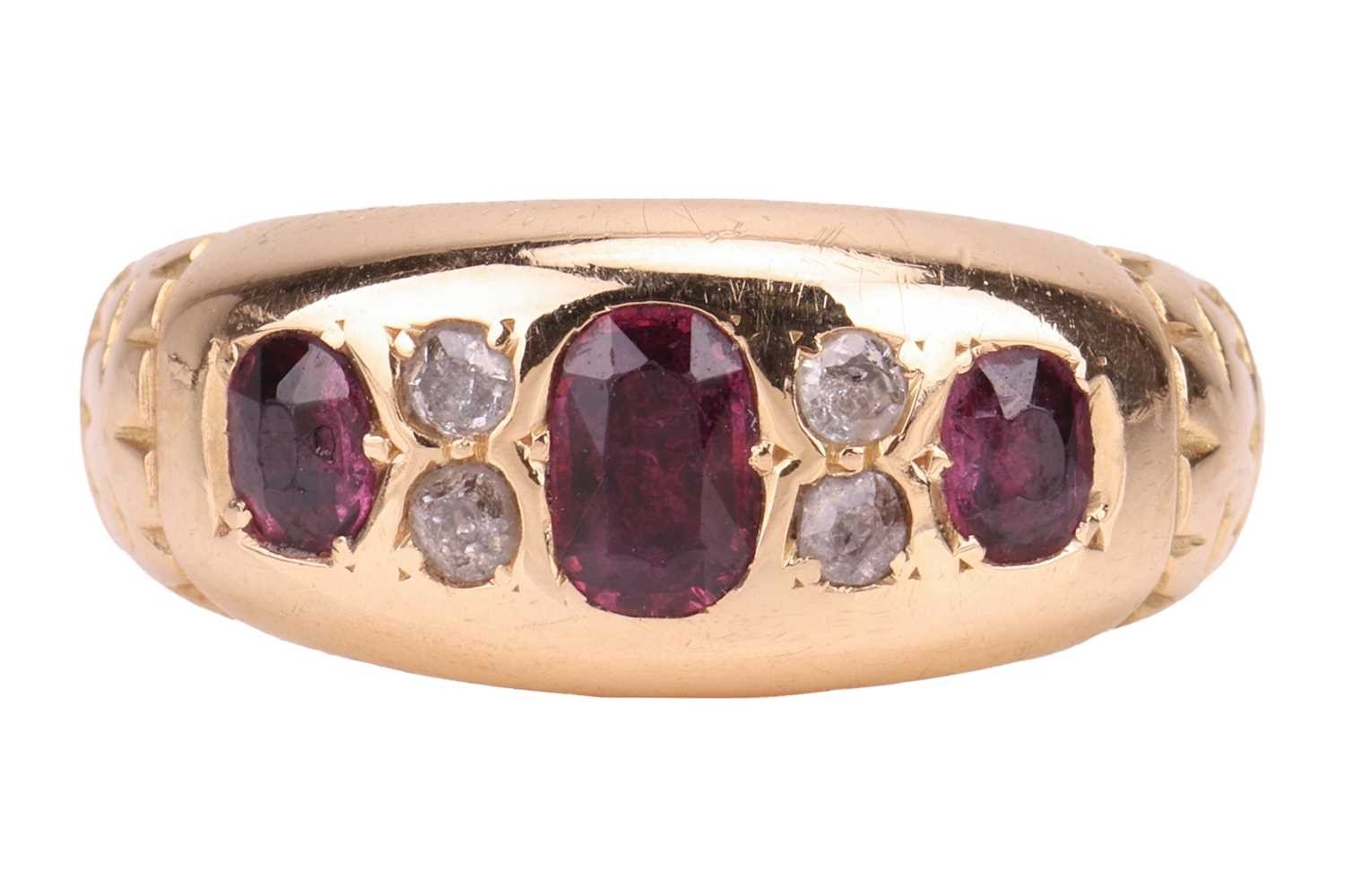 A ruby and diamond half hoop ring in 18ct gold, comprising three graduated cushion-cut rubies, flanked by four diamond accents, Birmingham 1907, size N, 3.5 grams.
