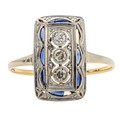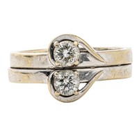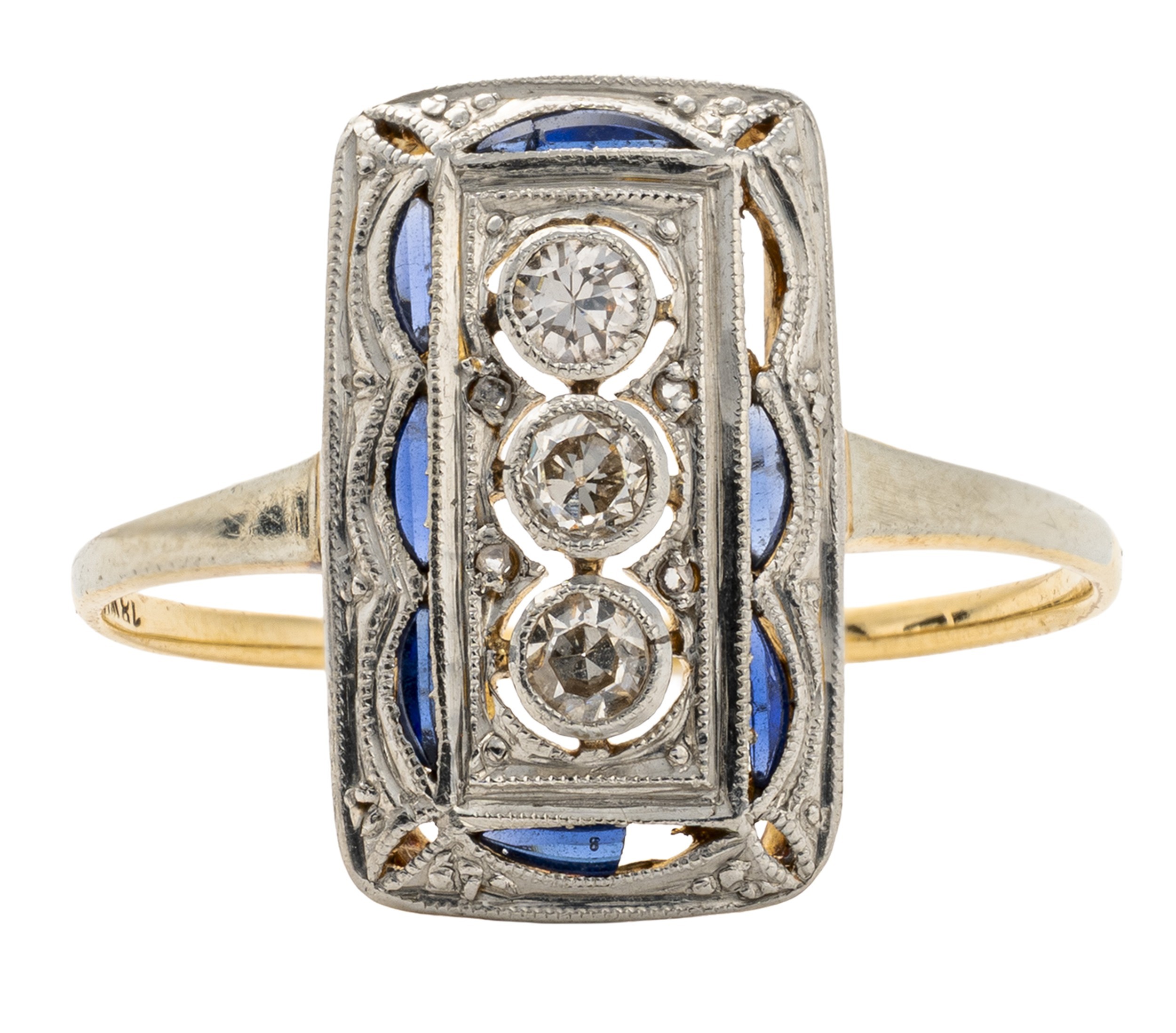 Bezel set to the centre with 3 round brilliant cut diamonds weighing 0.28 carats, colour H, clarity VS, in 18ct yellow and white gold, size K, 2,1g all in, distress