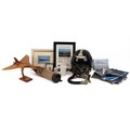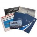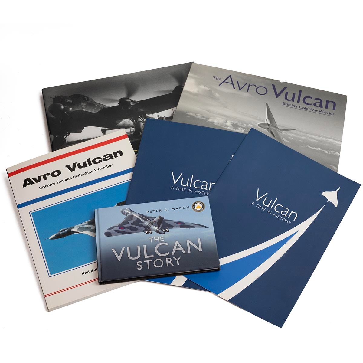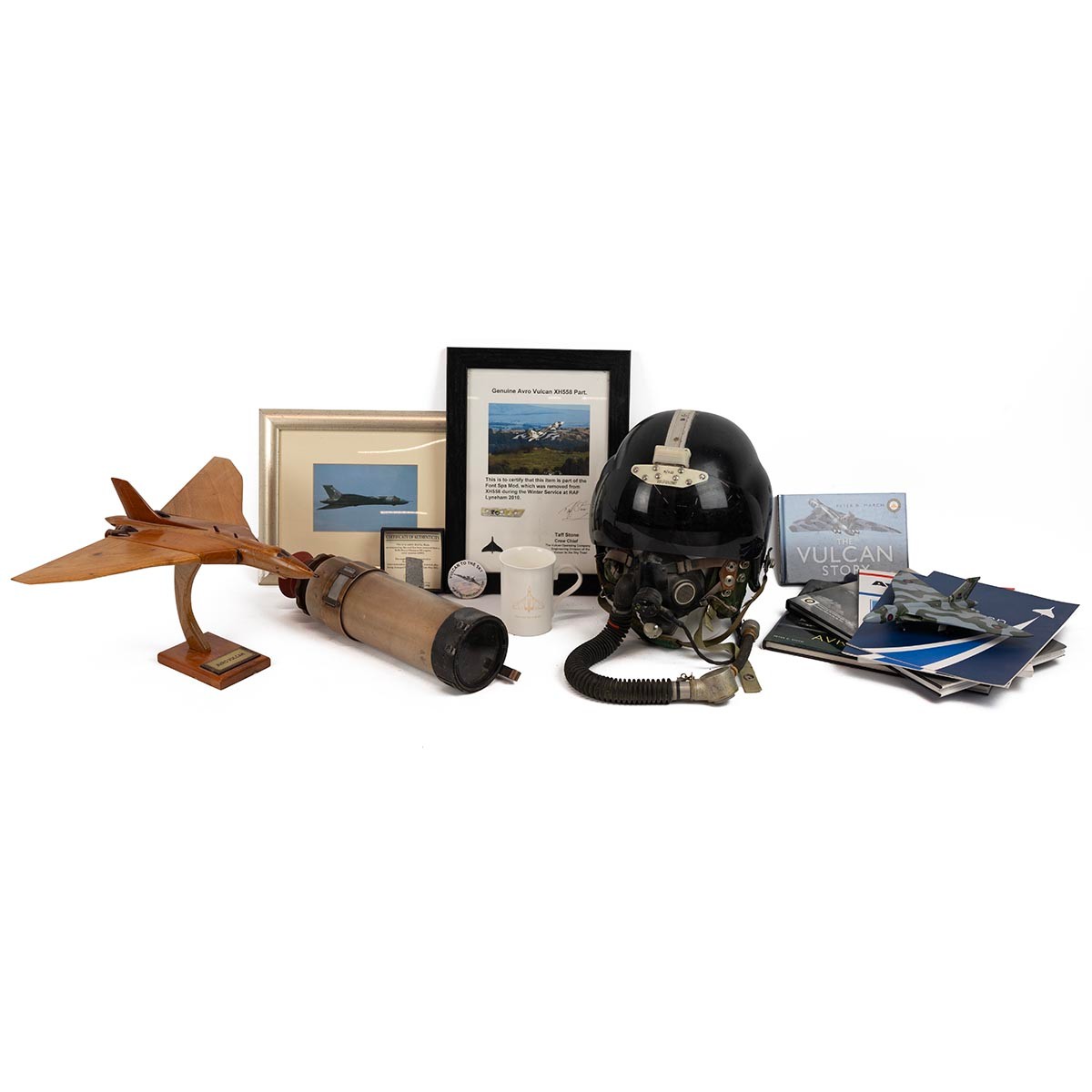 Collection of Vulcan bomber related collectables, including a helmet and inner lining with air plug valve, registration number and visor, scope, models, photographs, badge, volumes etc.