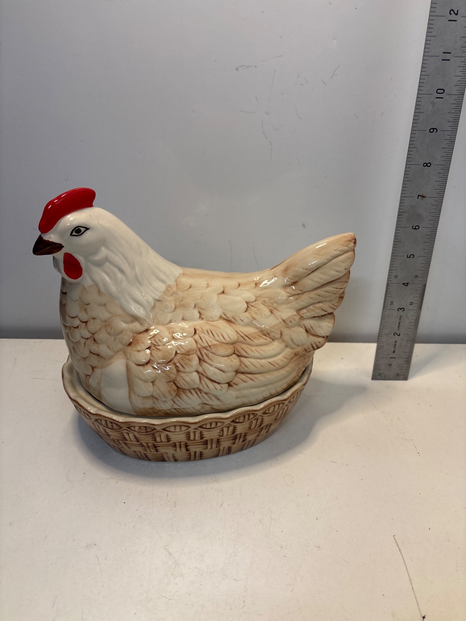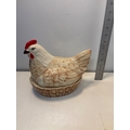Ceramic hen-shaped dish with lid, beige and brown tones.