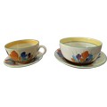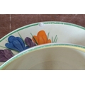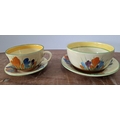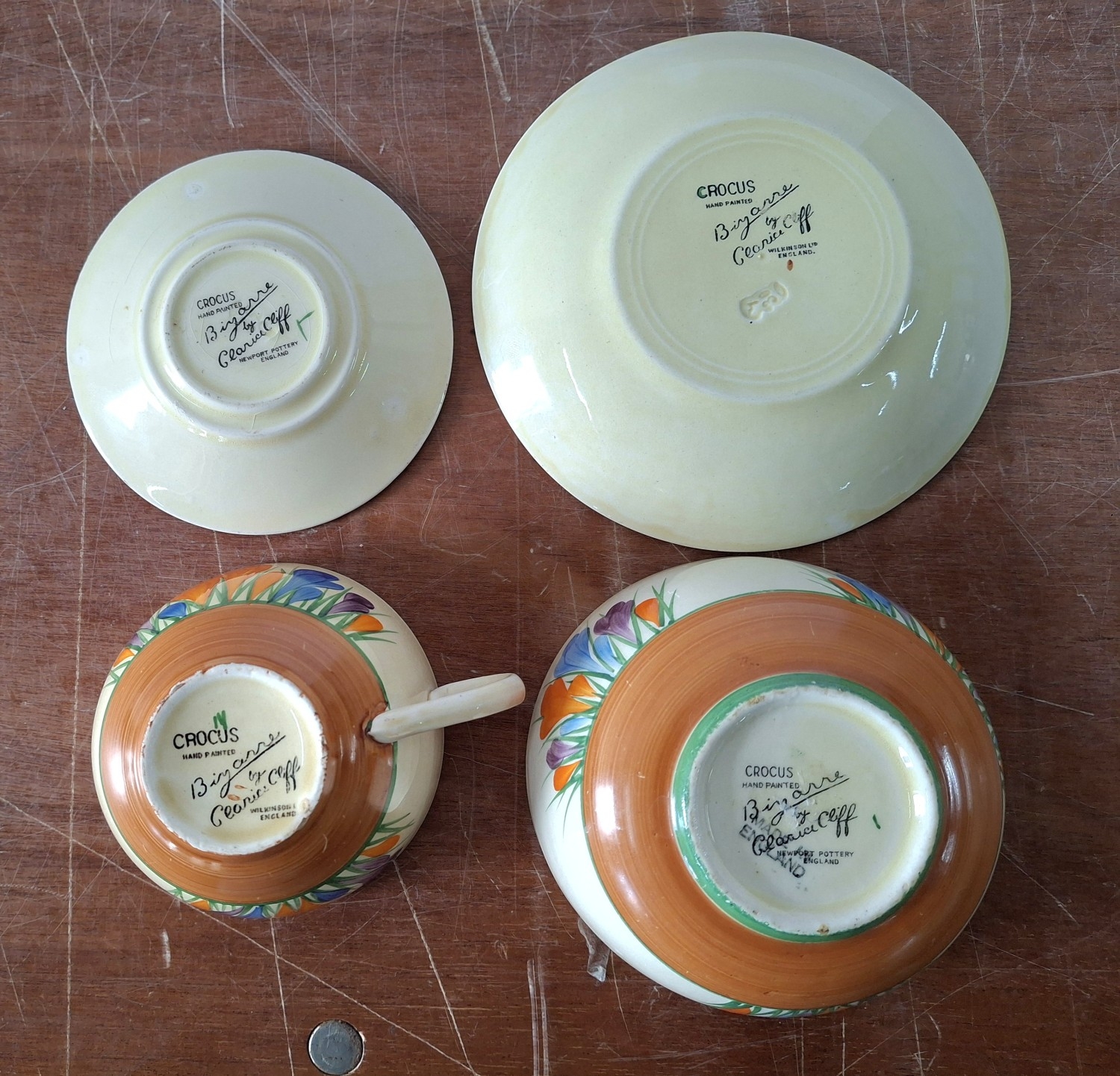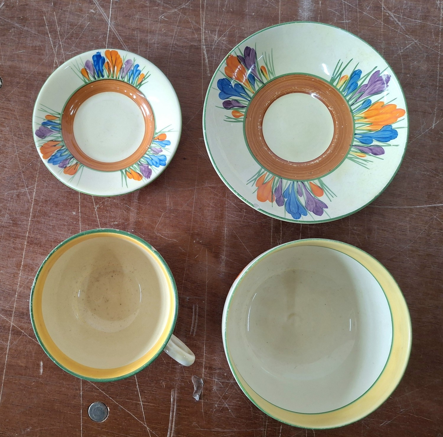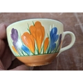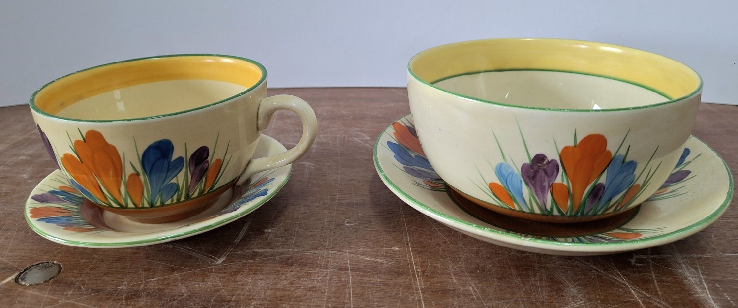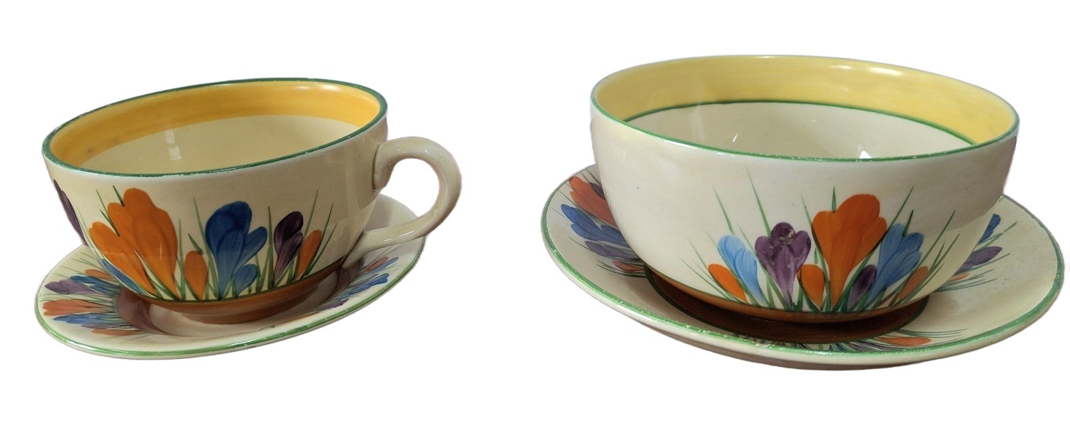 A Clarice Cliff, Newport Pottery, Crocus pattern dessert bowl and associated plate from Wilkinson's, together with a Clarice Cliff, Wilkinson's Bizarre Crocus pattern large tea cup and an associated saucer marked Clarice Cliff, Bizarre, Newport Pottery (4)