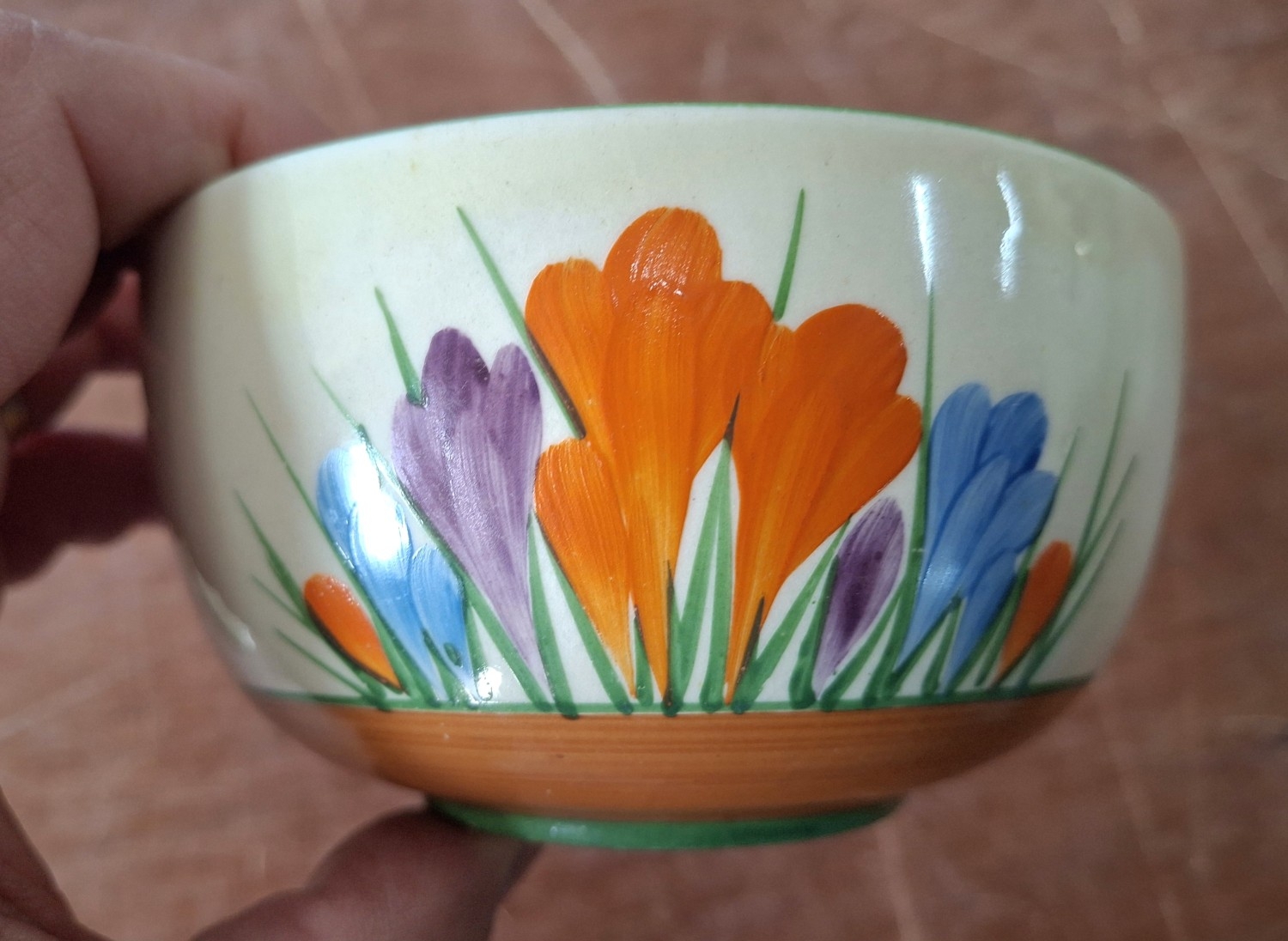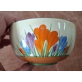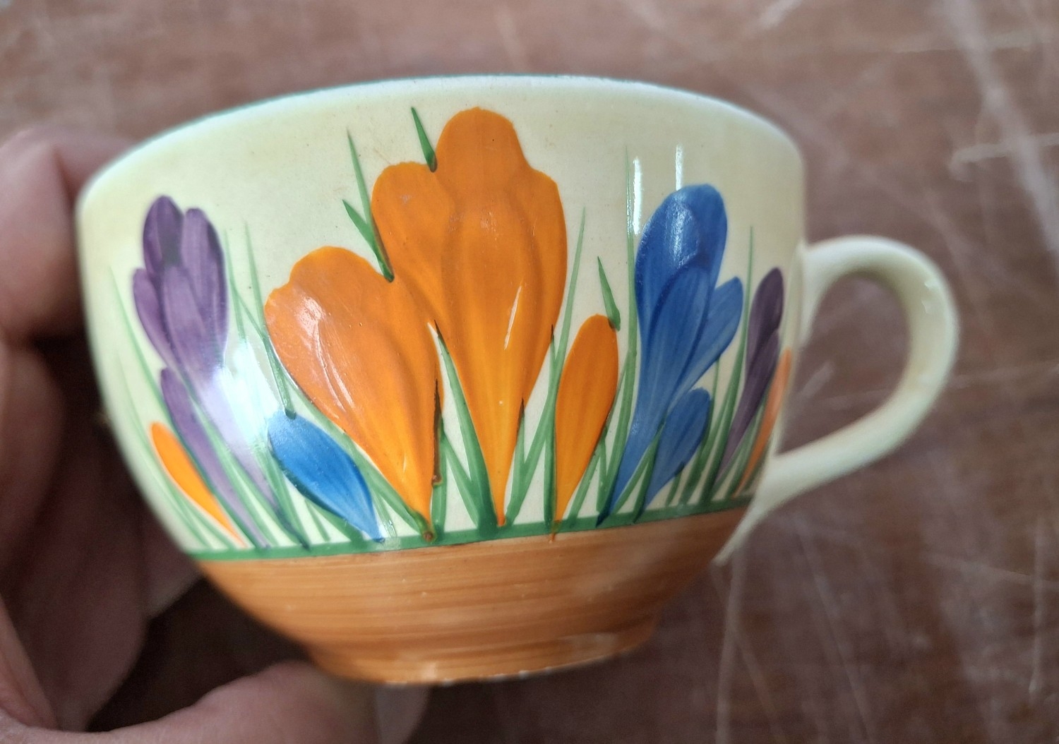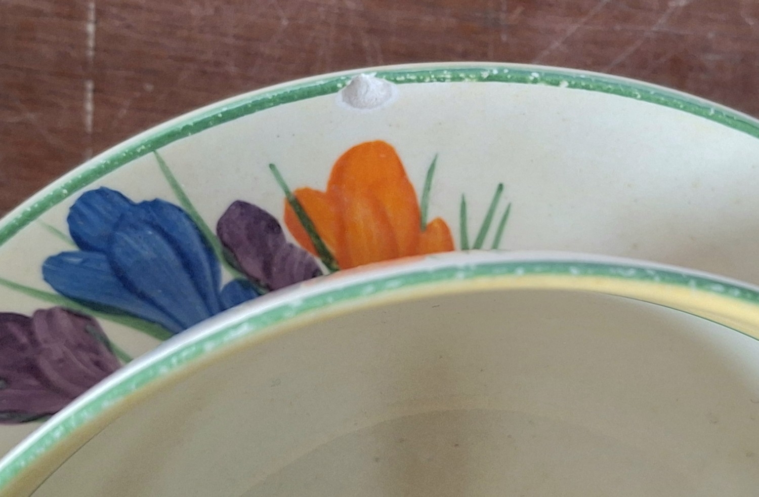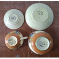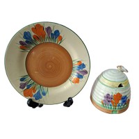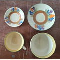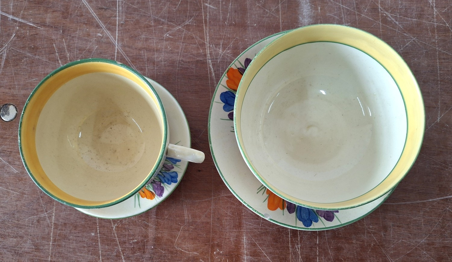 A Clarice Cliff, Newport Pottery, Crocus pattern dessert bowl and associated plate from Wilkinson's, together with a Clarice Cliff, Wilkinson's Bizarre Crocus pattern large tea cup and an associated saucer marked Clarice Cliff, Bizarre, Newport Pottery (4)