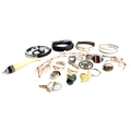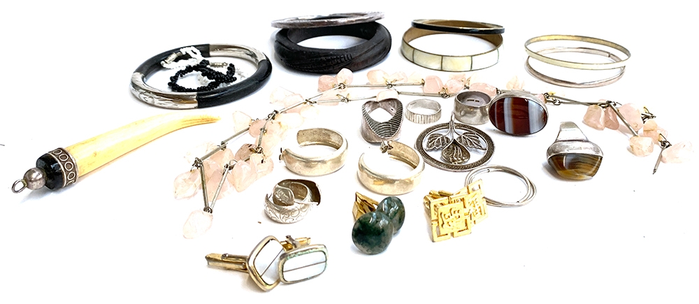 A quantity of jewellery to include various hallmarked silver earrings and rings set with hardstones; rose quartz necklaces and various white metal bangles