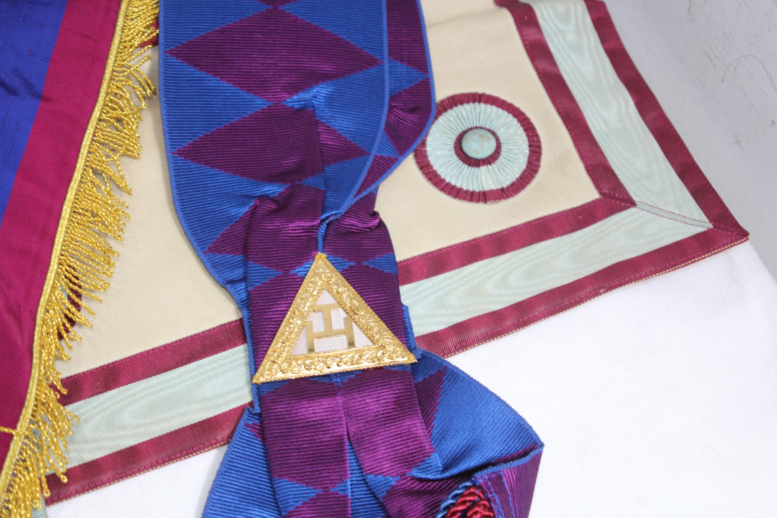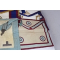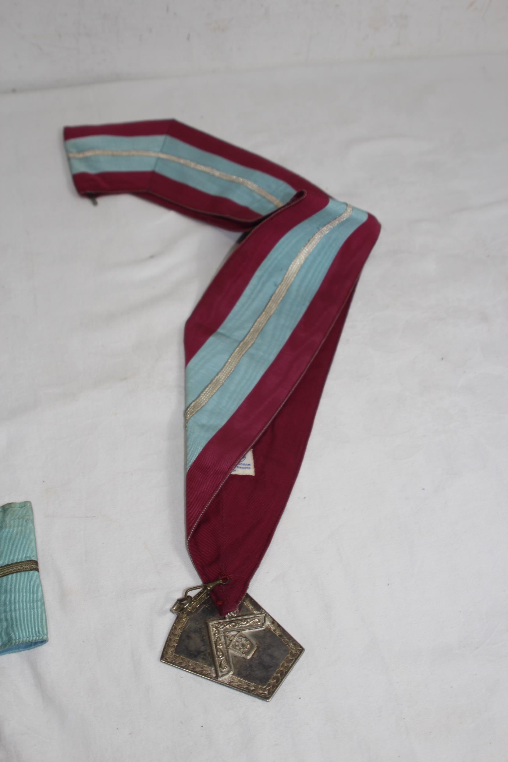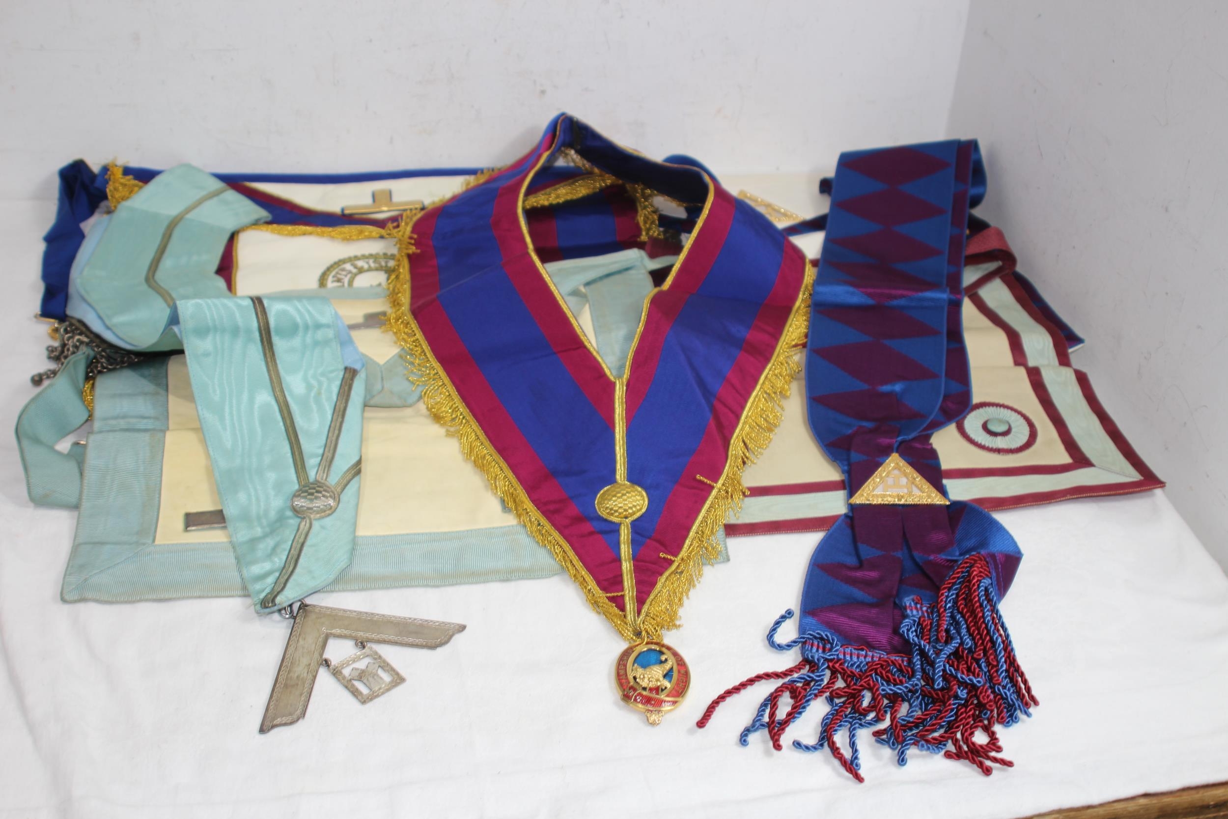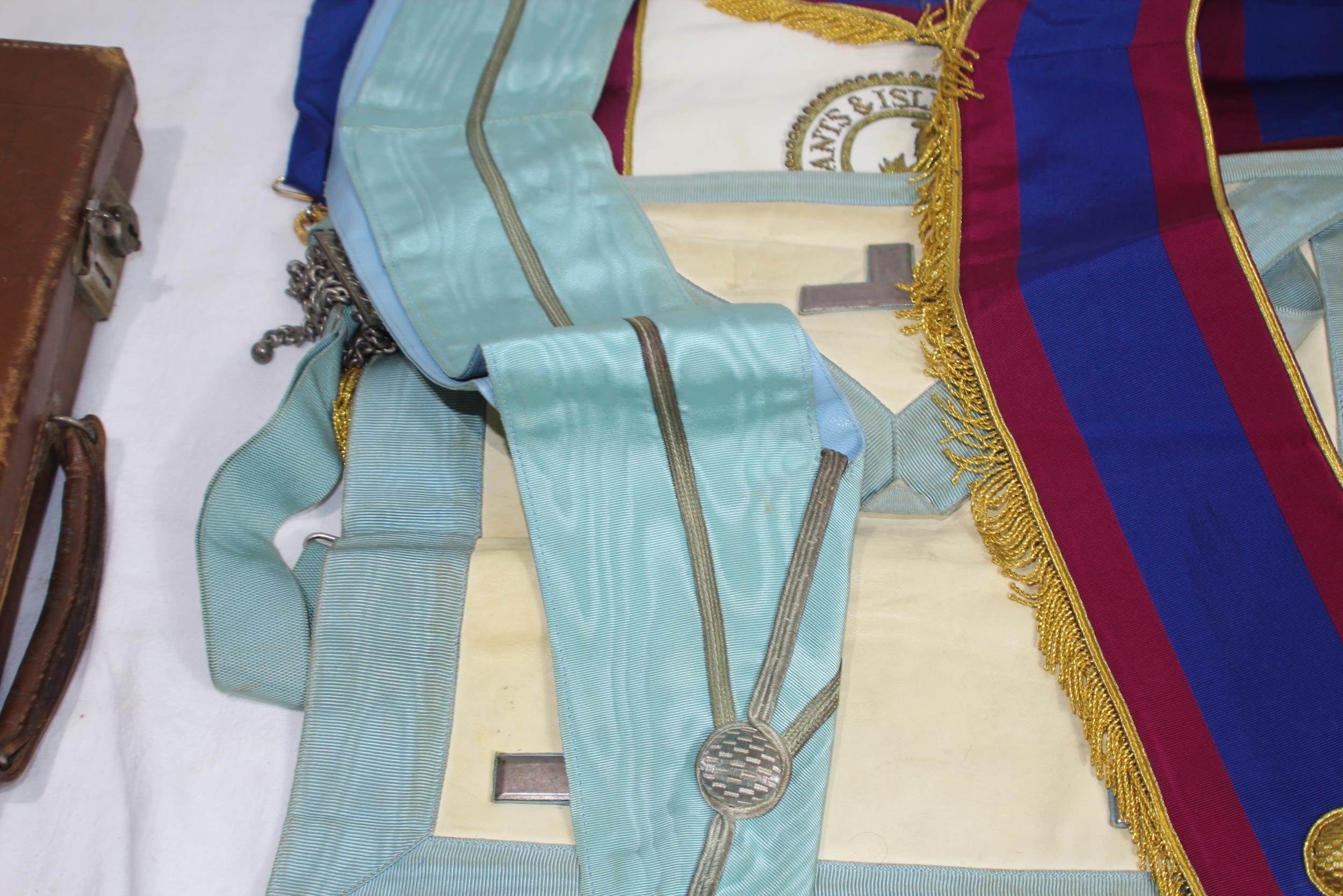 TWO VINTAGE LEATHER CASES WITH MASONIC JEWELLED COLLARS, APRONS, EPHEMERA AND SELECTION OF MASONIC MEDALS/JEWELS