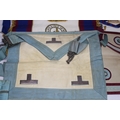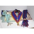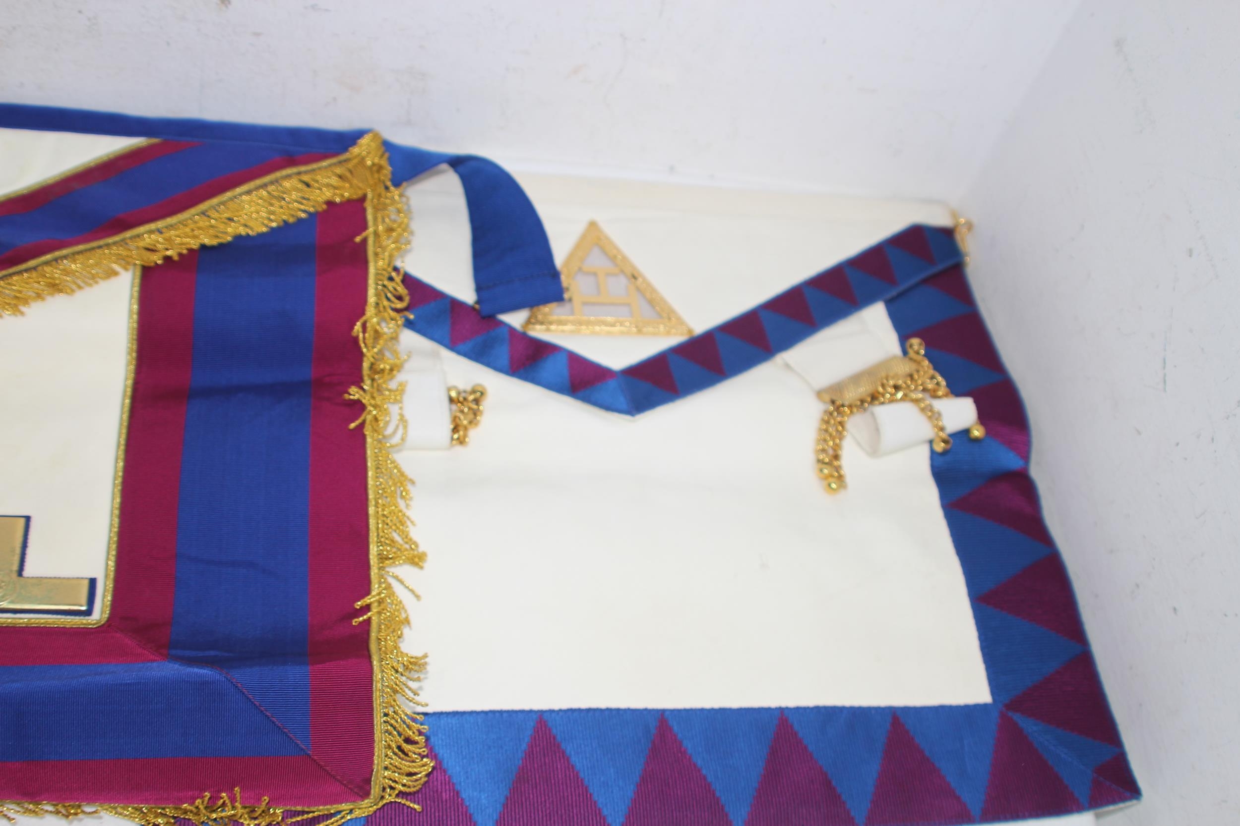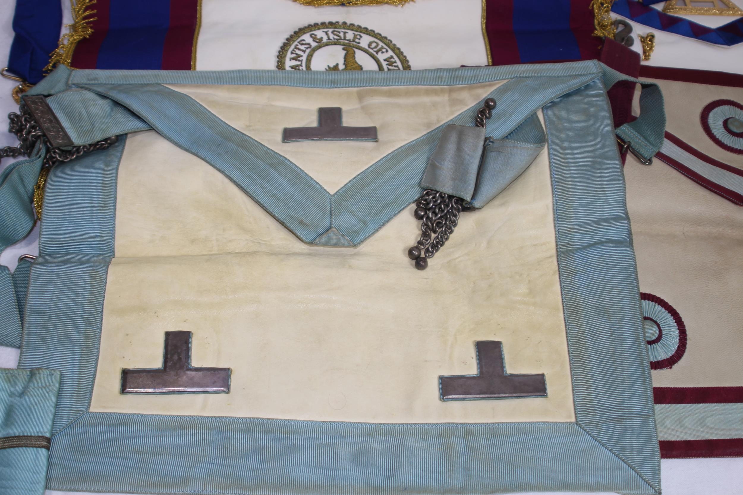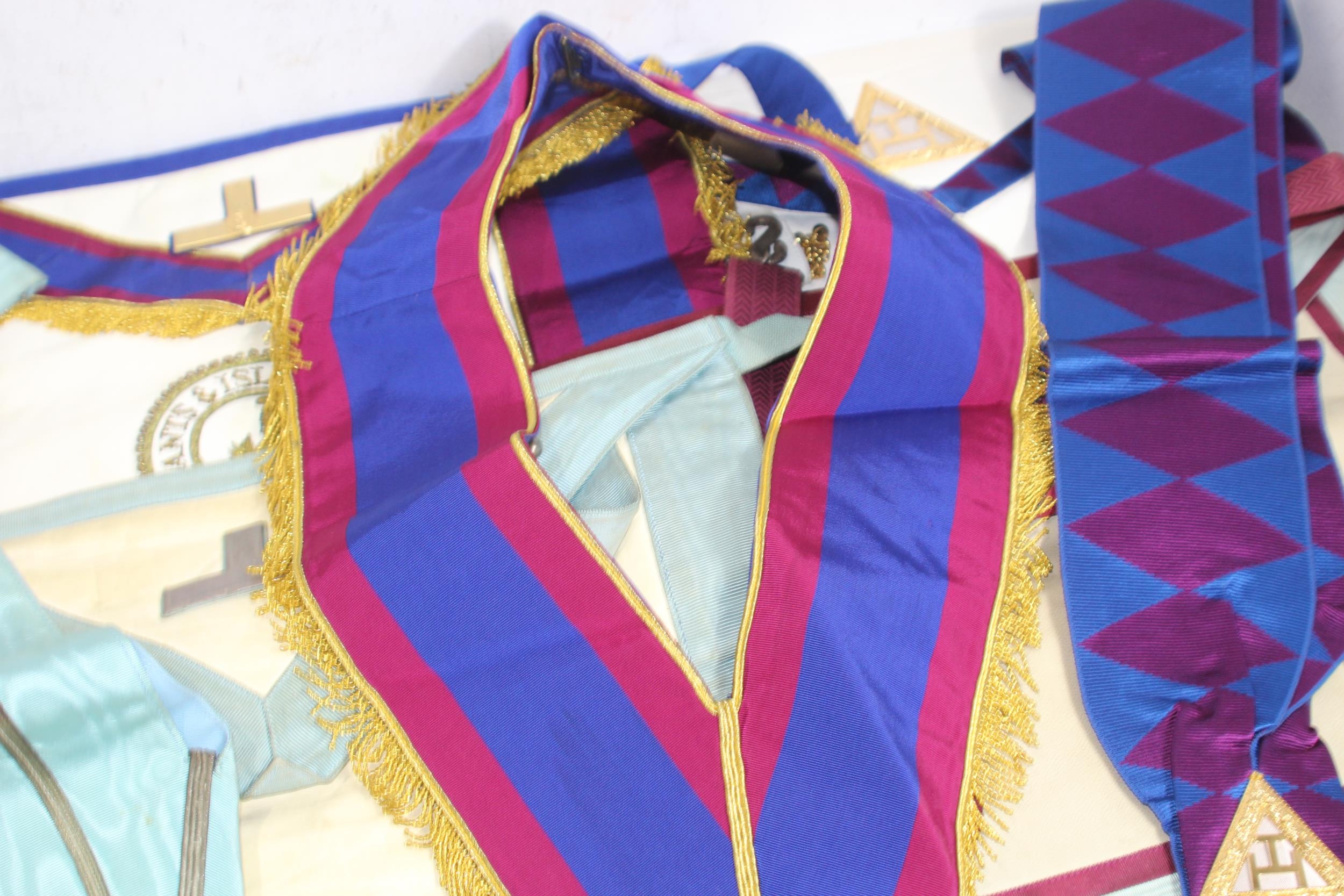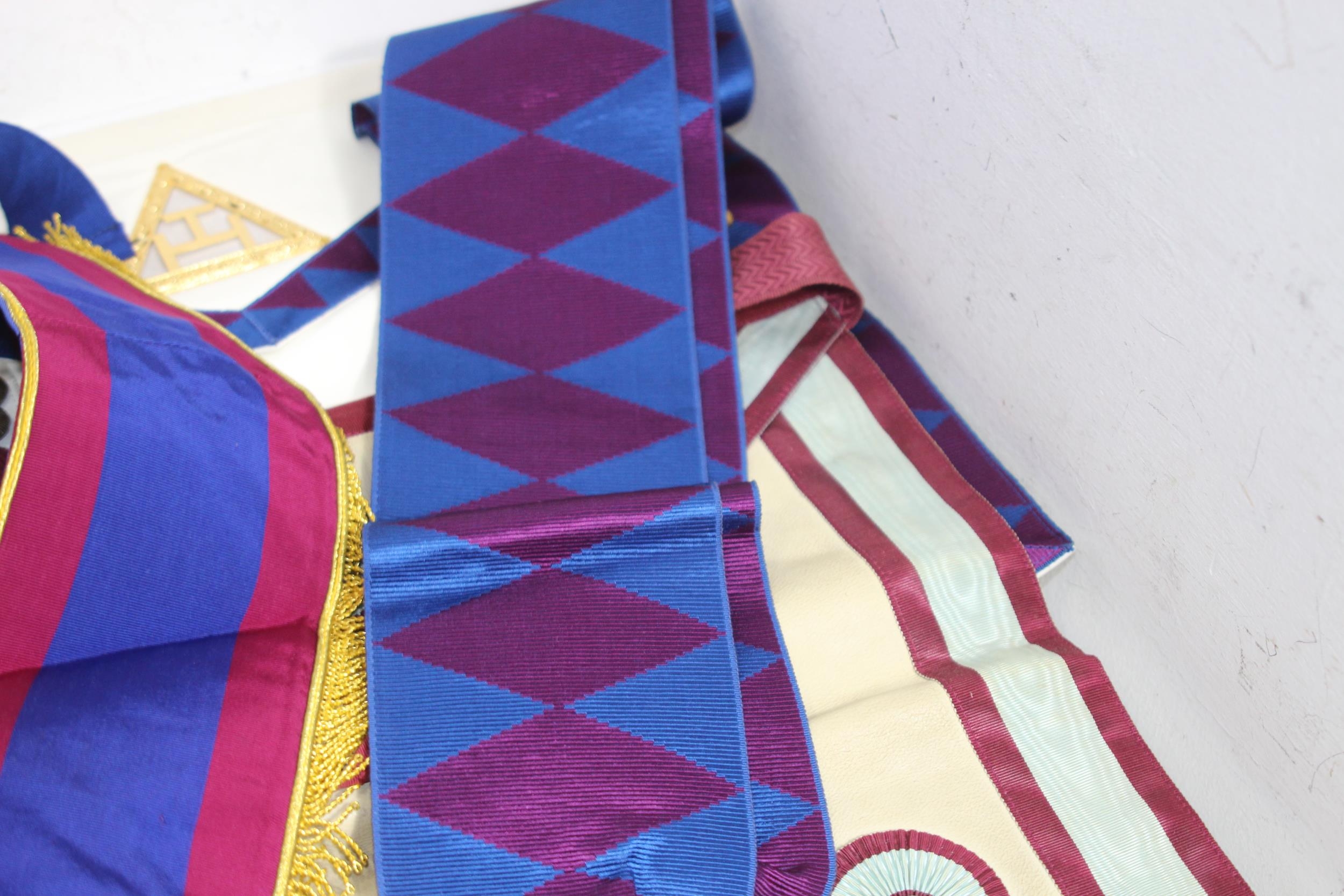 TWO VINTAGE LEATHER CASES WITH MASONIC JEWELLED COLLARS, APRONS, EPHEMERA AND SELECTION OF MASONIC MEDALS/JEWELS