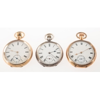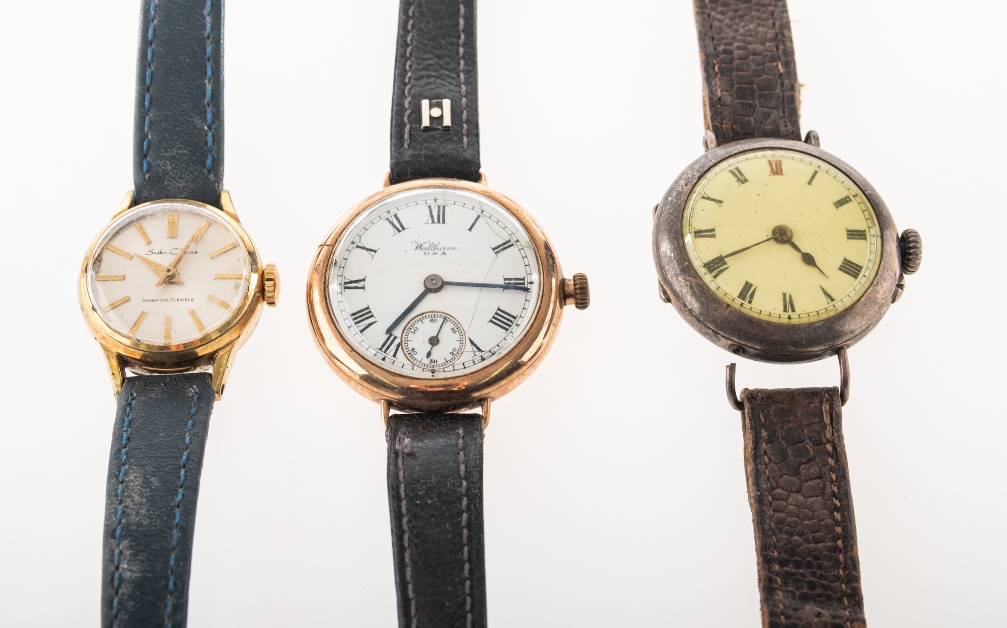 Waltham a 9K gold wristwatch and two others the white enamel dial having black Roman numerals, blued-steel baton hands, a subsidiary seconds dial and signed Waltham, USA, the movement having a lever escapement with the backplate signed A.W.W. Co., Waltham, USA and numbered 554580, the case hallmarked within A.L.D. for the Dennison Watch Case Company and hallmarked for 9K gold, Birmingham 1925 and numbered 374492, with leather strap diameter 30mm, gross weight c.20.76gs. A pre-war silver wristwatch the dial having black Roman numerals, red XII o'clock numeral and blued-steel spade hands, the movement having a lever escapement with the case marked .925, with leather strap, diameter 28mm, gross weight c.21.17gs Seiko Chorus a gentleman's gold-plated wristwatch the dial having raised Dauphine numerals and matching hands, and signed Seiko Chorus, Diashock, 17 jewels, the rear stamped with Seiko markings and numbered 5600425, with leather strap, diameter 20mm. Note: The idea for the Waltham Watch Company came from watchmaker Aaron Lufkin Dennison, born 1812, having seen a gap in the market following the increase in watches coming from the workshops in England and Switzerland. Dennison first served as a jeweller's apprentice before, in 1833, he took on the role of a journeyman watchmaker with the firm of Currier & Trott in Boston before setting up on his own account in 1839. In 1849, Dennison went into business making watches with Edward Howard and were joined by David P. Davis and financier Samuel Curtis to form the American Horologe Company, soon to change to Warren Manufacturing. Dennison visited England to learn more about production of watches and purchase supplies noting that the watch industry in England was still not highly mechanised therefore giving him the belief that their business model, of making machined parts that were interchangeable rather than each part individually by hand, could make a real impact in England. It was for this reason that Dennison is generally credited with being the father of American mass-production watchmaking. The company began in Roxbury, Massachusetts on a property already owned by partners Howard and Davis where both Swiss and American watchmakers were employed. In 1853 the name of the company was changed to the Boston Watch Company and in 1854 land was purchased in nearby Waltham and a building constructed. In 1857 financial problems saw the Waltham Improvement Company foreclose on the mortgage it held for the Waltham factory with the Waltham property purchased by Royal Robins. Dennison remained as superintendent of the Waltham facility until 1862 and so the initial phase of the Waltham Watch Company had come to an end. New owner Royal Robbins was an experienced New York watch importer who worked a partnership with his brother Henry Asher Robbins and Daniel F. Appleton and in 1885, the company name changed to the American Waltham Watch Company (AWW Co). During World War II Waltham was an important contractor for the American military, producing timepieces for service personnel and timing devices for military ordinance, such as bombs and torpedoes, with the company's Waltham, Massachusetts factory wholly converted to military production. The company closed its factory doors and declared bankruptcy in 1949. A reorganized Waltham relaunched watch manufacturing in March 1952 announcing that the company would itself begin the importation of complete watch movements from Switzerland. Waltham continued in various guises over the intervening years with changes of ownership, rights to the name and location. Having left Waltham in 1862, it was in 1864 that Aaron Dennison and A. O. Bigelow set up the Tremont Watch Company in Boston with the finer watch parts, such as escapements and movement trains, made in Switzerland and the larger parts made in America. Dennison moved to Zurich, Switzerland. In February 1871, Aaron moved from Zurich to England where he assembled some watches using parts left over from the Zurich workshops and plates from Tremont. In 1874 the name was changed to the English Watch Manufacturing Company at which point Dennison left the company. In 1862 Dennison founded a business in Birmingham making pocket watch cases in both gold, silver and gold-plated. They supplied the London office of the Waltham Watch Company amongst others becoming the largest supplier of cases. In 1879, Alfred Wigley joined the firm becoming Dennison, Wigley & Company and following Aaron Dennison's death in 1895, his son Franklin became a partner in the firm. In 1905 it was renamed the Dennison Watch Case Co., supplying many of the well-known watchmakers of the time including Rolex. The company continued until 1967.