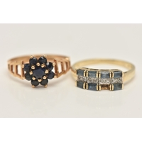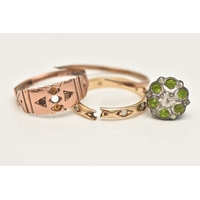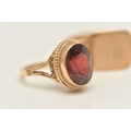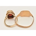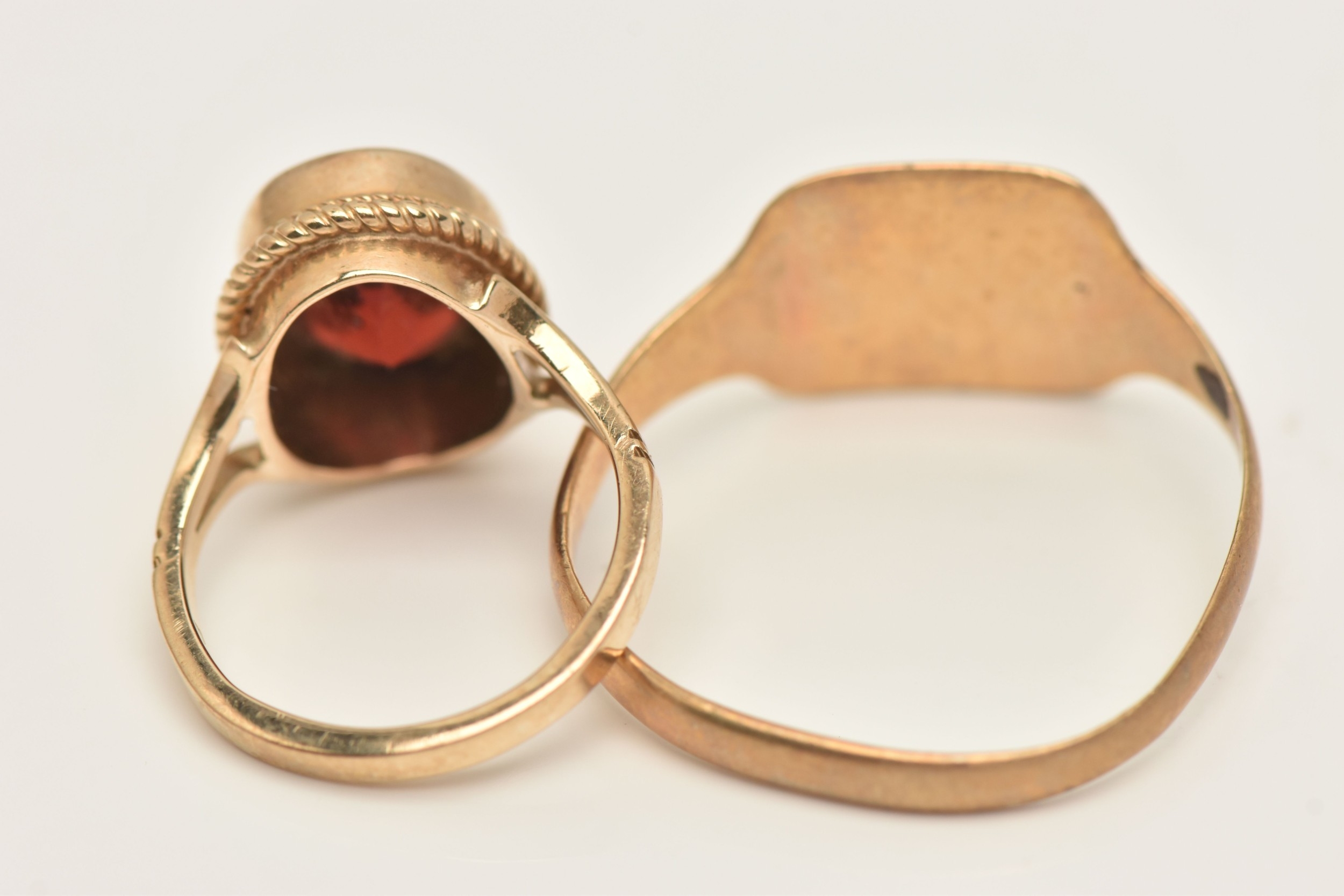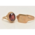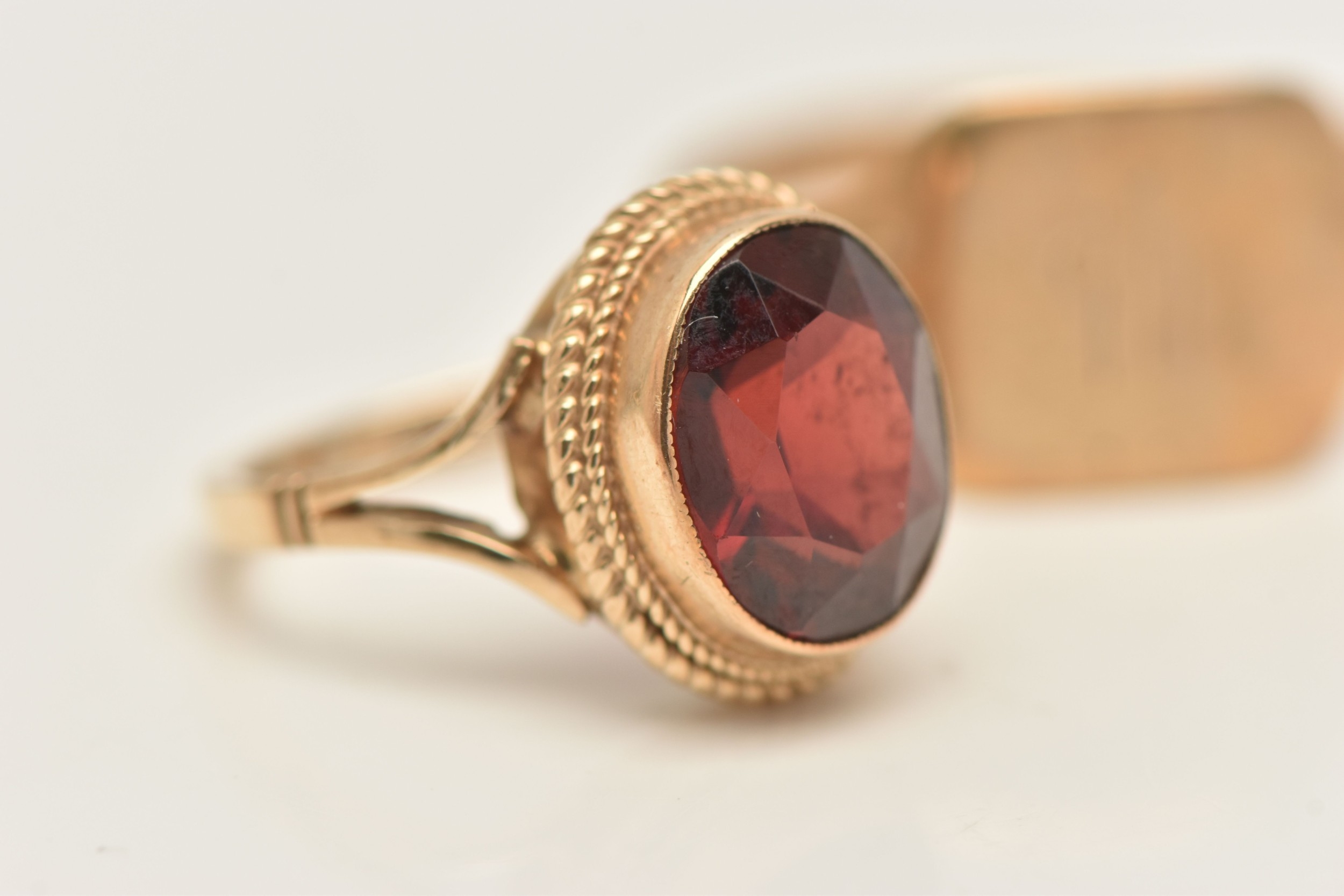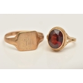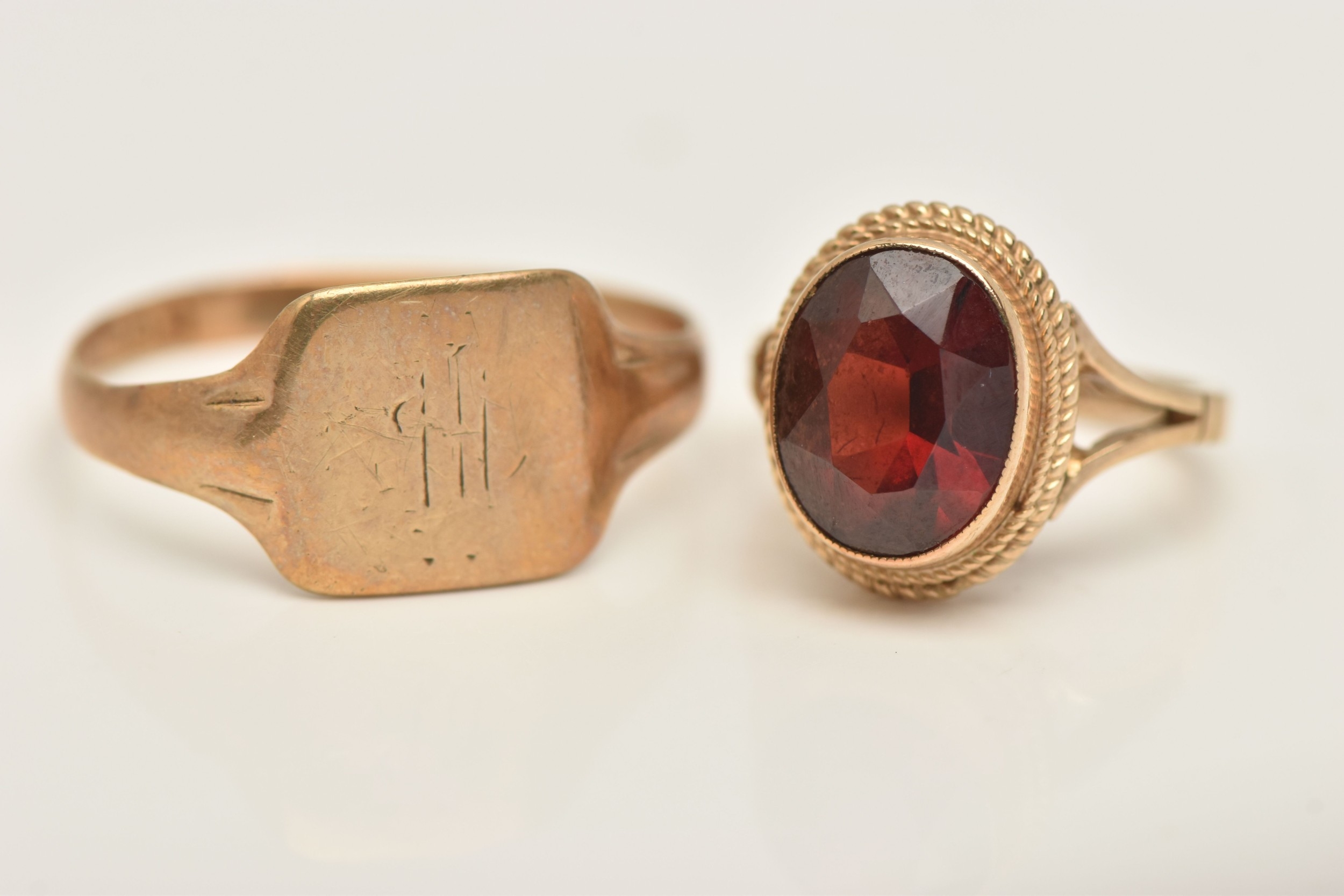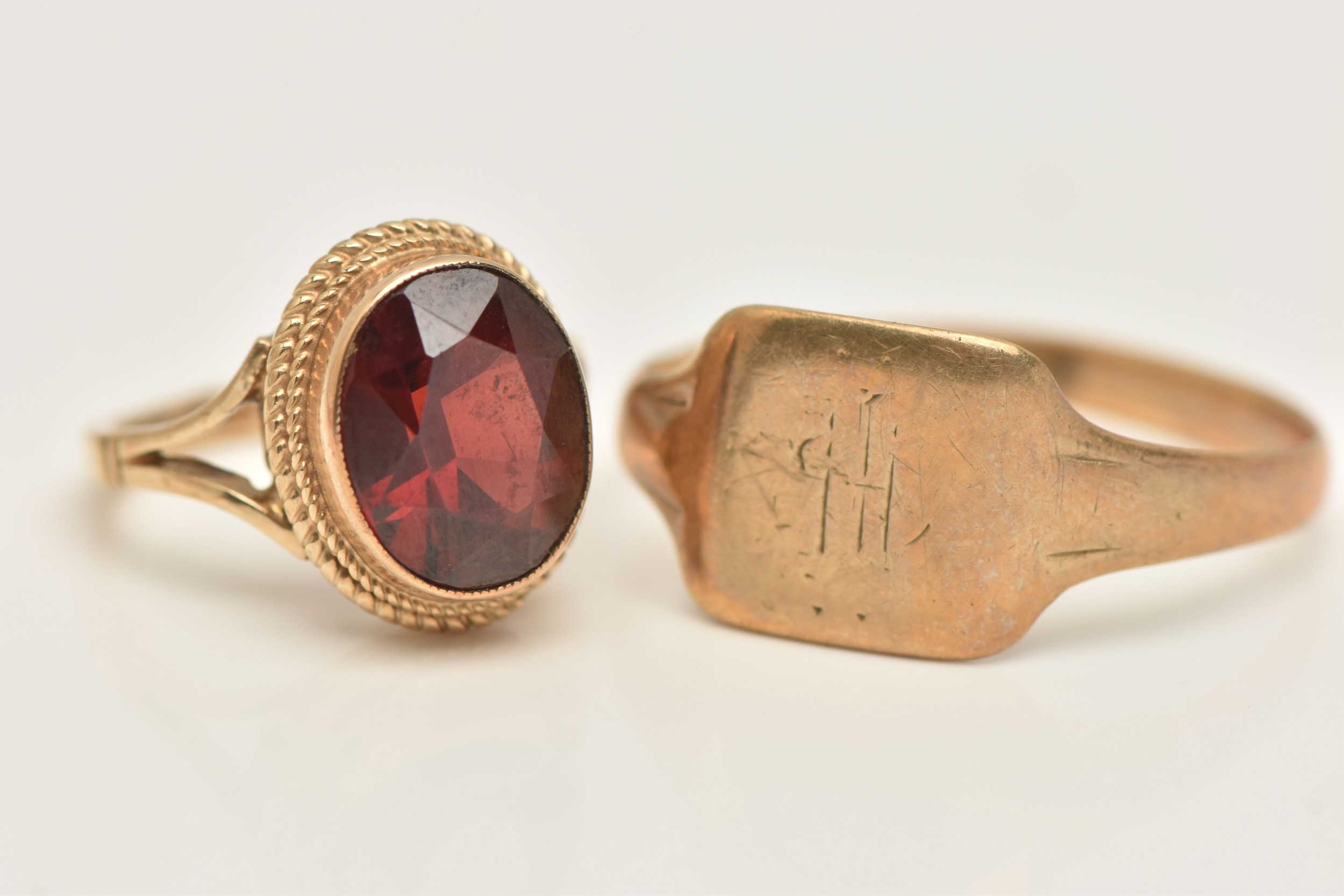 TWO 9CT GOLD RINGS, the first set with an oval cut garnet, hallmarked 9ct Birmingham, ring size D 1/4, the second an AF square signet ring with worn engraving, misshapen band, hallmarked 9ct Birmingham, approximate gross weight 5.2 grams (condition report: signet ring will require attention)