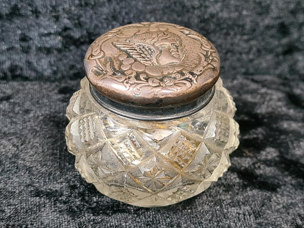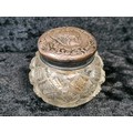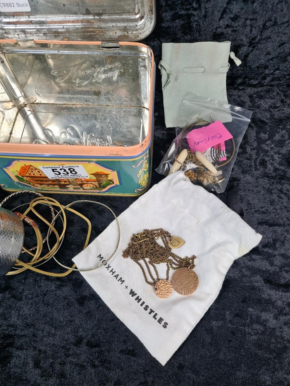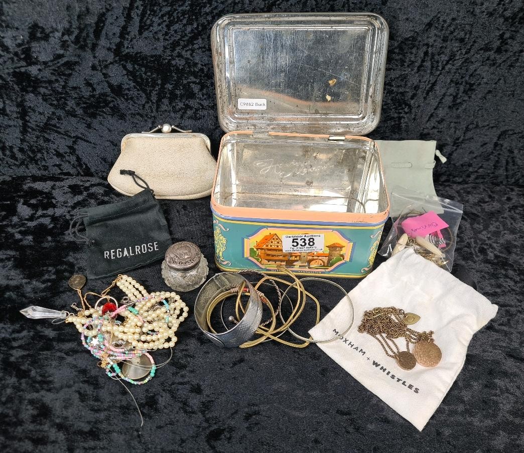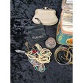 Vintage tin full of various costume jewellery bits, earrings, bangles etc. plus a small vintage purse and a small silver topped dressing table pot.