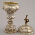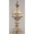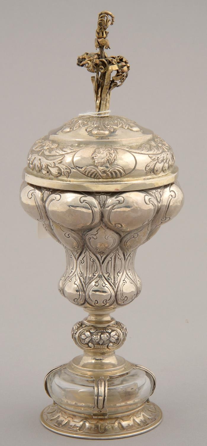 A GERMAN SILVER GILT PINEAPPLE GAMING CUP AND COVER, LATE 19TH C IN 16TH C STYLE, ON GLASS MOUNTED FOOT CONTAINING IVORY DICE, RIM ENGRAVED WITH AN INSCRIPTION, 25CM H, EAGLE AND FRENCH SWAN CONTROL MARKS, 12 OZ 5 DWT