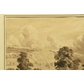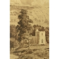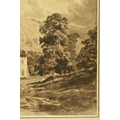 CIRCLE OF CORNELIUS VARLEY (1781-1873) LANDSCAPE WITH CHURCH, an English school landscape, no visible signature, attribution verso, ink wash on paper, approximate size 33cm x 29cm, Condition Report: light spots of foxing in places, dirty marks to the mount (provenance - The Arnold Fellows collection)