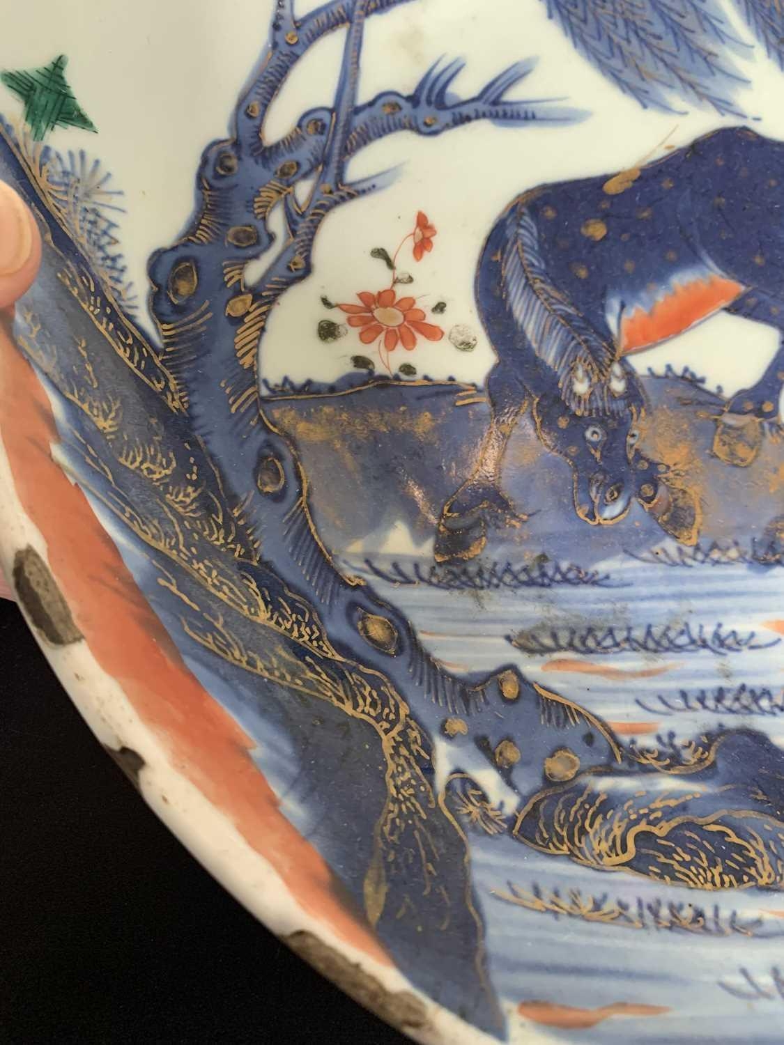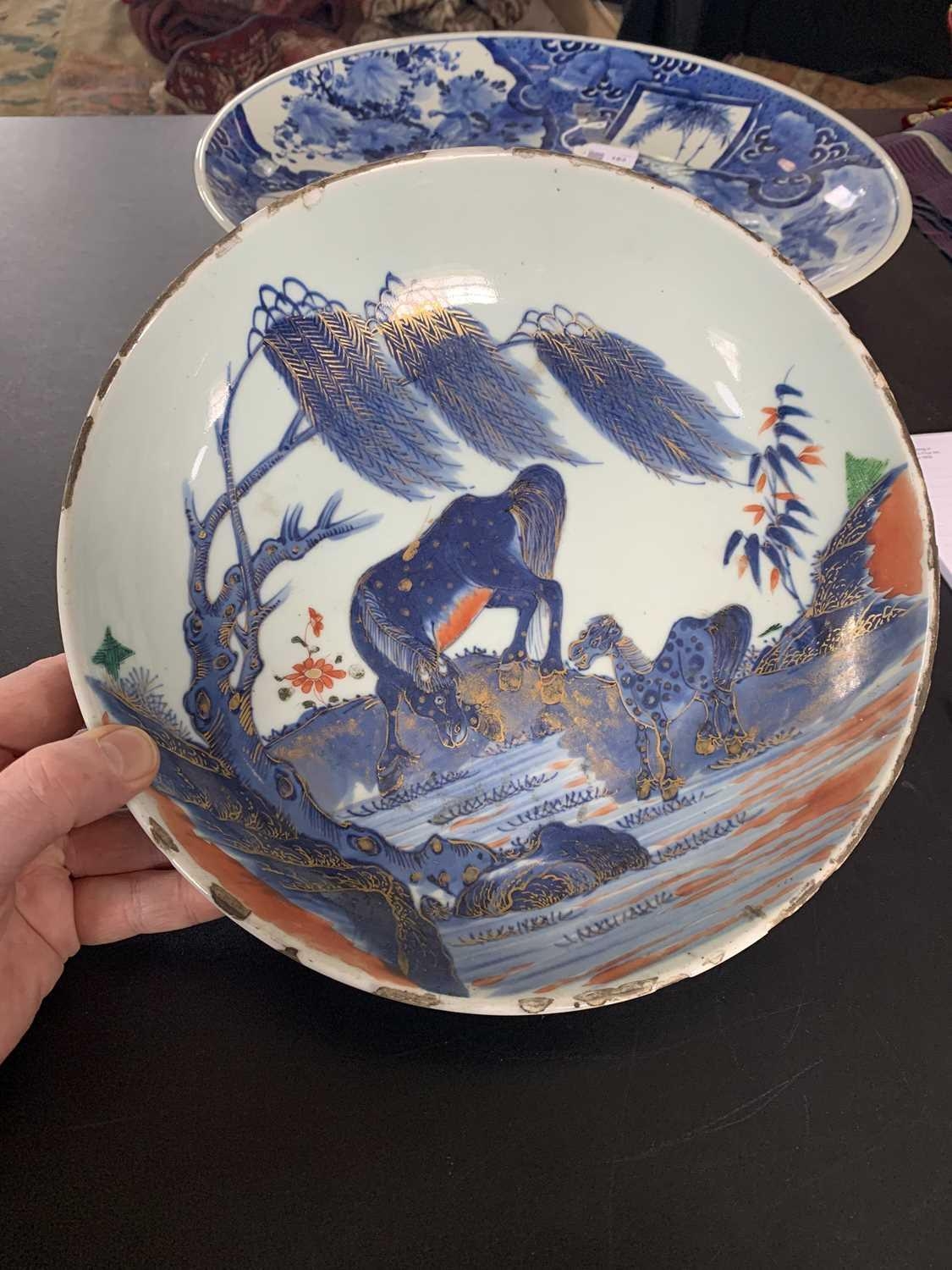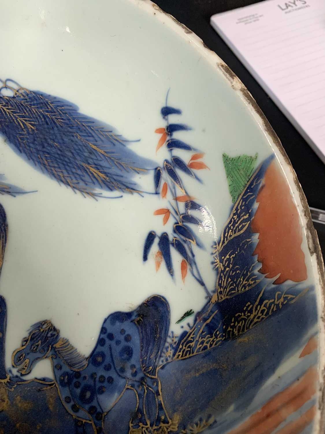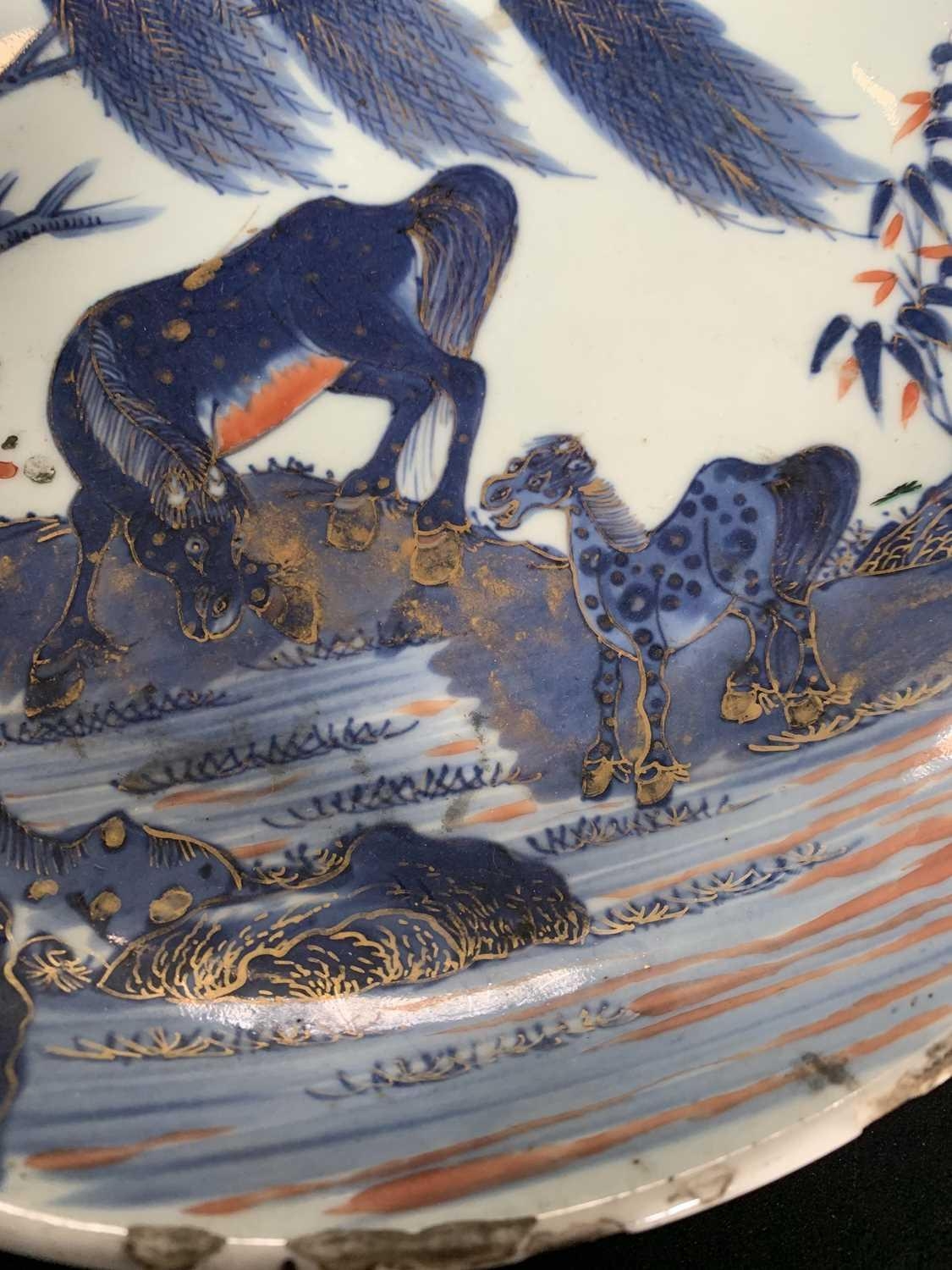 A Chinese Imari porcelain dish, 18th century. With horses in a landscape and standing beneath a willow tree, height 6.5cm, diameter 28cm. Many chips on the rim. Extra images on our website www.davidlay.co.uk