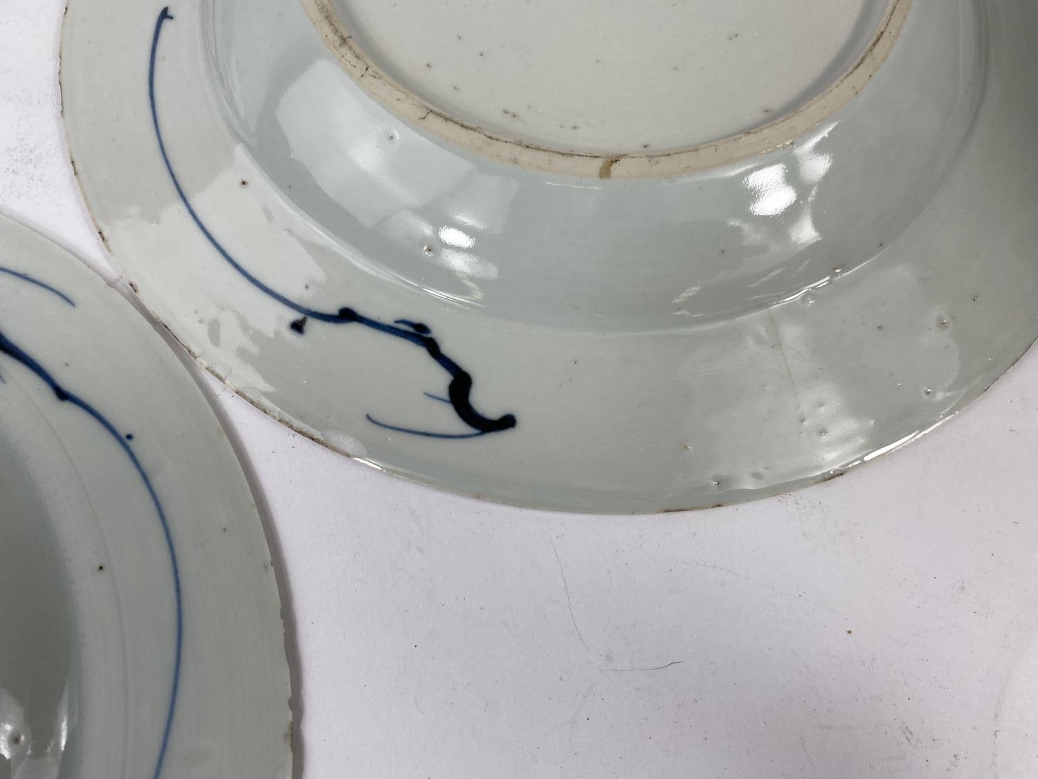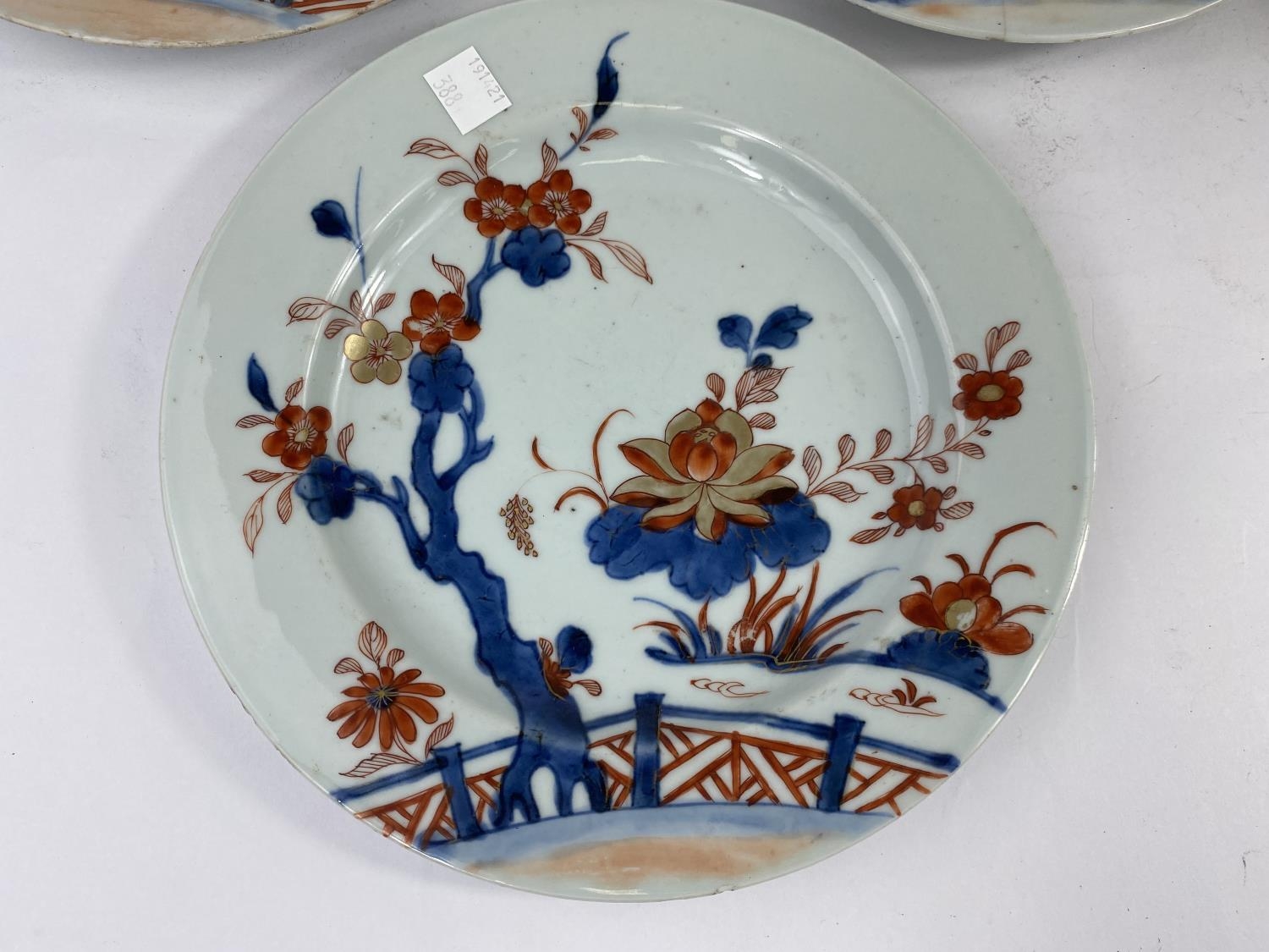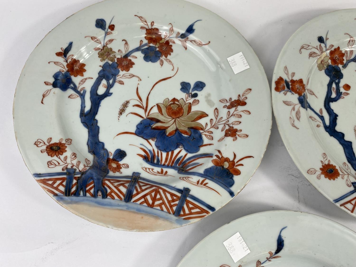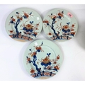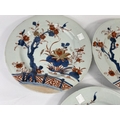 Three 19th century Chinese Imari plates decorated with flowers in blues, reds and gilt; diameter 23cm (some rim frits, 1 dish with 3cm hairline otherwise ok)