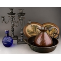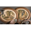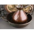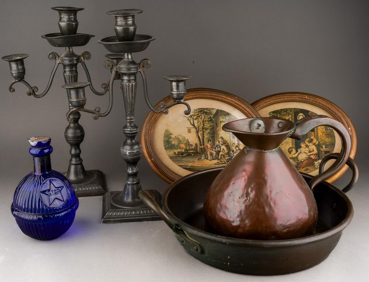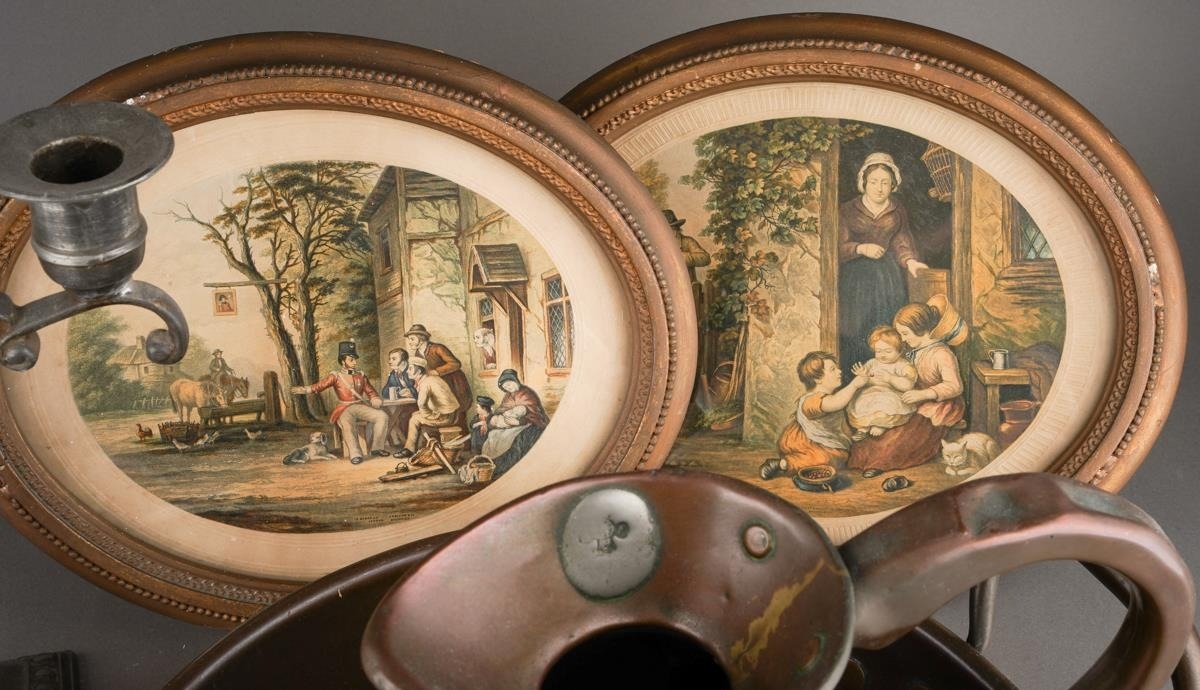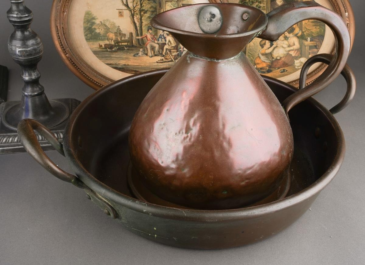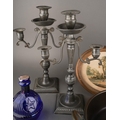 A pair of 18th Century style possibly French pewter candlesticks, urn shaped sconces with scroll branches on fluted and knopped columns on square shaped bases, unmarked, approx 36cm high together with a metal jug, warming pan, a pair of Le Blond & Co oval prints [1 box]