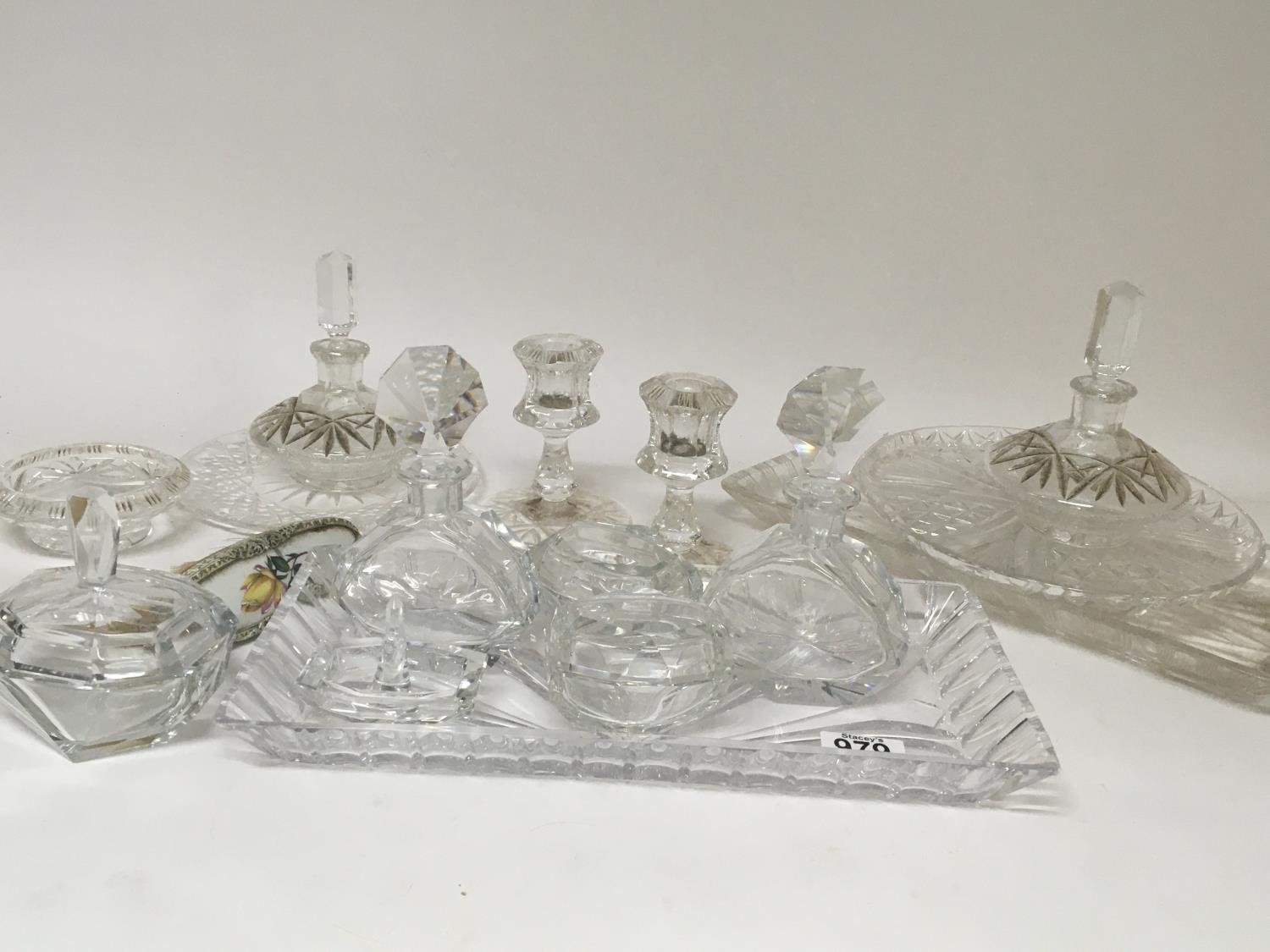 A collection of cut glass dressing table sets and two brushes. (a lot). NO RESERVE
