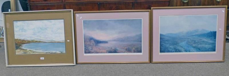 2 GILT FRAMED HOWARD BUTTERWORTH PRINTS, SIGNED IN PENCIL AND GILT FRAMED WATERCOLOUR OF A BEACH, SIGNED -3-