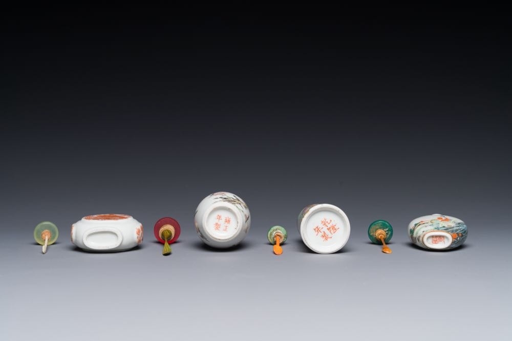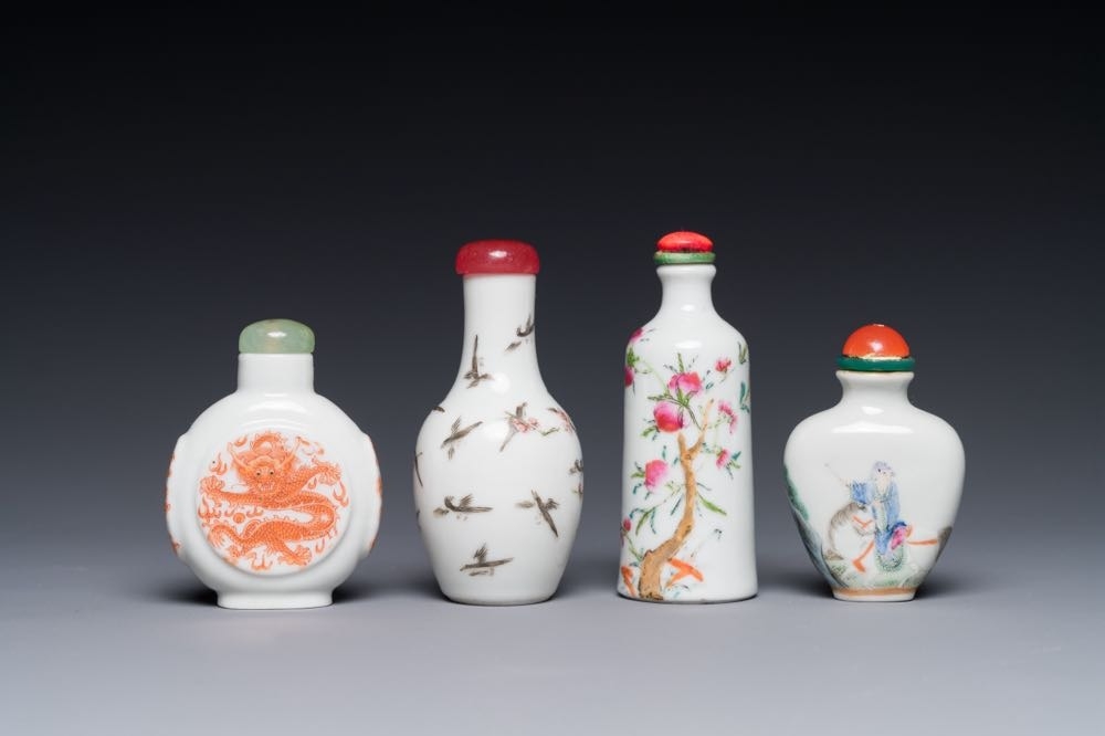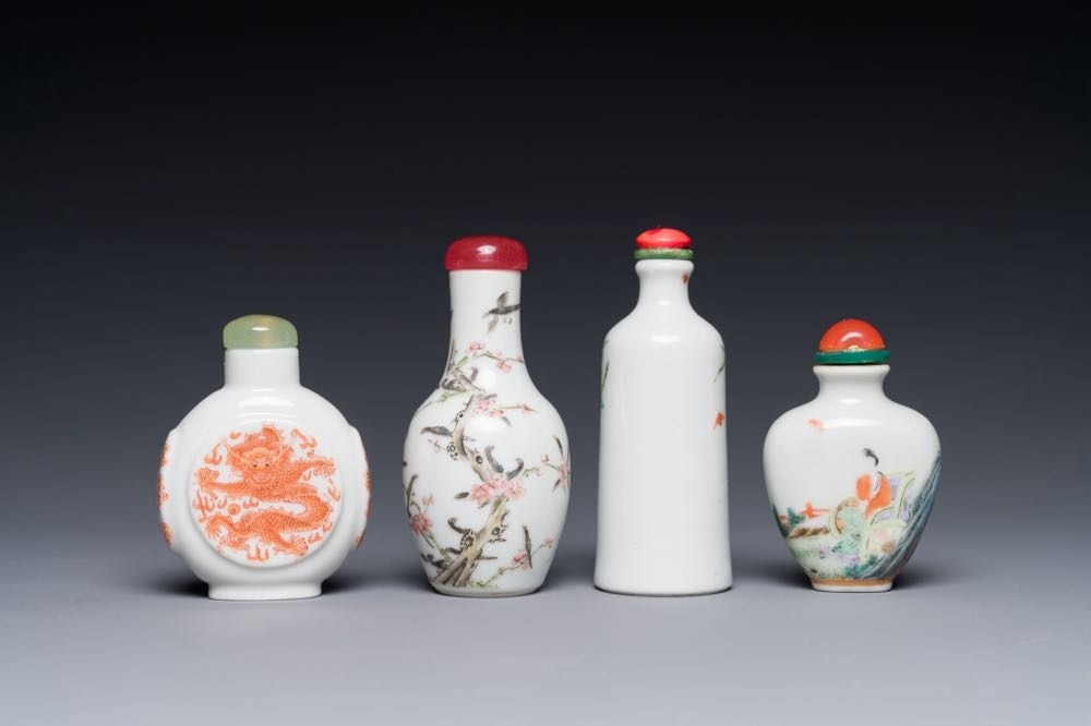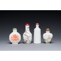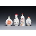 Four Chinese famille rose and iron-red snuff bottles, Qianlong and Yongzheng mark, 19/20th C.