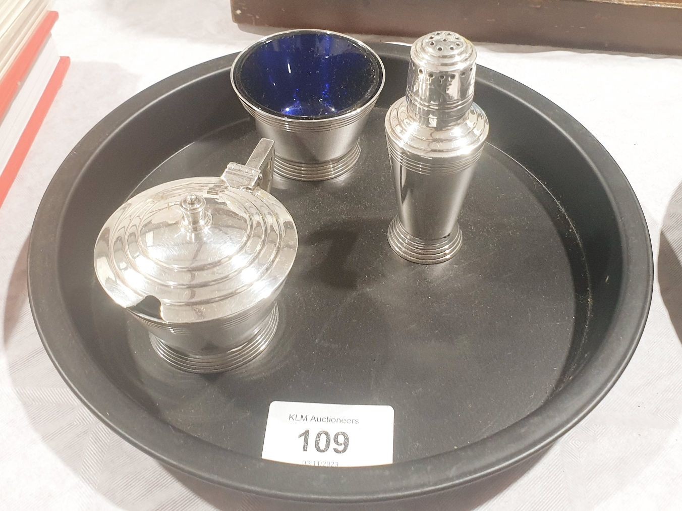 An Art Deco Mappin and Webb silver plated cruet set designed by Keith Murray. UK shipping £14.
