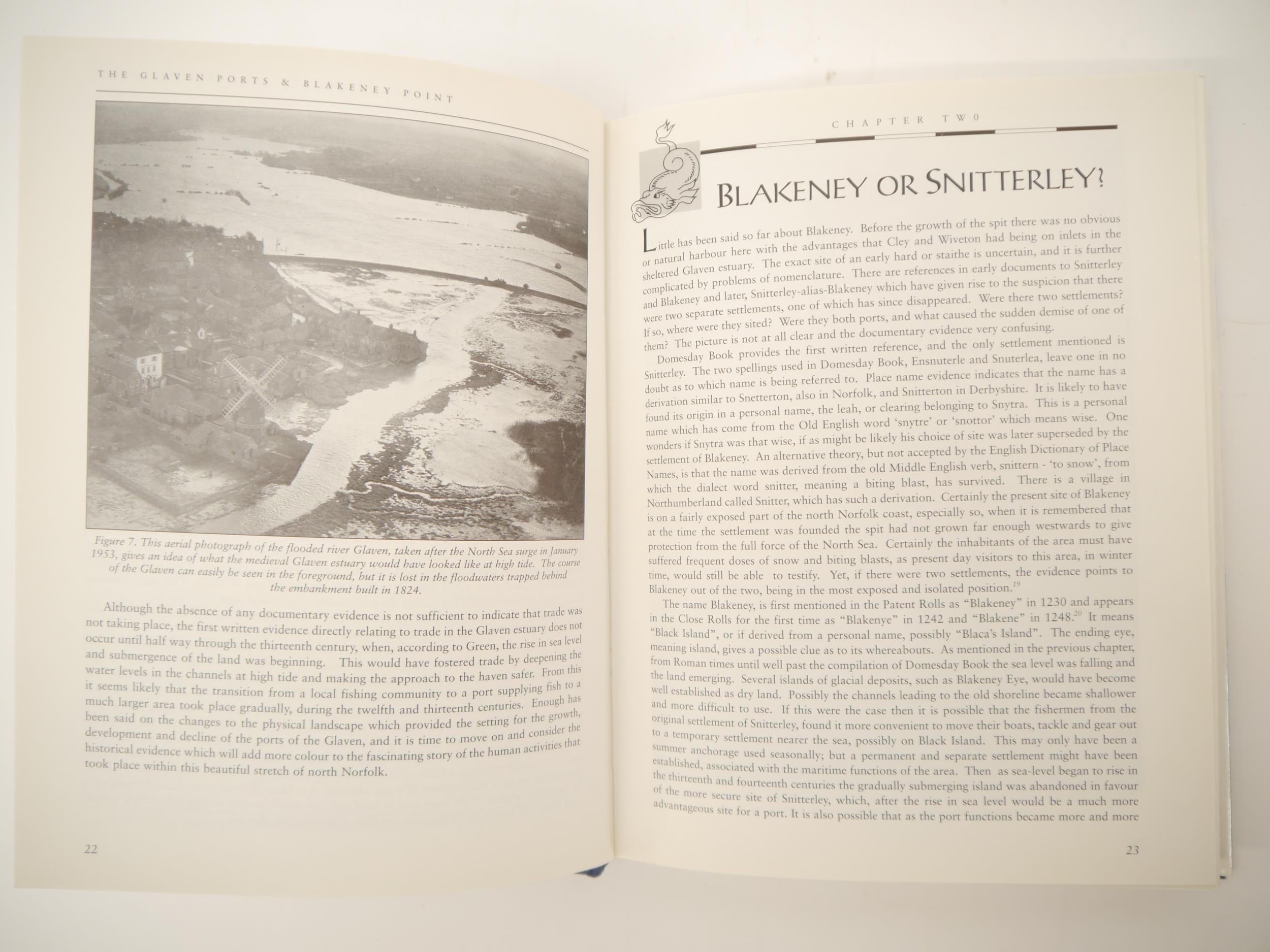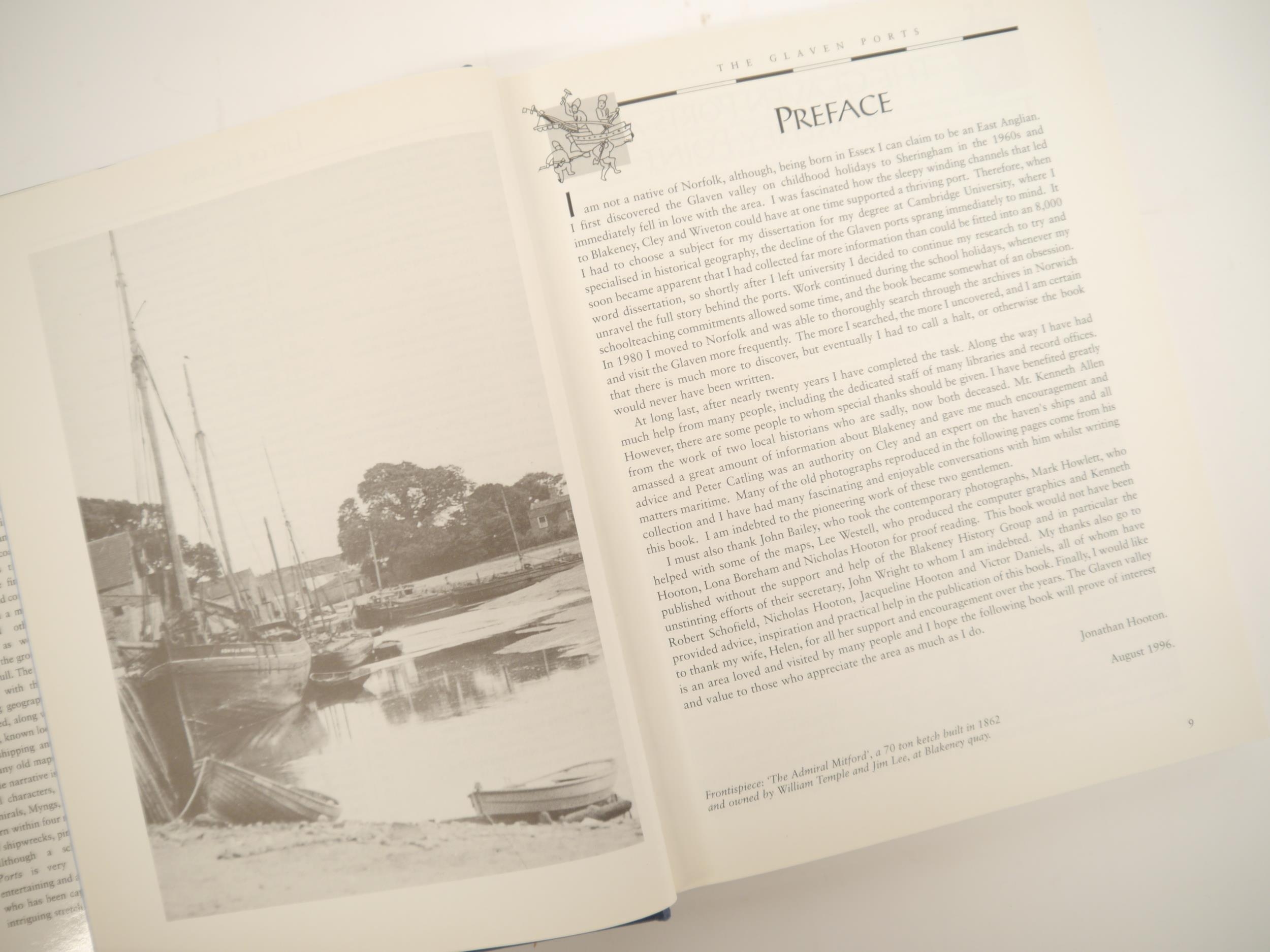 Jonathan Hooton: 'The Glaven Ports', Blakeney History Group, April 1997, reprint, 299pp, illustrations throughout, original cloth gilt, dust wrapper. A history of the villages of Blakeney, Cley and Wiveton, in North Norfolk, formerly bustling and prominent ports on the wide Glaven river estuary, through to their eventual decline from embanking and competition from the railways