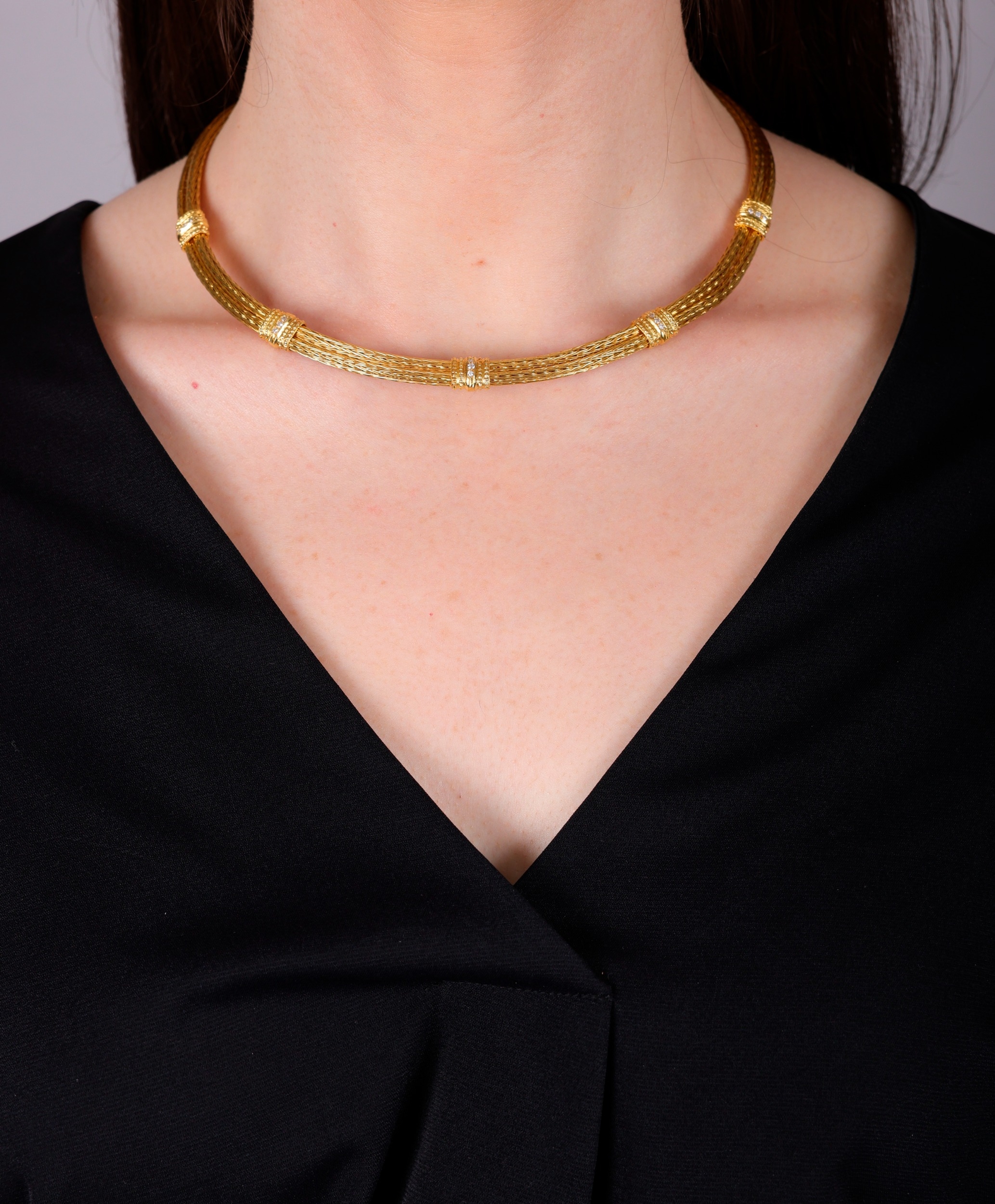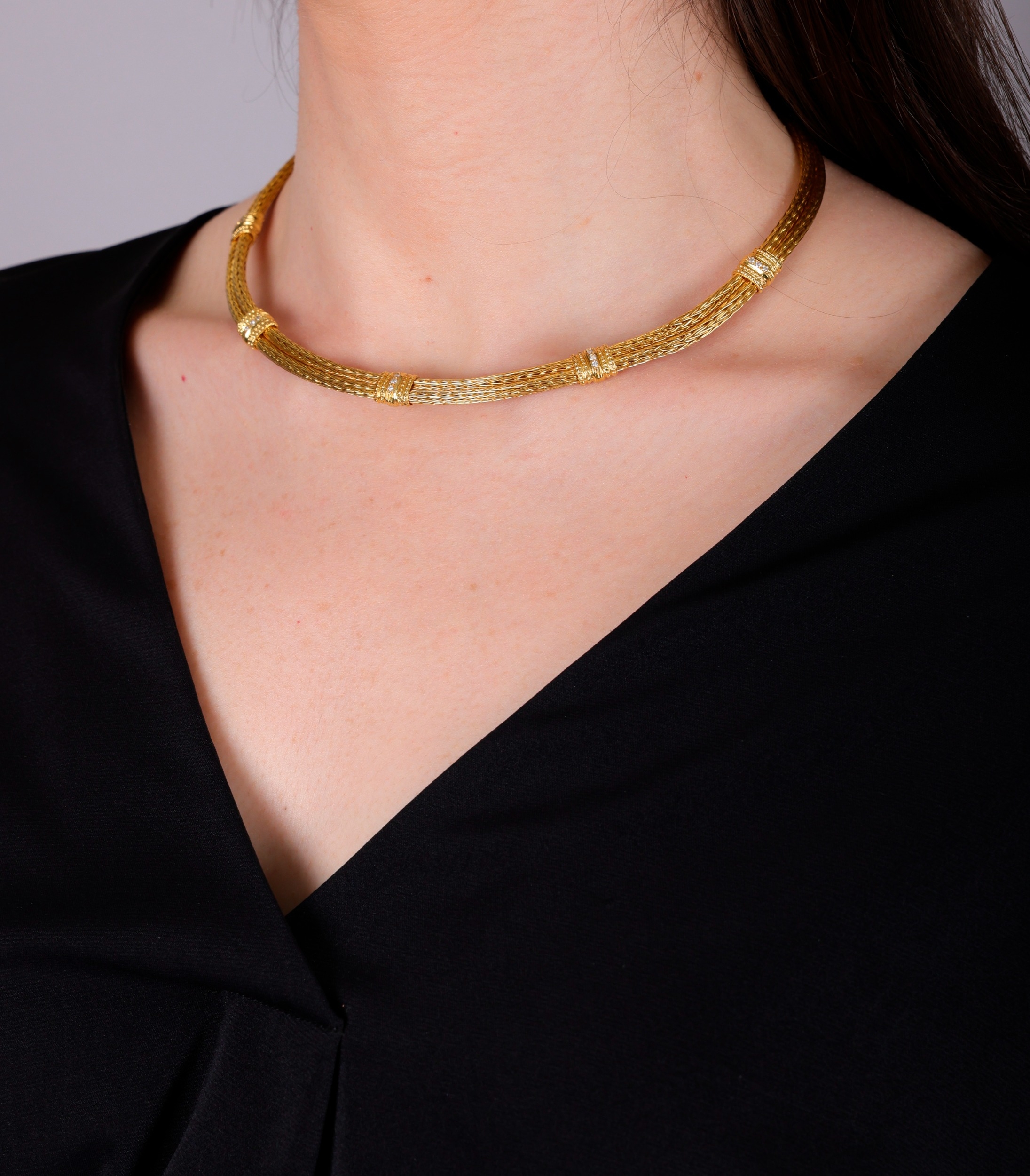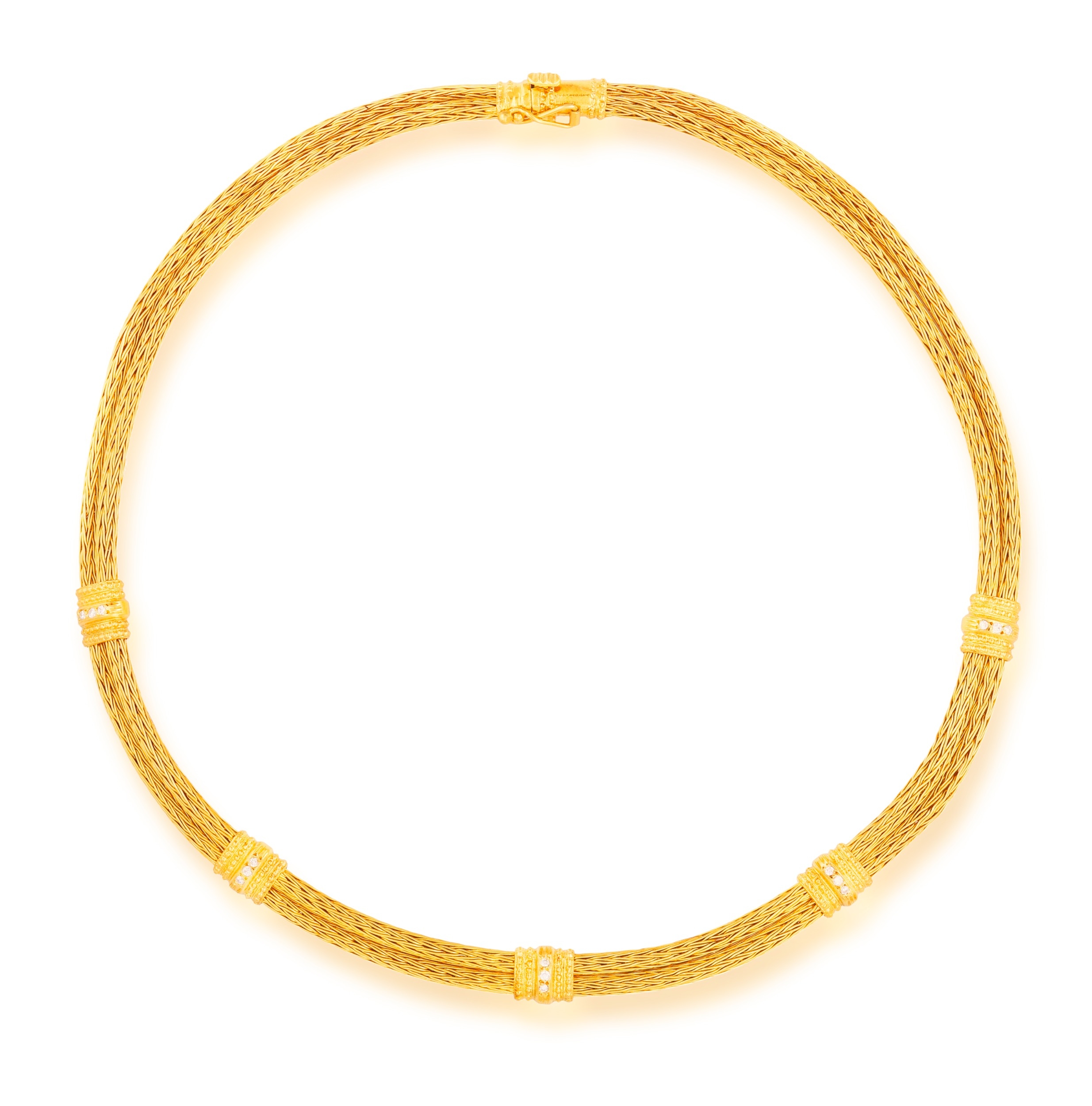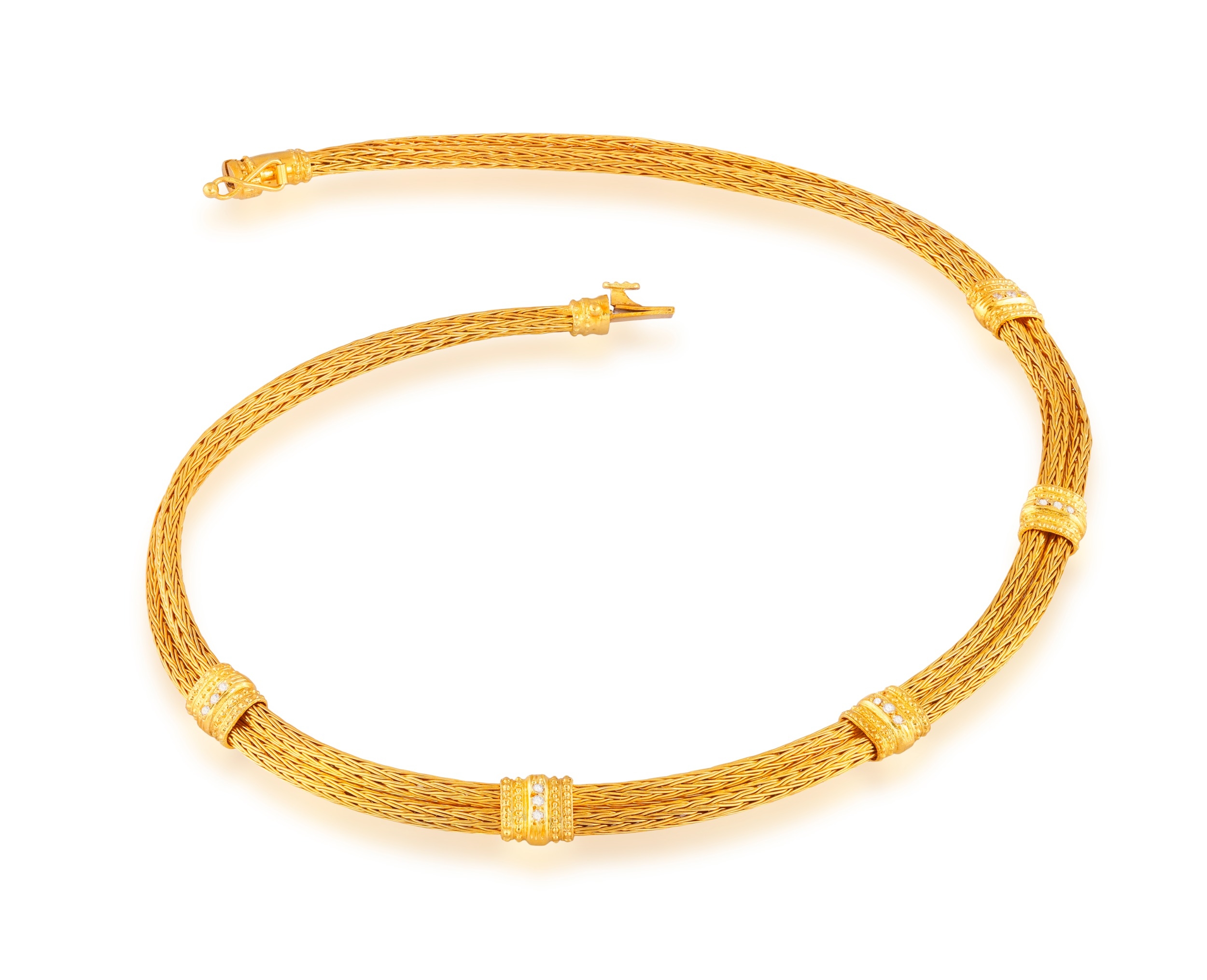 ILIAS LALAOUNIS: A DIAMOND AND GOLD NECKLACE Composed of a double herringbone rope twist chain, the frontispiece with five gold connectors accented with brilliant-cut diamonds and beading detailing, mounted in 18K gold, signed Ilias Lalaounis, numbered, with maker's mark, length approximately 41.5cm Ilias Lalaounis (1920–2013) was among the most original jewellers of the twentieth century, who transformed the buried forms of antiquity into jewels of striking, wearable modernity. Born in Athens into a family of goldsmiths with roots in Delphi, he came of age within the celebrated Zolotas firm before establishing his own house and, in time, becoming the only jeweller ever elected to the Académie des Beaux-Arts of the Institut de France. His Archaeological Collection of 1957 announced the terms of his ambition: that ancient Greek ornament, Mycenaean, Minoan, Hellenistic, could be not reproduced but genuinely reimagined. Granulation, filigree, hand-hammering and woven gold were treated not as historical curiosities but as living techniques, applied with sculptural confidence and a sure sense of presence. The results carried the gravity of the ancient world without its weight. What brought the house its international reach was the social world that gathered around it. Aristotle Onassis was among the first significant patrons, purchasing jewels for Maria Callas and later for Jacqueline Kennedy: a pair of names that placed Lalaounis simultaneously at the centre of Aegean glamour, operatic legend and American political history. Elizabeth Taylor, Barbra Streisand, Charlize Theron and Scarlett Johansson followed across subsequent decades, each lending the house a different register of cultural authority. In 1976, Empress Farah of Iran commissioned an entire collection inspired by Persian art, displayed at the Imperial Palace in Tehran. His connections extended beyond patronage into creative friendship. When Salvador Dalí became too frail to continue designing the ceremonial swords presented to new members of the Académie des Beaux-Arts, he named Lalaounis to carry on the work; a detail that speaks to the esteem in which he was held among the wider artistic world. His retrospective was staged at the Sorbonne Chapel; his Helen of Troy collection toured the Penn Museum in Philadelphia; in 1992 he designed the Olympic torch. When he formally founded Ilias Lalaounis – Greek Gold S.A. in 1969, the house expanded steadily: Paris near Place Vendôme, then Zurich, Geneva, London, Tokyo and Hong Kong, each opening accompanied by a collection drawn from the local cultural inheritance. He founded the Greek Jewellers' Association and trained hundreds of goldsmiths, shaping the broader language of modern Greek jewellery as much as his own. His legacy found lasting form in the Ilias Lalaounis Jewelry Museum, opened in 1994 at the foot of the Acropolis, housing more than 4,500 pieces alongside a gallery dedicated to his commissions for international figures. The house continues today under the direction of his four daughters.