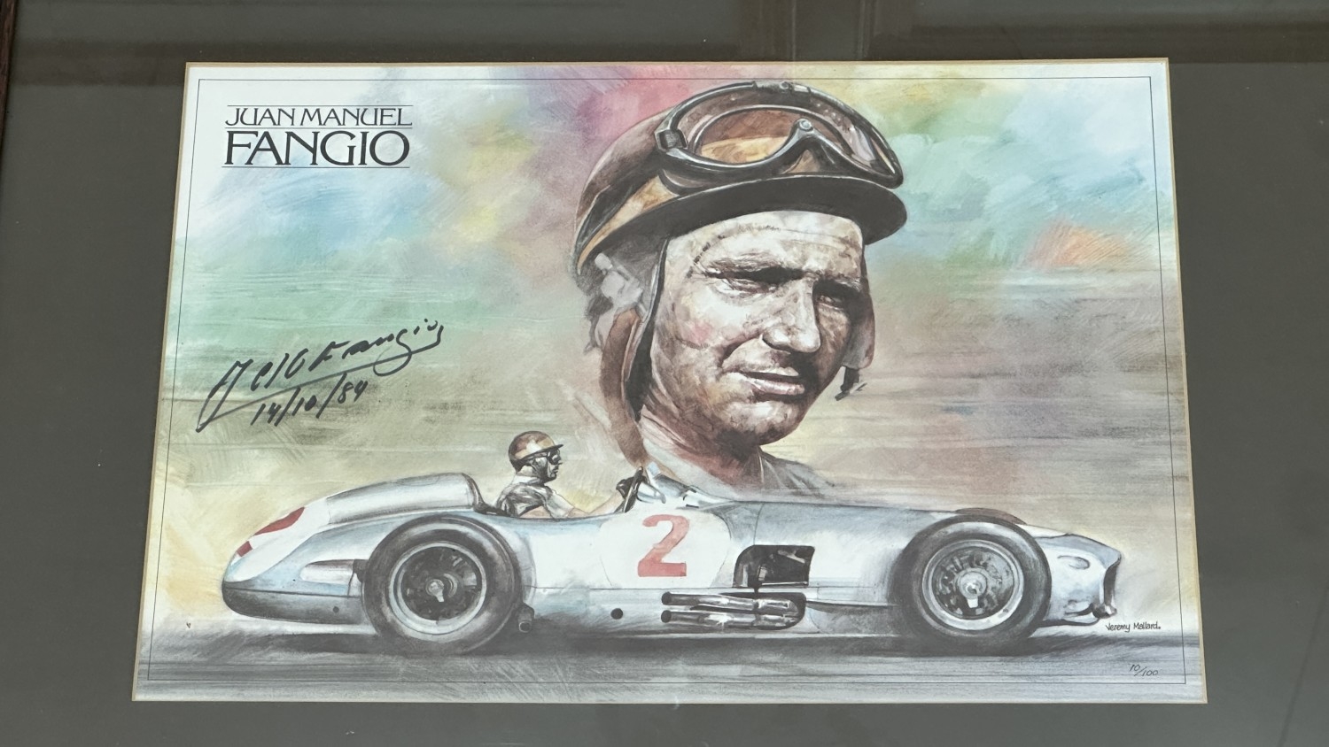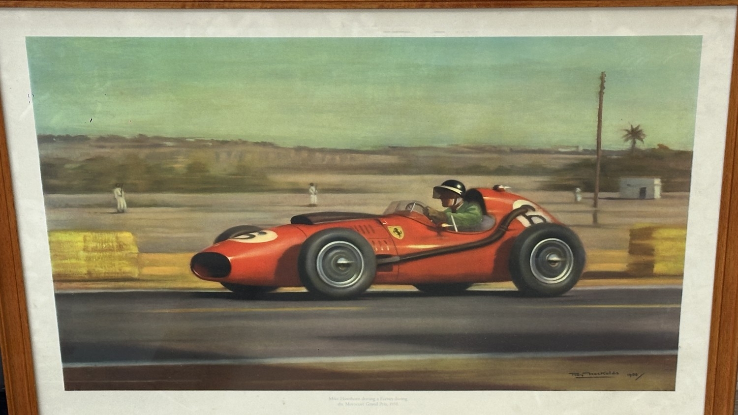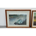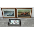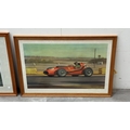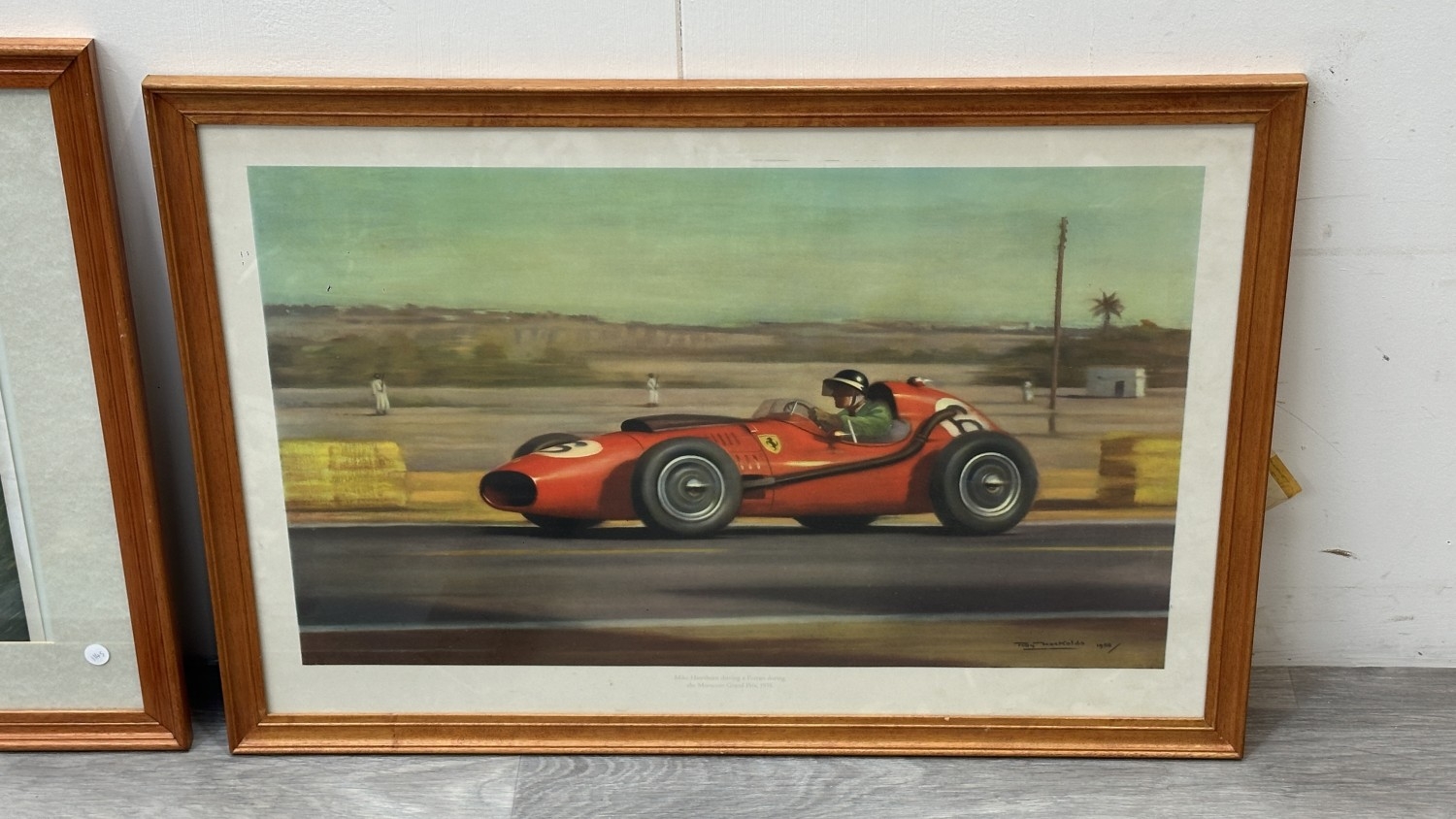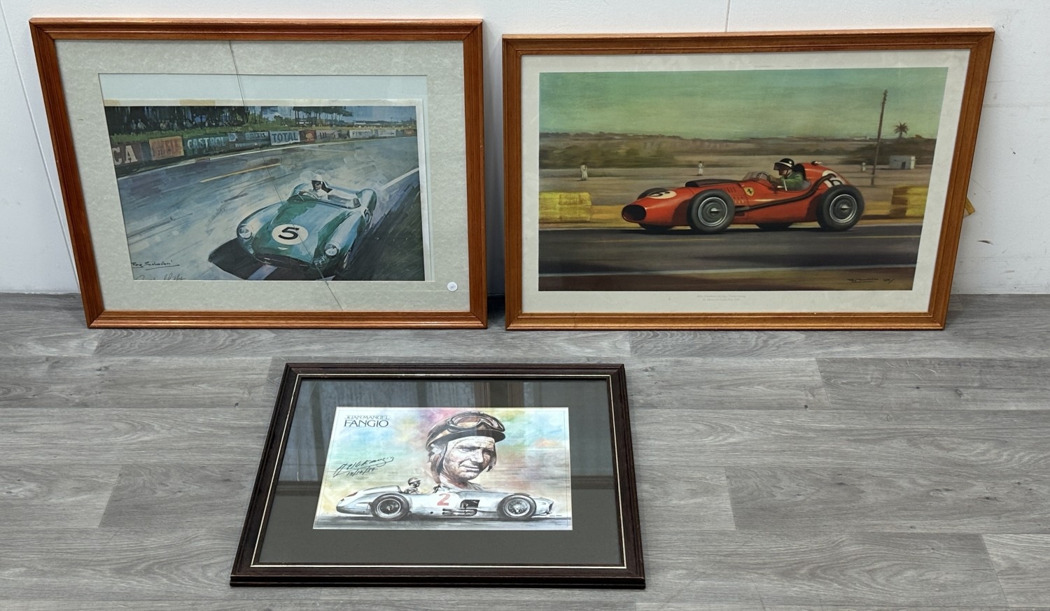Three framed racing car prints, one Jeremy Mallard 'Juan Manuel Fangio' limited edition 10/100 signed by Fangio and dated 1987, one Roy Salvadori and one Roy Nockolds depicting Mike Hawthorn driving a Ferrari during the Moroccan Grand Prix 1958 - largest approx. 59cm high x 76cm wide