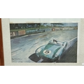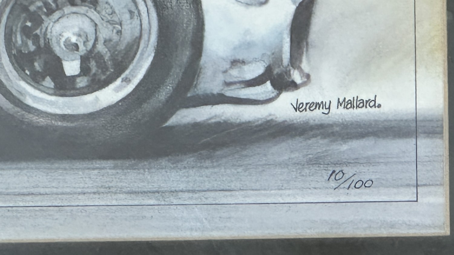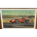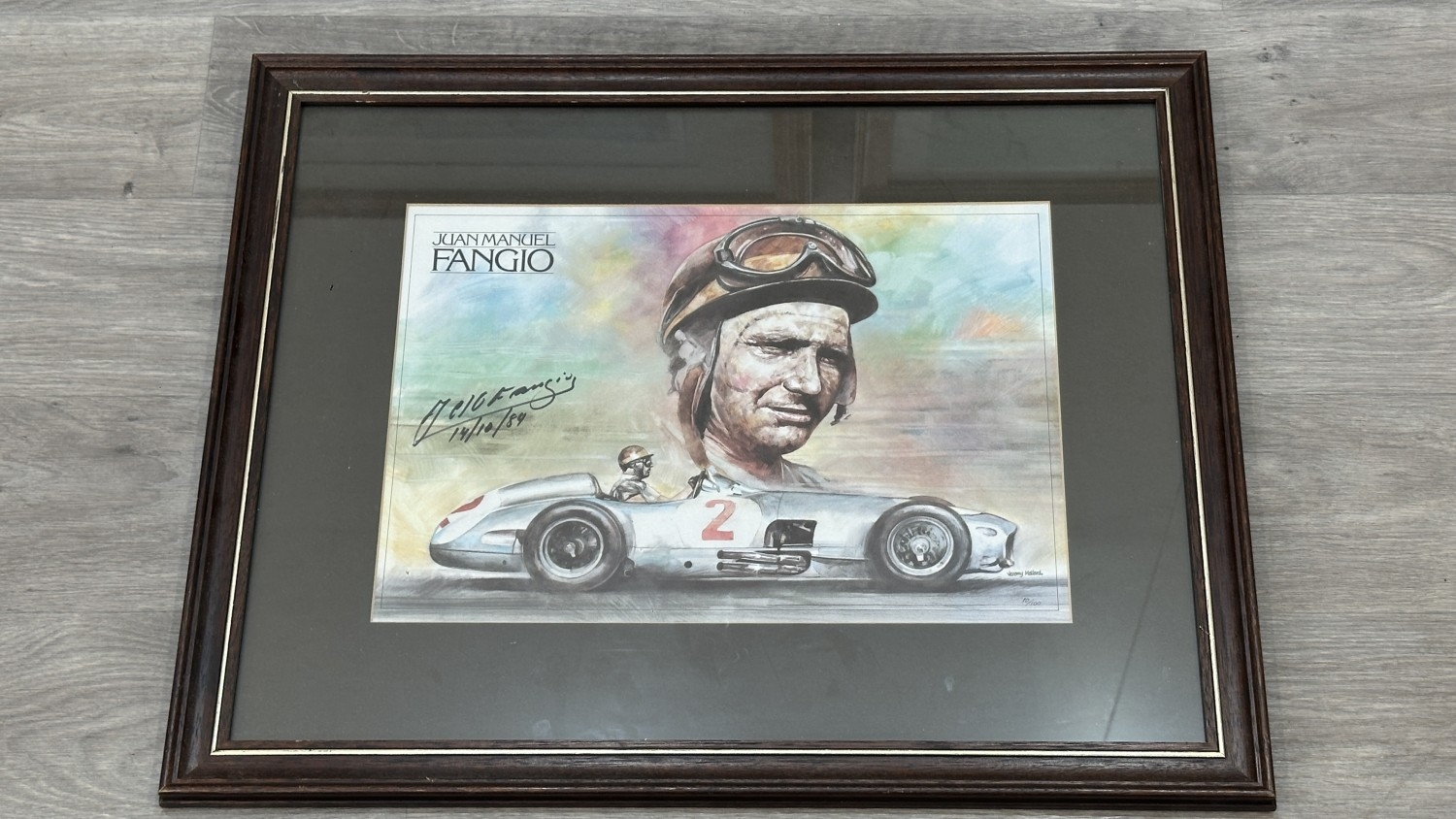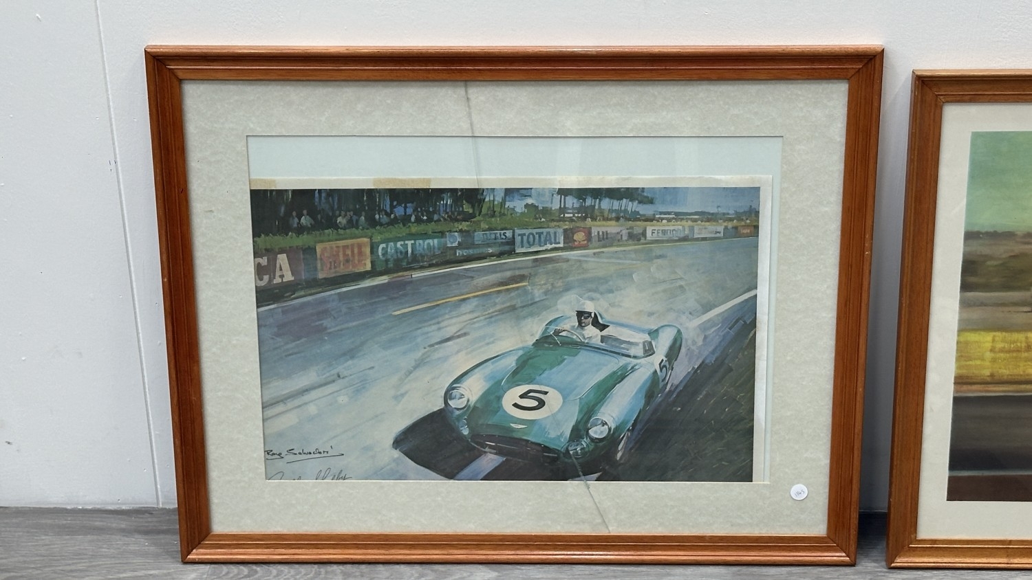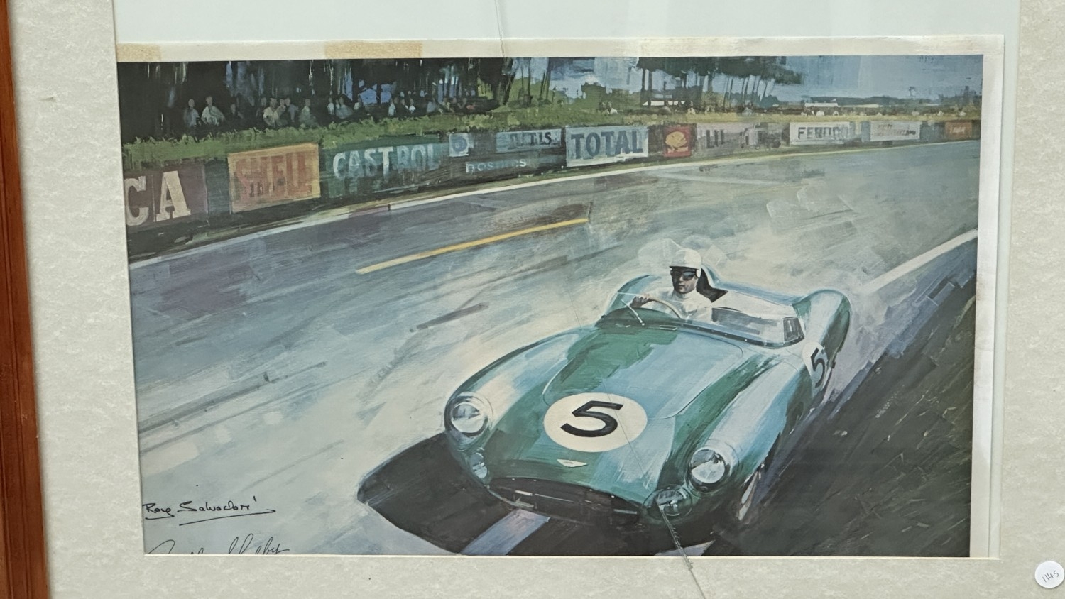 Three framed racing car prints, one Jeremy Mallard 'Juan Manuel Fangio' limited edition 10/100 signed by Fangio and dated 1987, one Roy Salvadori and one Roy Nockolds depicting Mike Hawthorn driving a Ferrari during the Moroccan Grand Prix 1958 - largest approx. 59cm high x 76cm wide