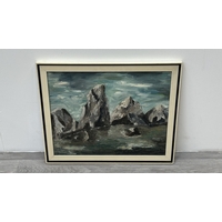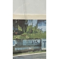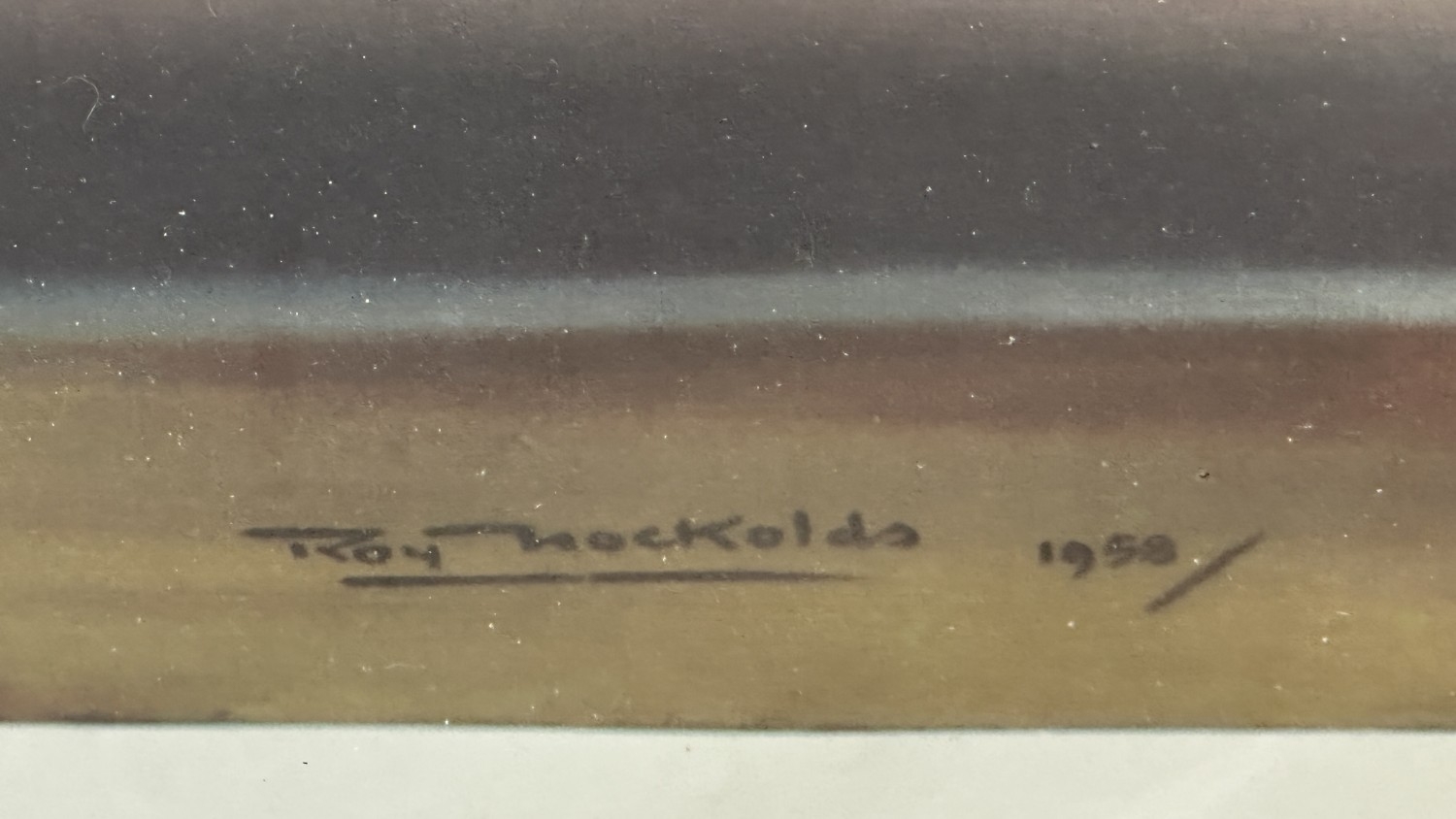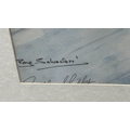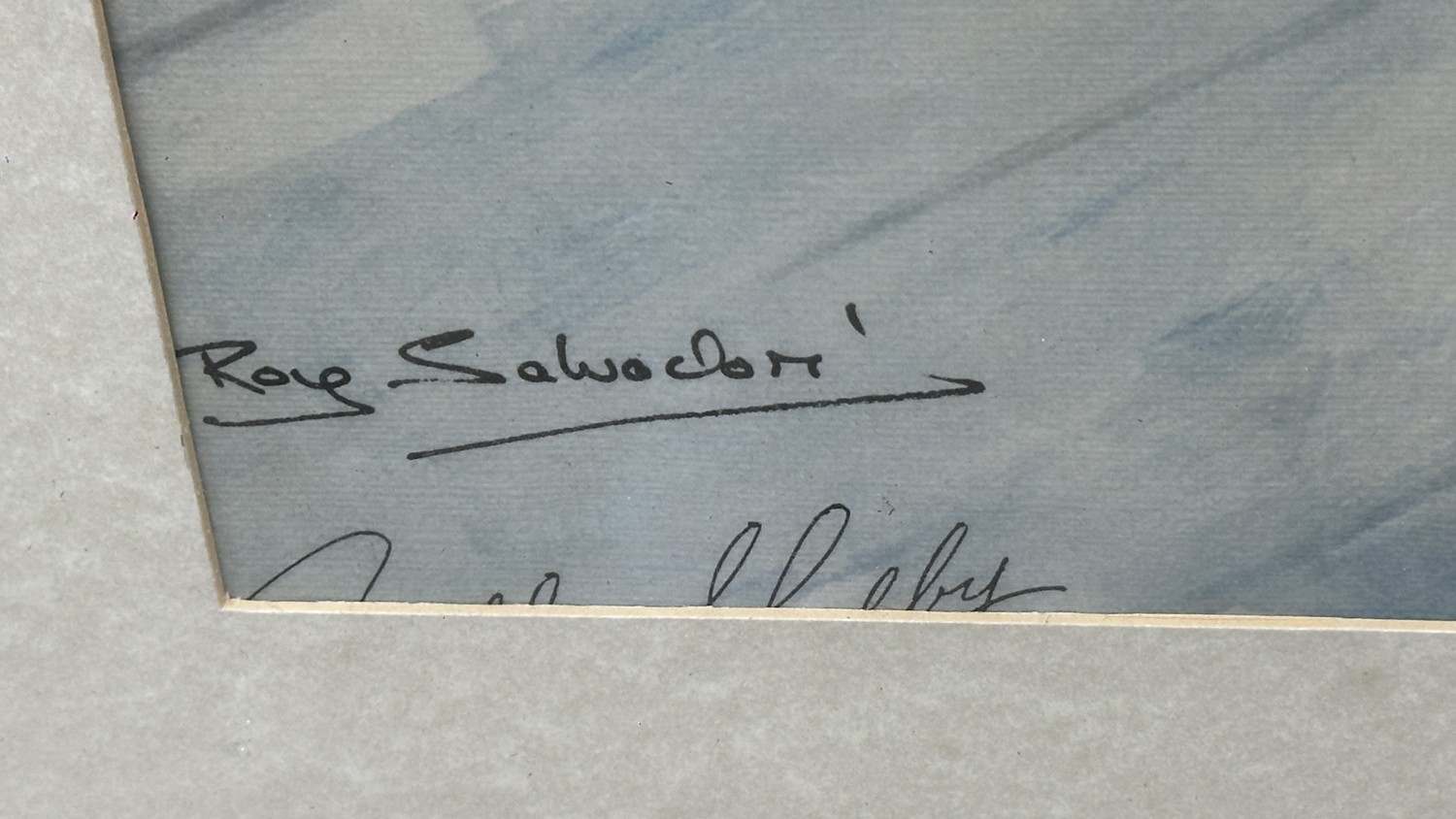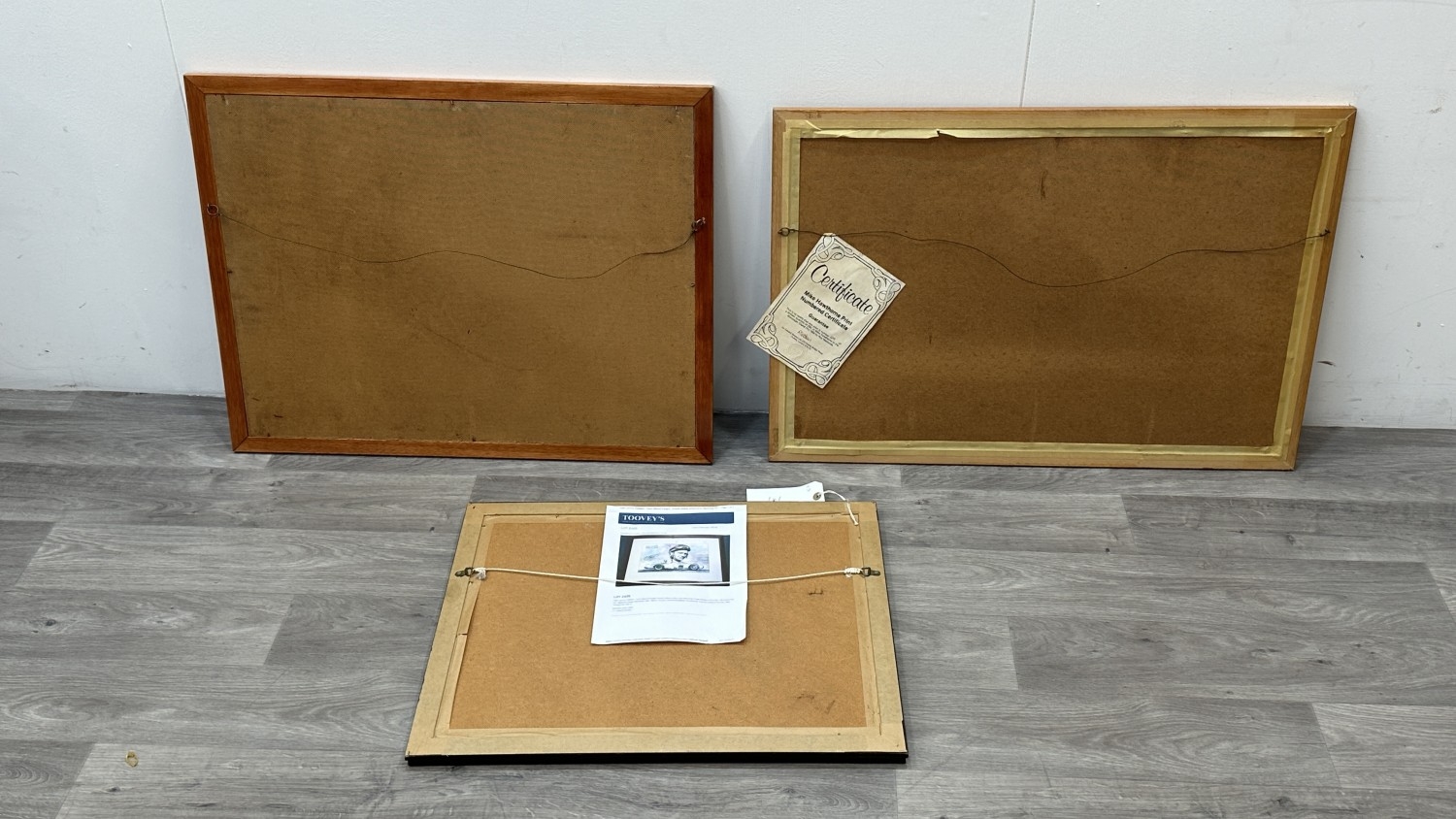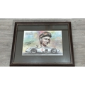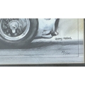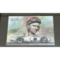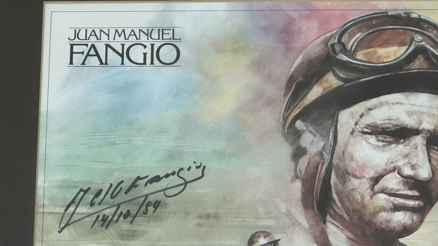 Three framed racing car prints, one Jeremy Mallard 'Juan Manuel Fangio' limited edition 10/100 signed by Fangio and dated 1987, one Roy Salvadori and one Roy Nockolds depicting Mike Hawthorn driving a Ferrari during the Moroccan Grand Prix 1958 - largest approx. 59cm high x 76cm wide
