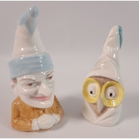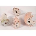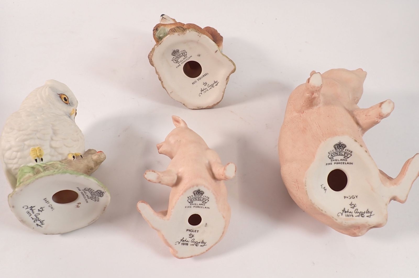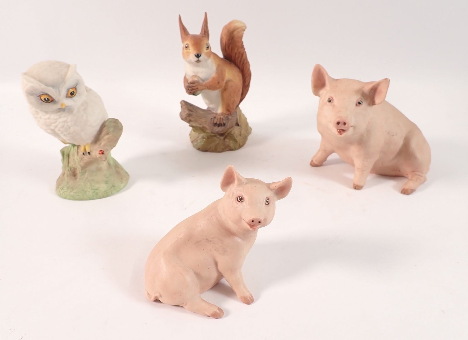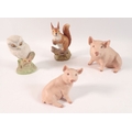 Four Aynsley bisque groups of an owl, pigs and squirrel, largest 12cm