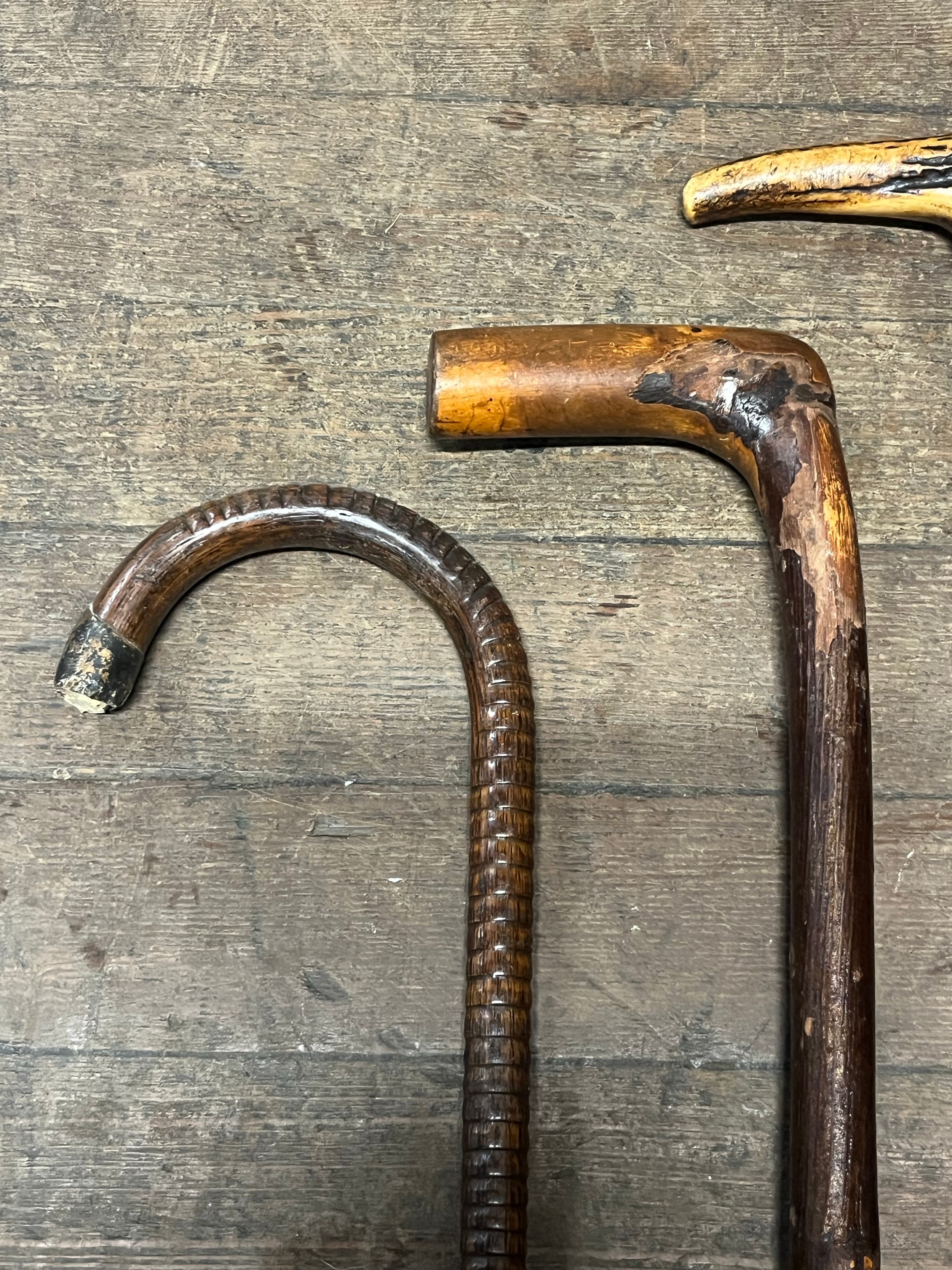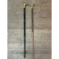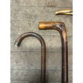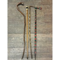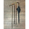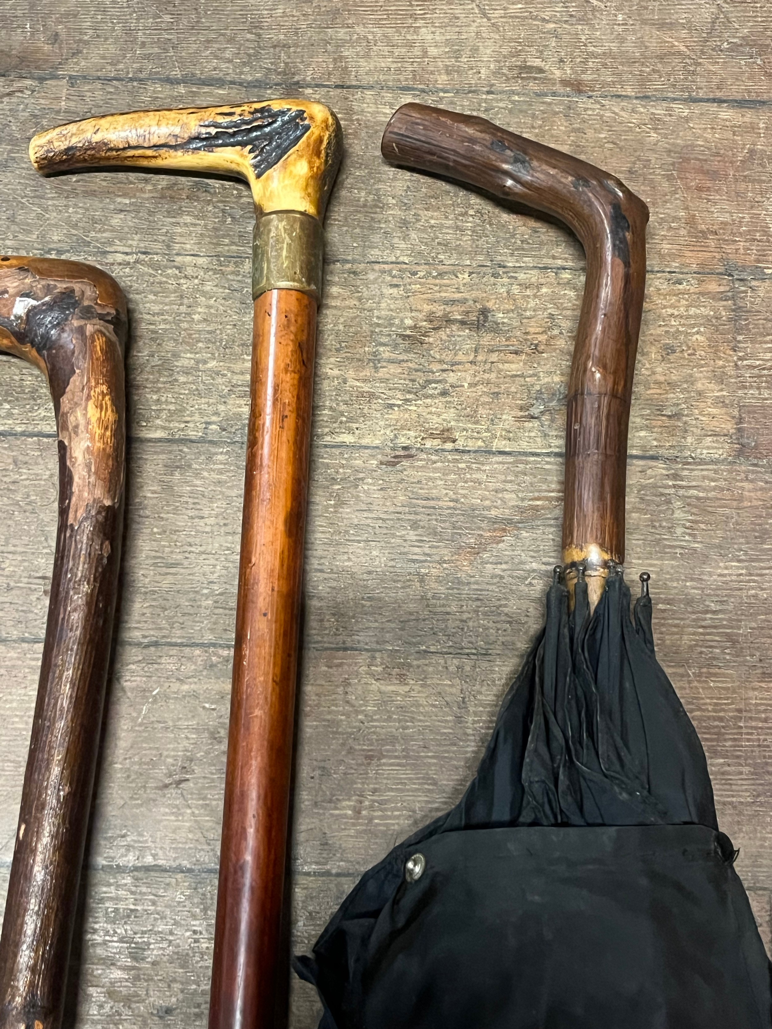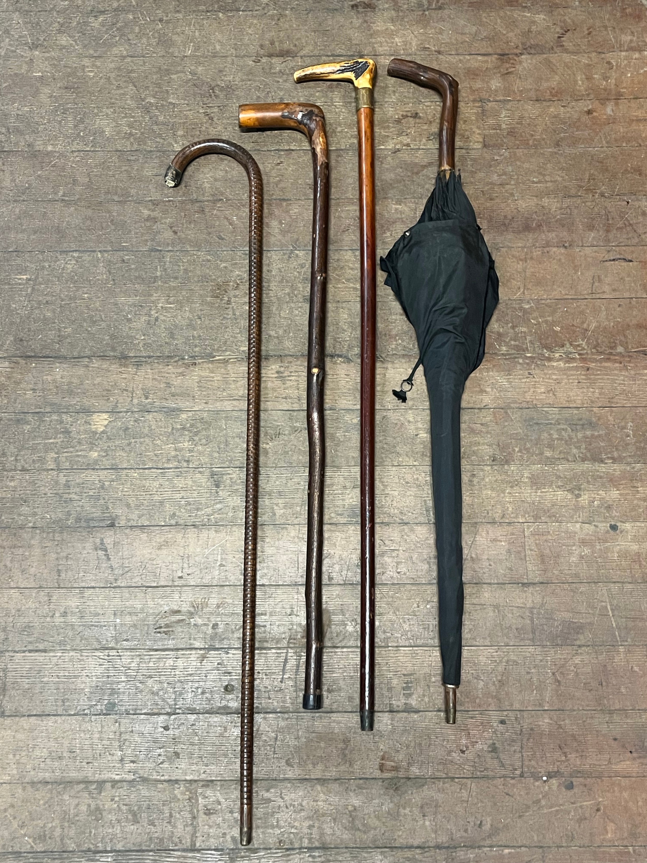 3 antique walking sticks/canes and one umbrella.