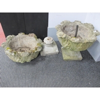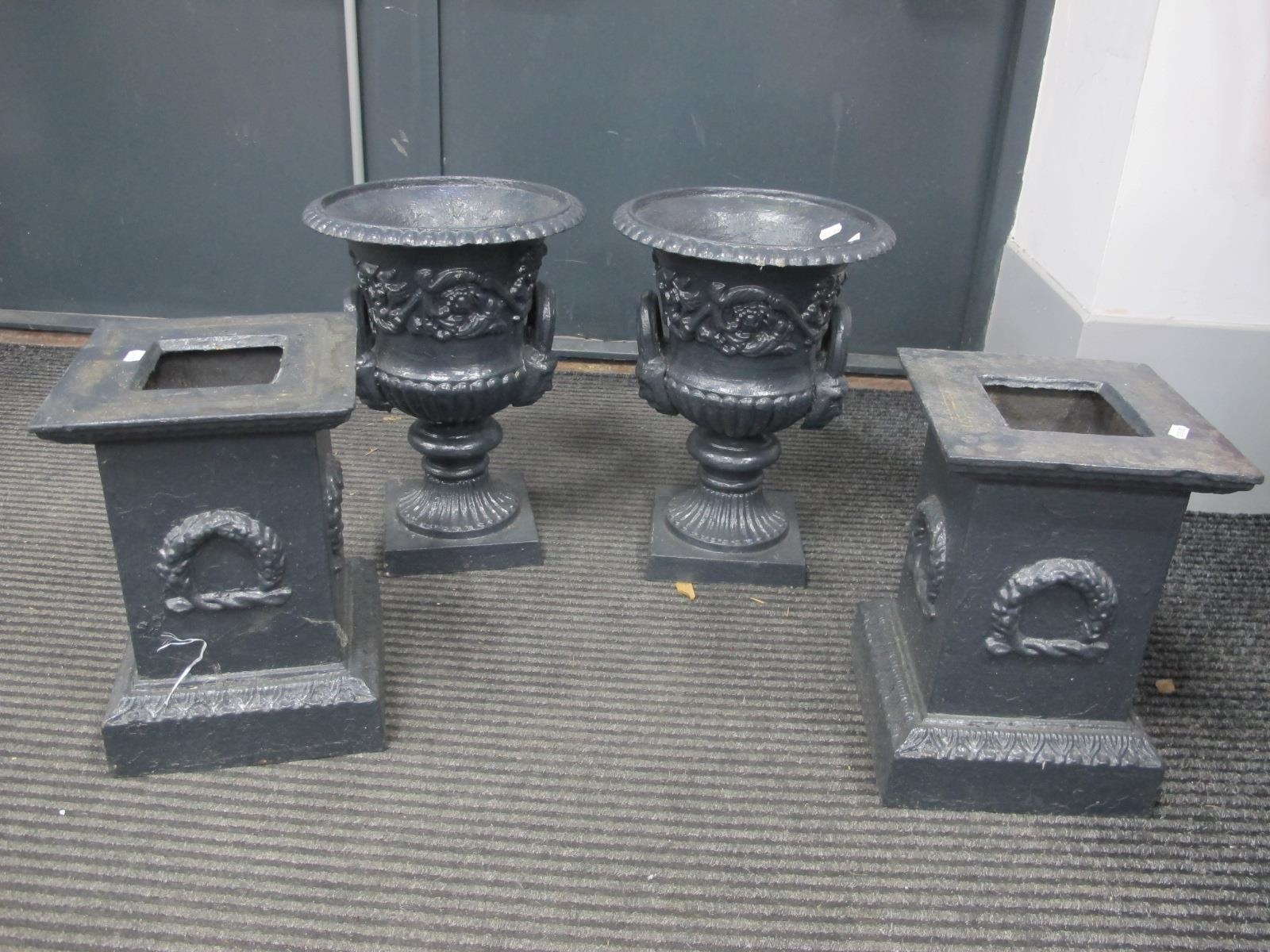 A Pair of Painted Cast Iron Garden Urns, with egg - dart decoration, twin handles, on stands 68cm high.