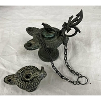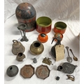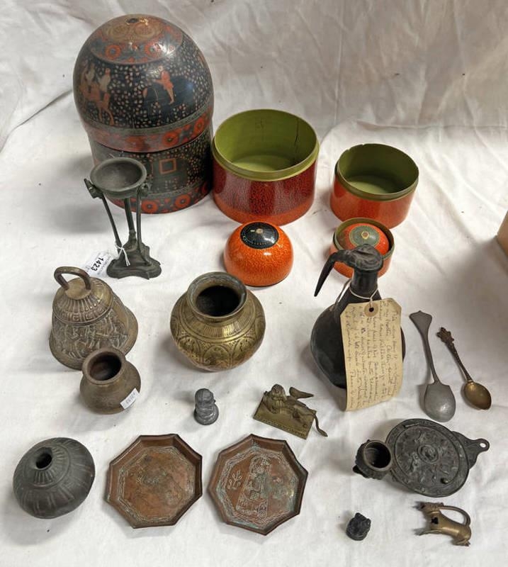 MIDDLE EASTERN LACQUERED NESTING BOXES DECORATED WITH FIGURES, INTERESTING 19TH CENTURY FIRE DEVIL RETORT WITH OLD LABEL, OIL LAMP, ETC.