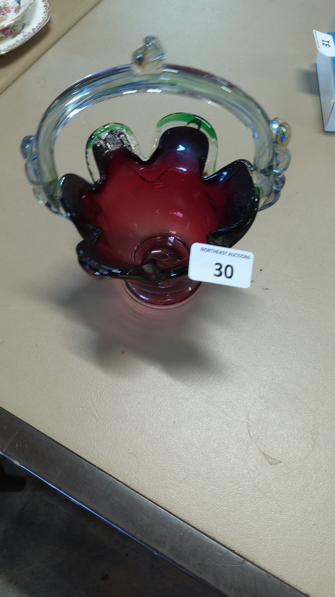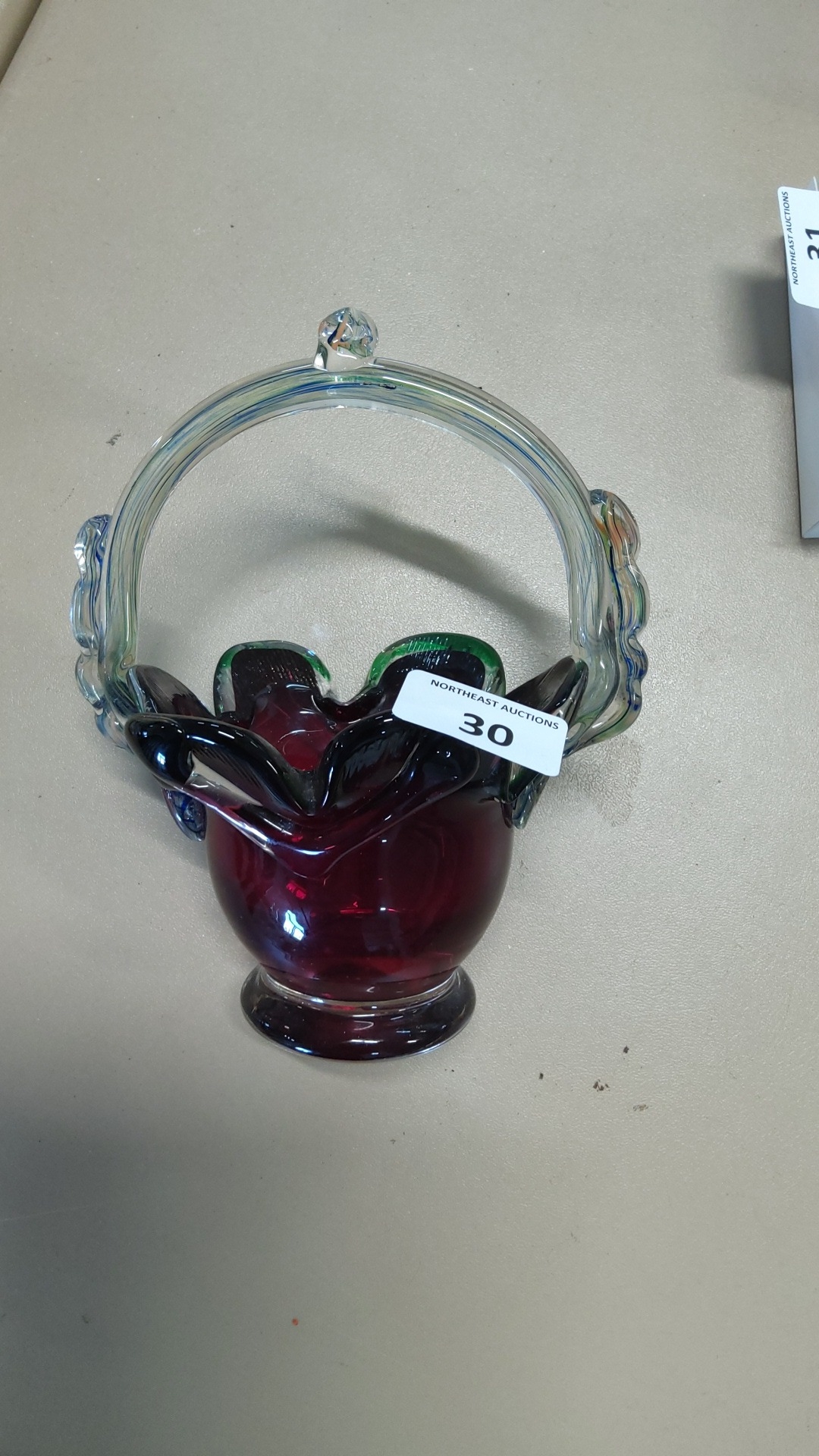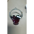 A hand-blown art glass basket, the cranberry glass body with ruffled rim and green-to-black shaded edging, raised on a circular foot, with clear applied swing handle and rigaree terminals.