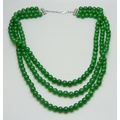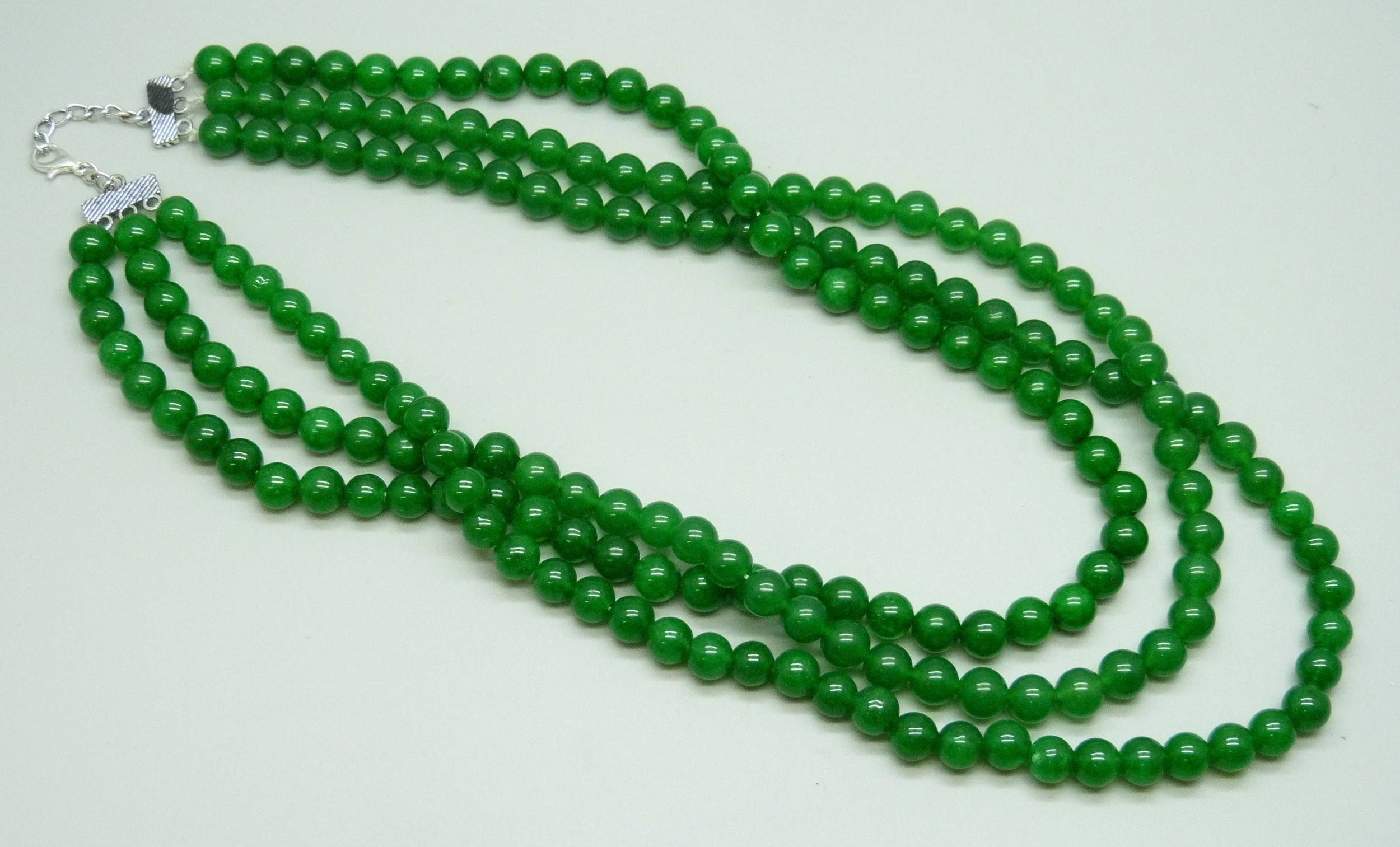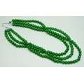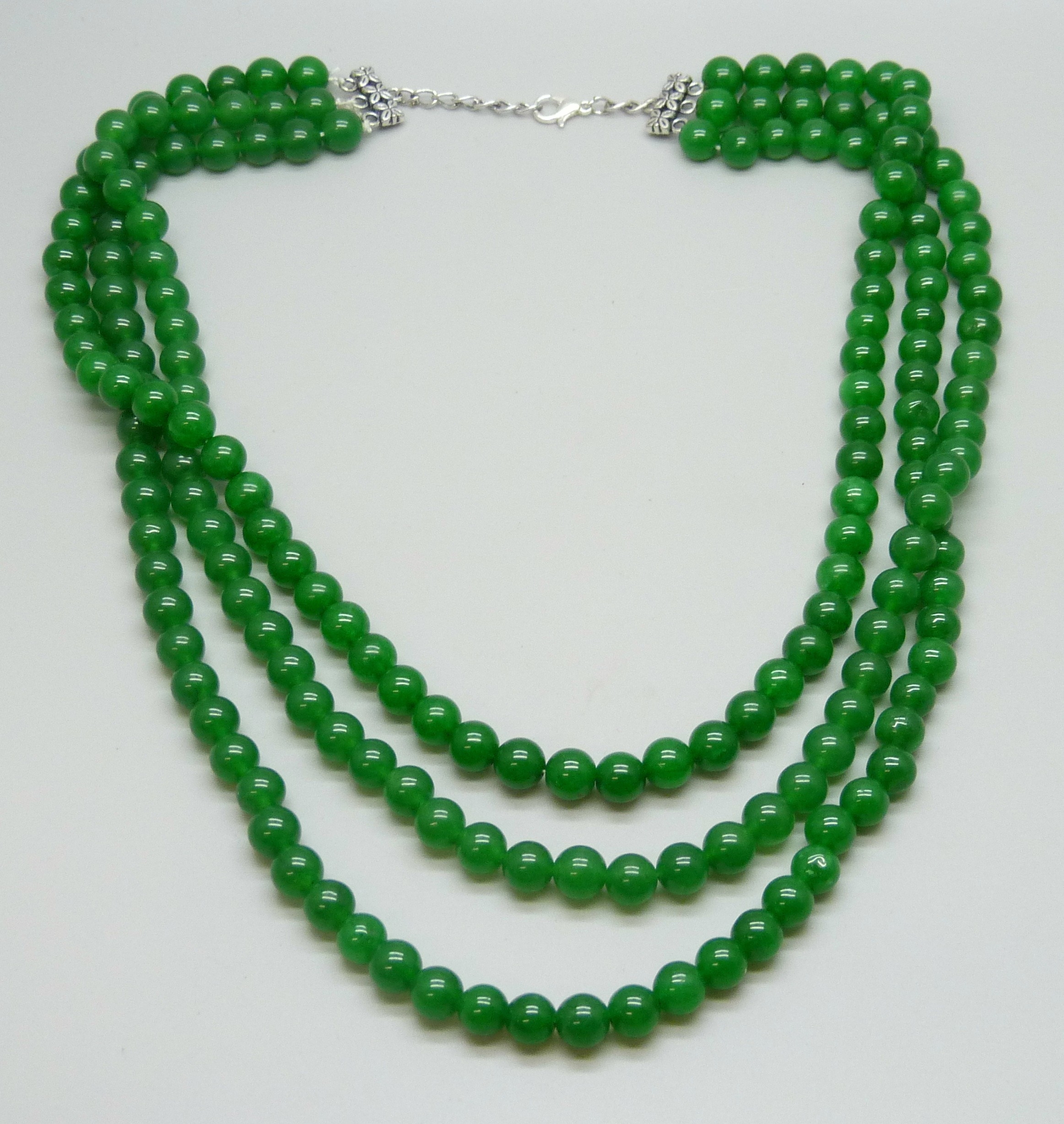 A three strand green stone necklace with a plated clasp, 136g