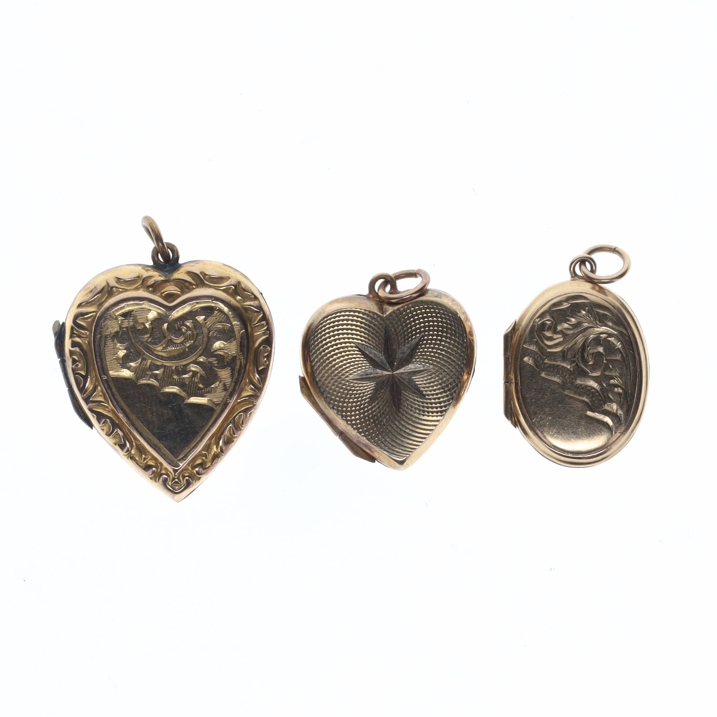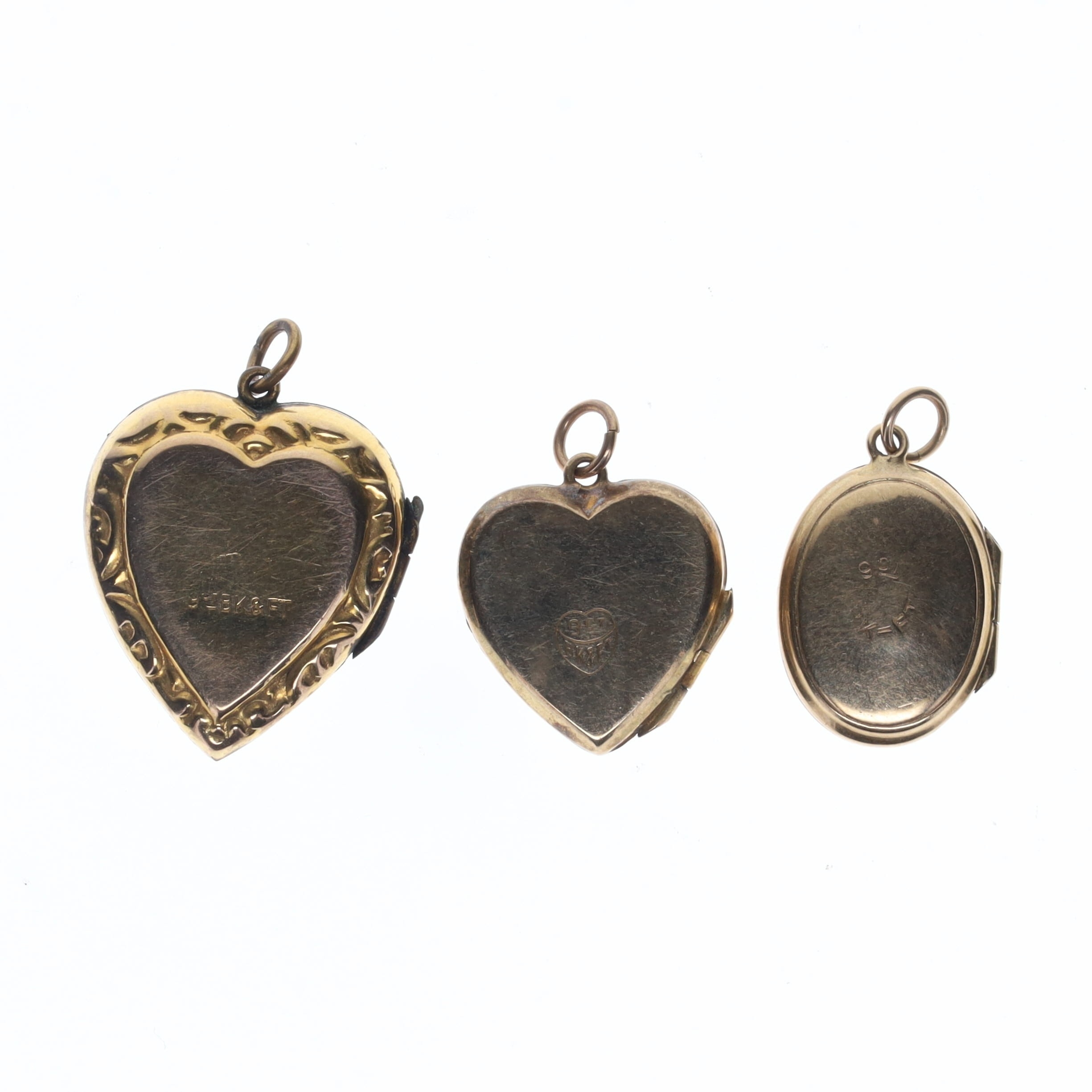 9ct Gold Back And Front Locket Pendants Collection inc. Etched, Heart. They have been tested as gold back and front. All clasps are in working order. Weighs in total 8.7g.