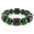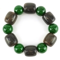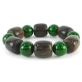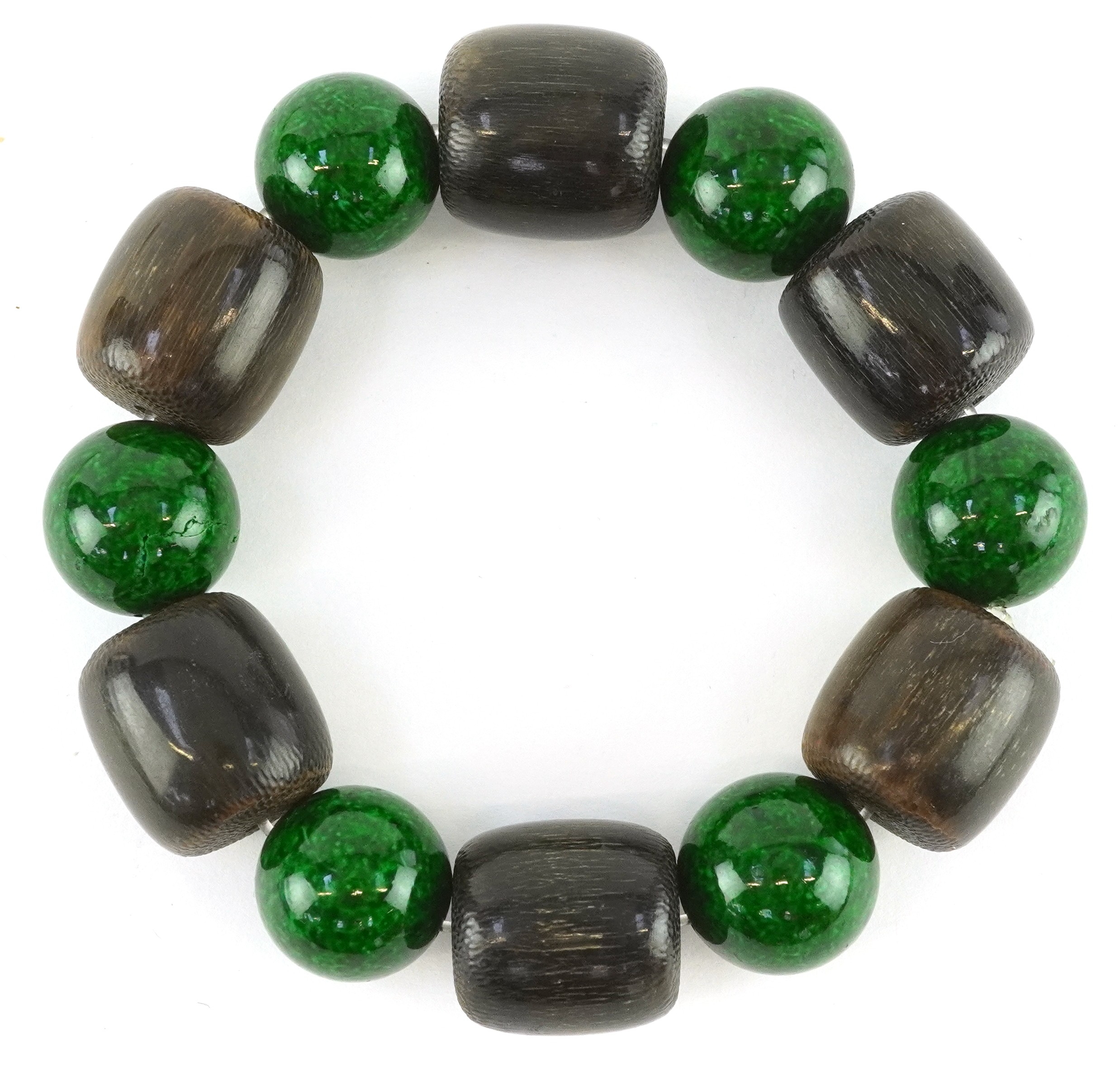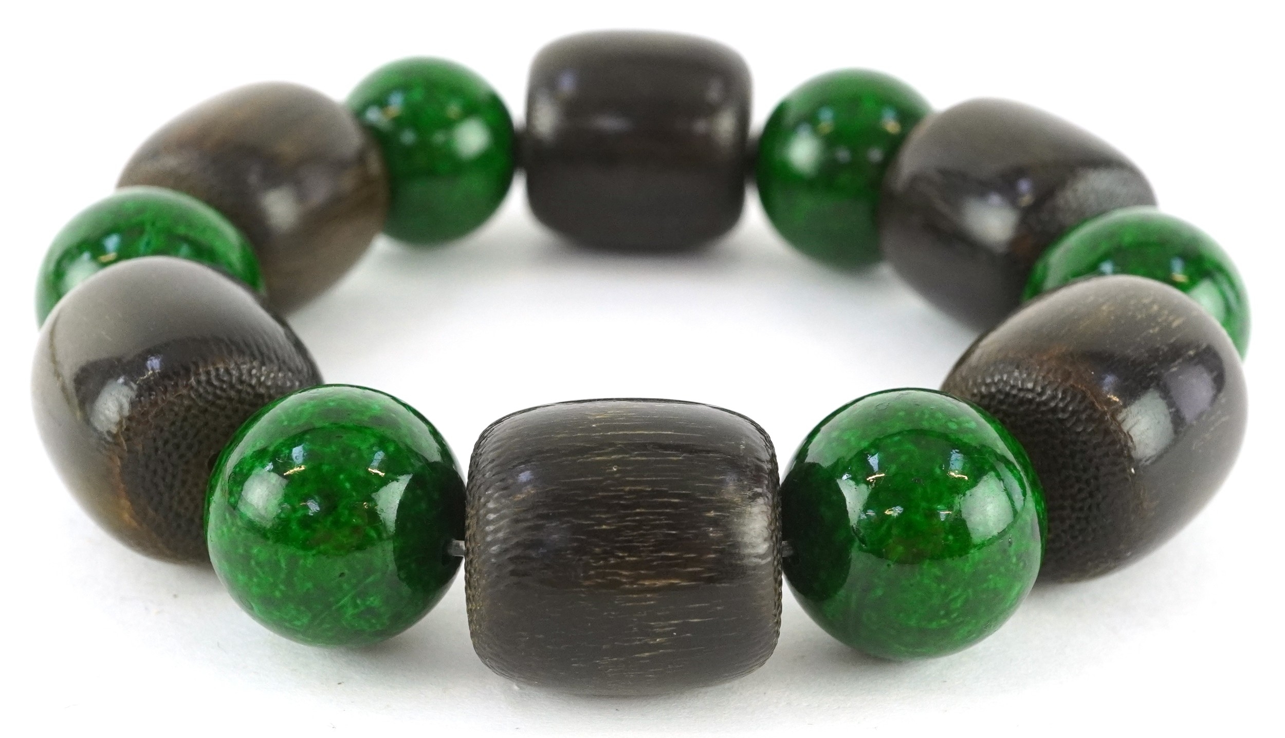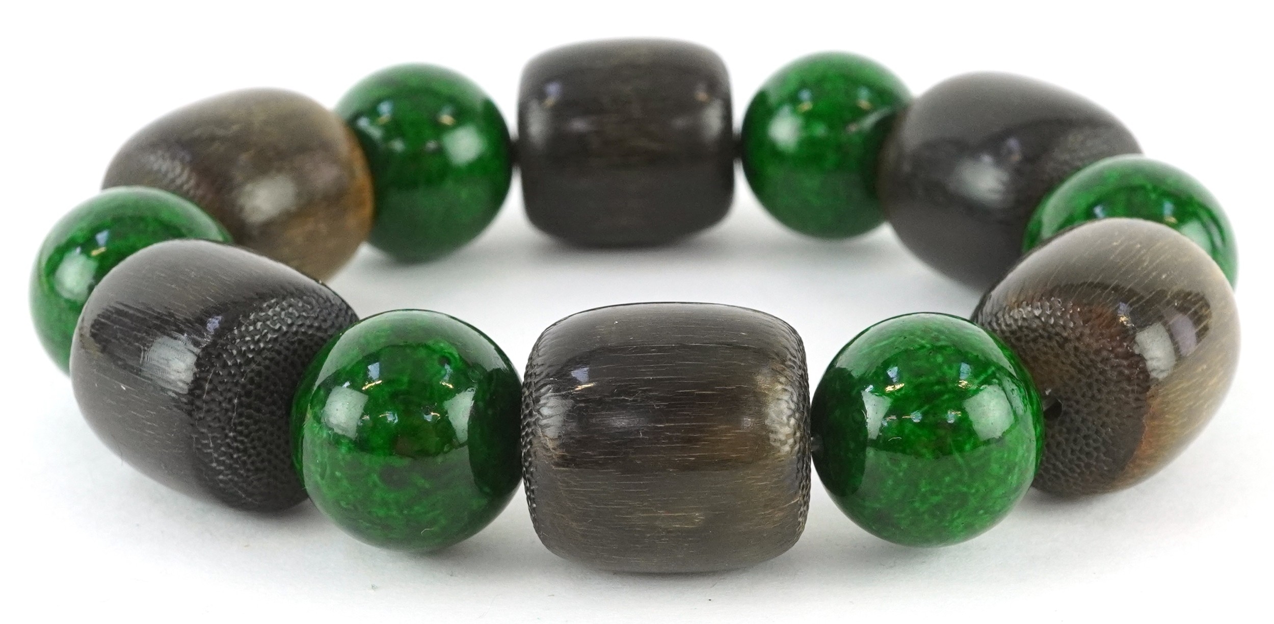 A Chinese green stone and horn bead bracelet, the largest beads approximately 17.7mm x 19.3mm, 82.4g.