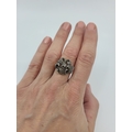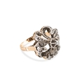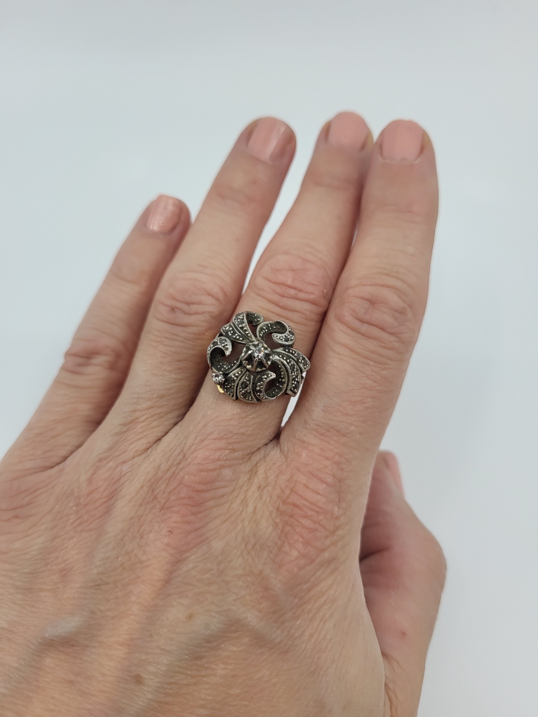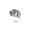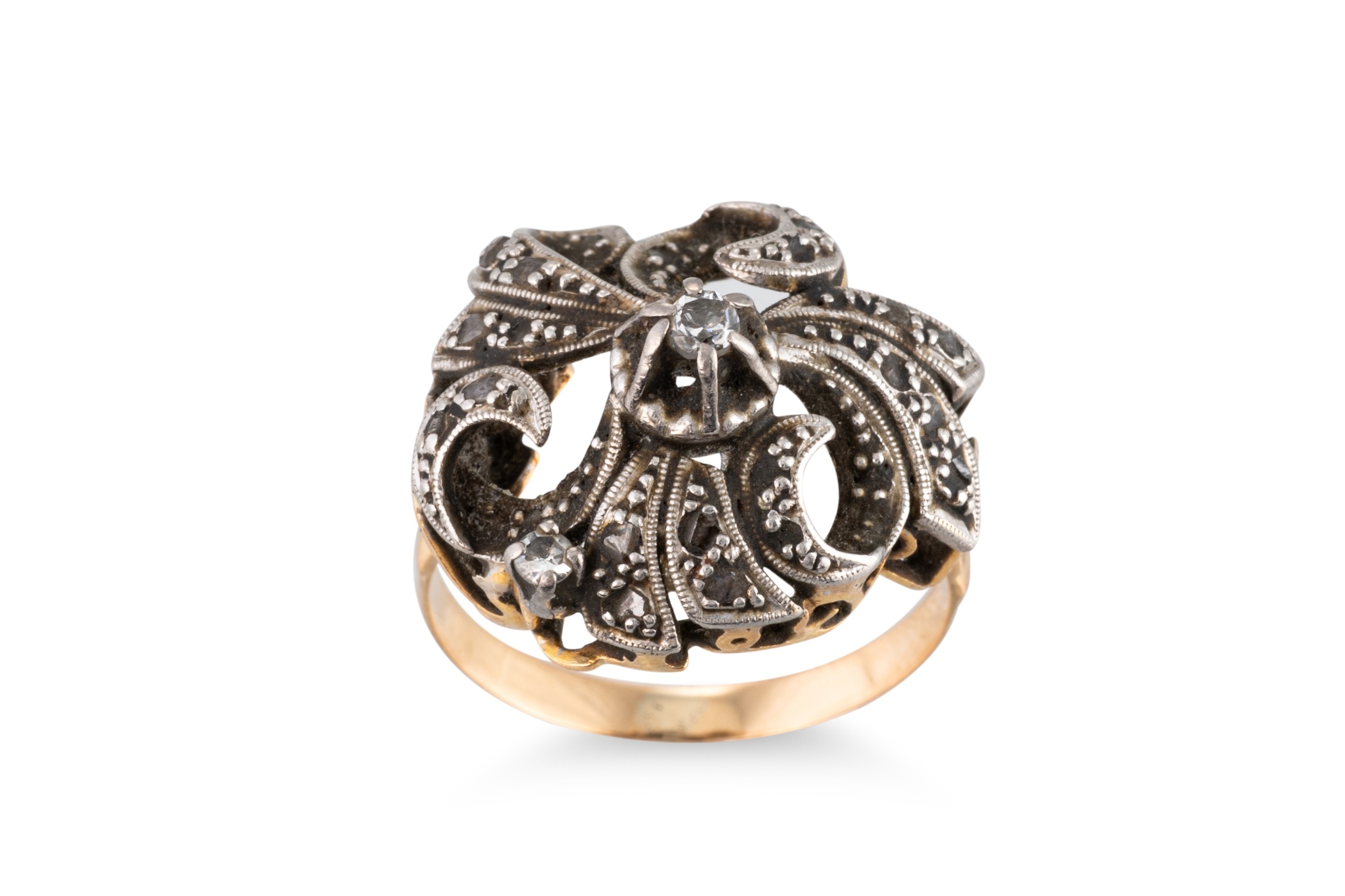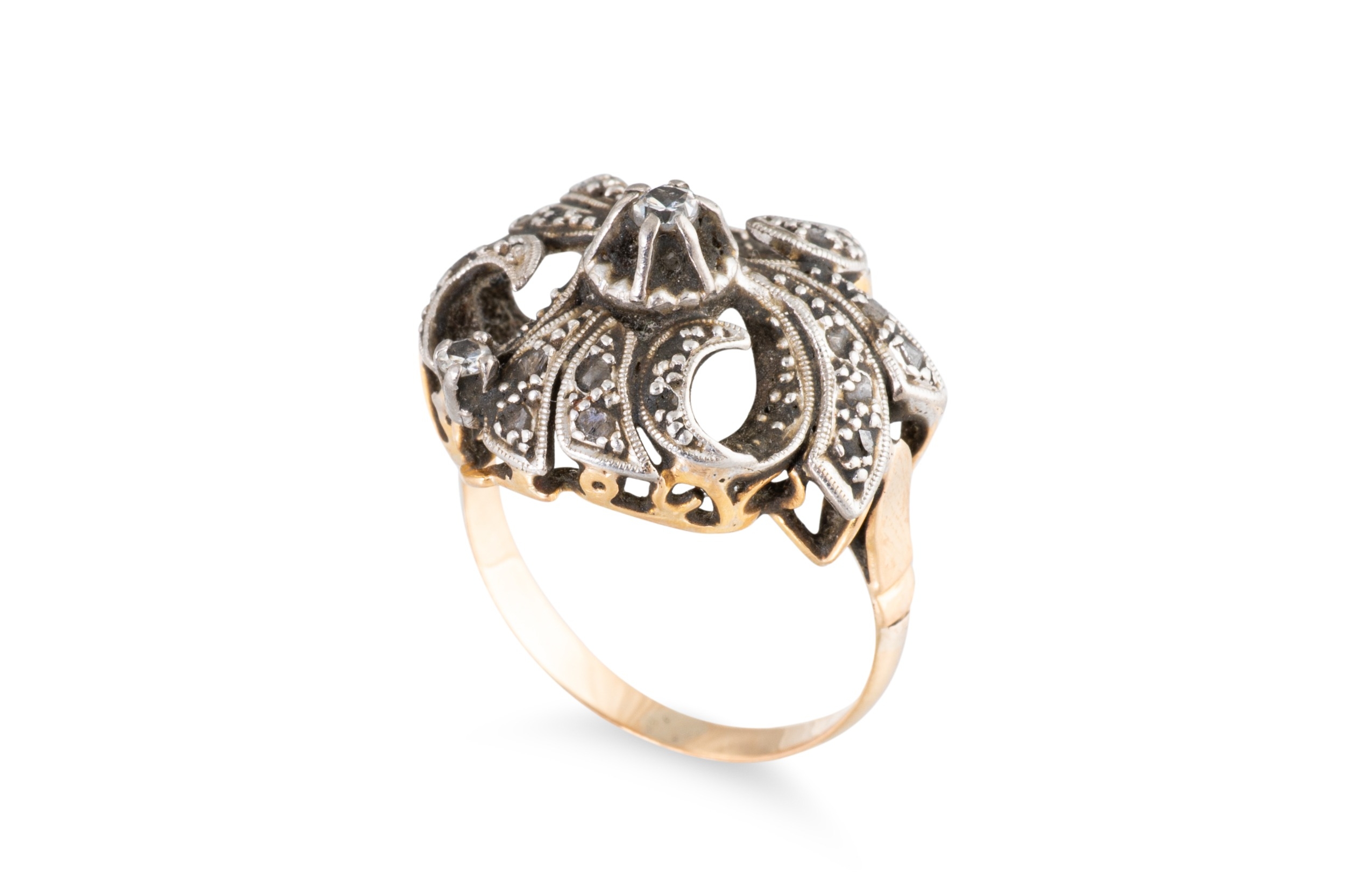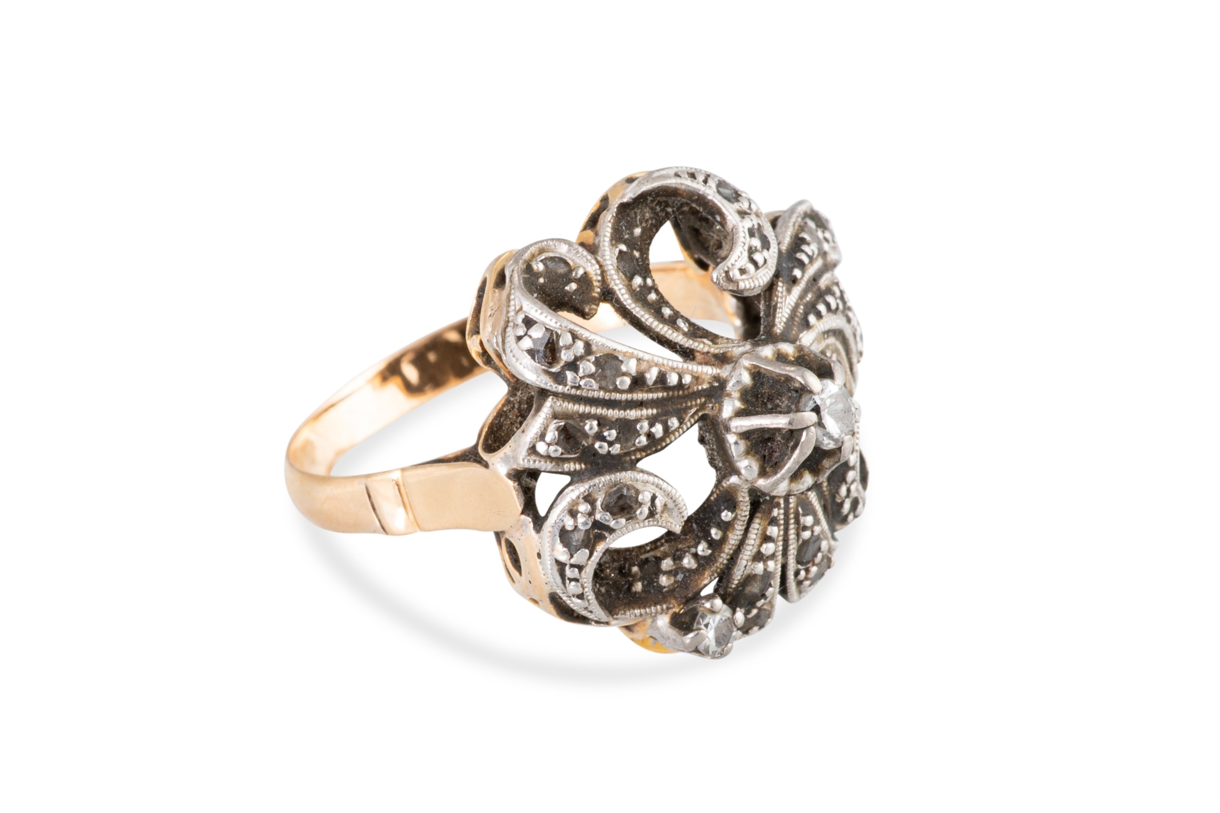 AN ANTIQUE DIAMOND CLUSTER RING, the single & rose cut diamonds mounted in 18ct yellow gold and silver (.925), size N