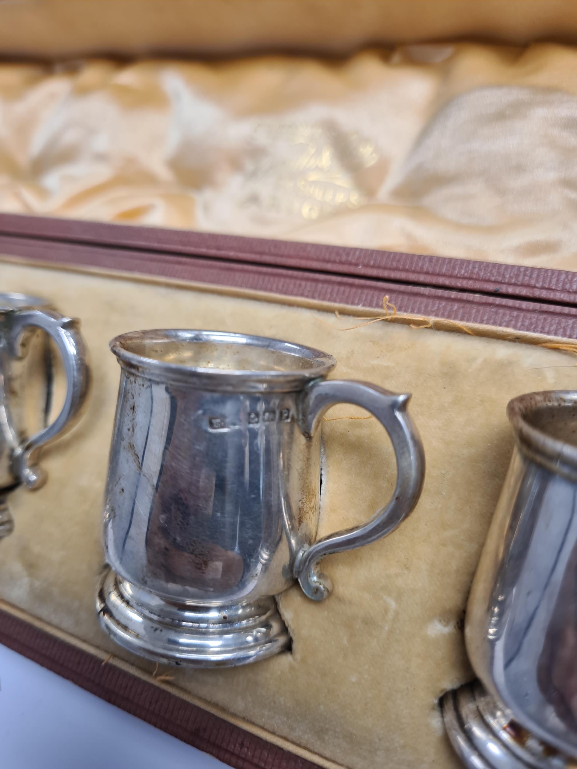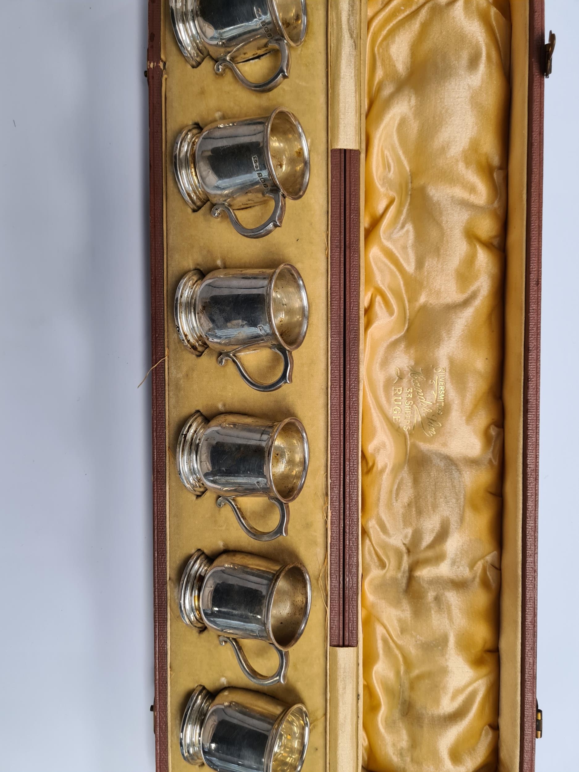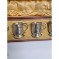An attractive cased set of six silver top cups in the form of tankards, by E S Barnsley and Co., Birmingham 1914. Condition Report: No obvious damage seen 5.74ozt approx