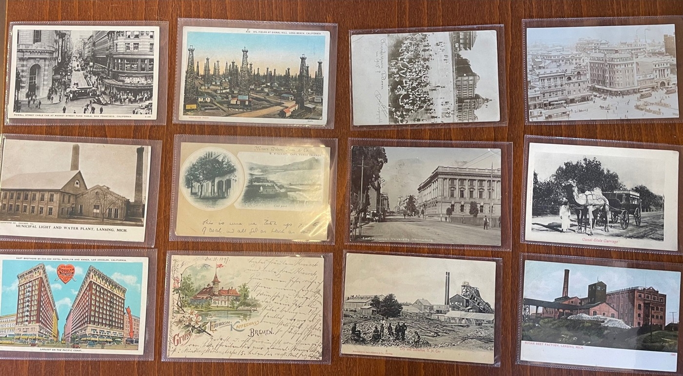 Misc. loose coln. of foreign and UK cards. Foreign incl. South Africa incl. bathing Church Square Pretoria 1915, Transvall University Johannesburg, City and Suburban Durban, Johannesburg South West, etc. Germany, Grus Aus types, Canada, Egypt, Ceylon, Camel State Carriage Bombay, Aden, France, S. Vincent Cape Verde Islands with Coal Yard, USA incl. Powell Street Cable Car at Market Street Turn Table San Francisco California, Municipal Light and Water Plant Lansing Mich., Sugar Beet Factory Lansing Mich., Oil Fields at Signal Hill Long Beach California etc. UK topo. incl. Harrogate Royal Baths and Royal Pump Room, Knaresboro, Iver Village, Old Princes Risborough, Dachet Village, Batsford, Elstow Village, Guests at Allington House Bournemouth, Wellington Avenue Aldershot with cavalry, Newmarket Rutland Hill with horses, Souvenir of the Rossendale Parliamentary Election Jan 21st 1910, Hale Road Hale, Peterborough Cathedral H.T.L., Scotland, Ireland, Wales, IoW, London, Folkestone, Bournemouth, unident. portraits incl. soldiers, nurses etc. 900 approx (2T)