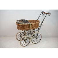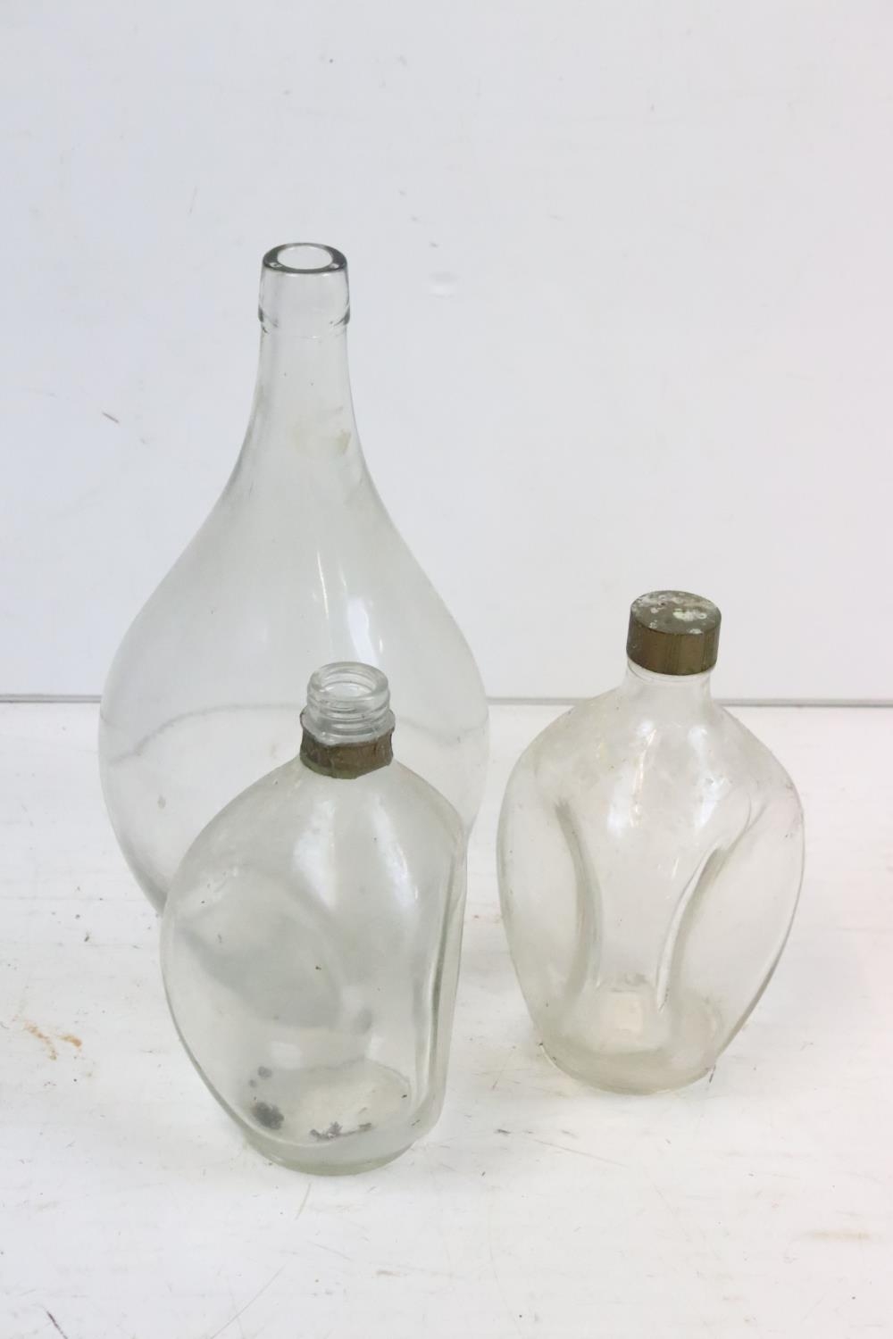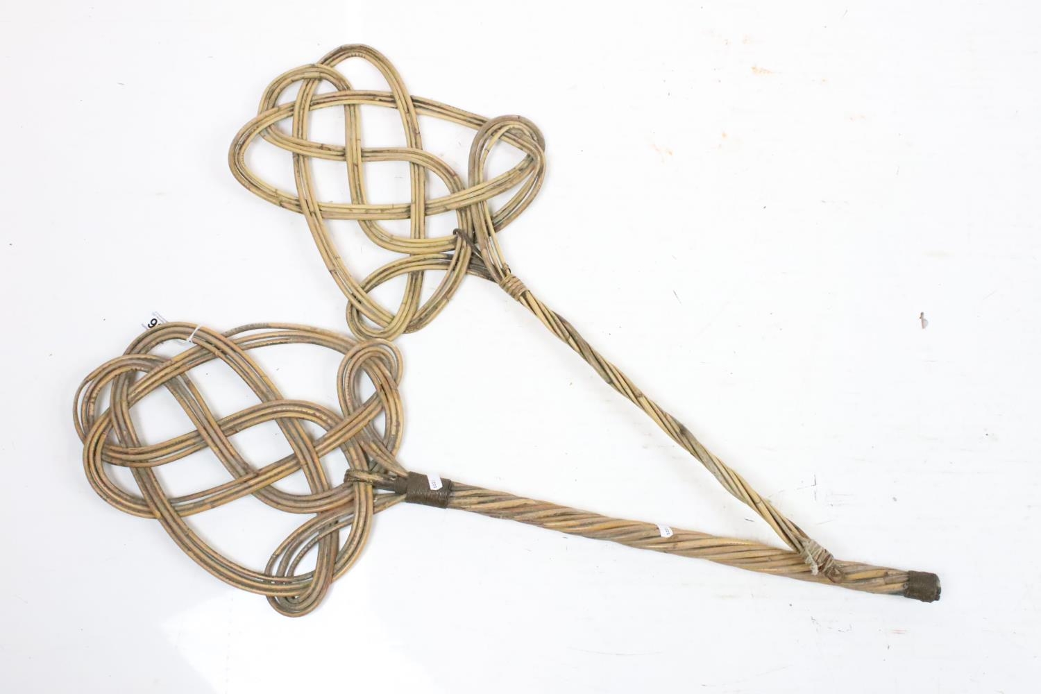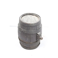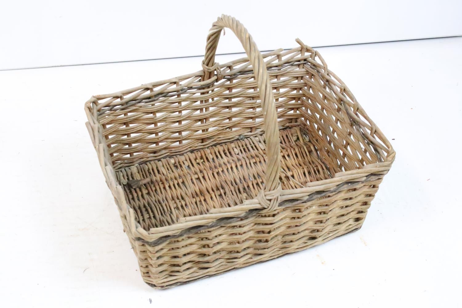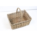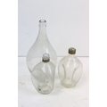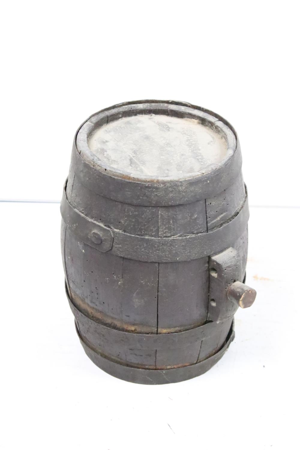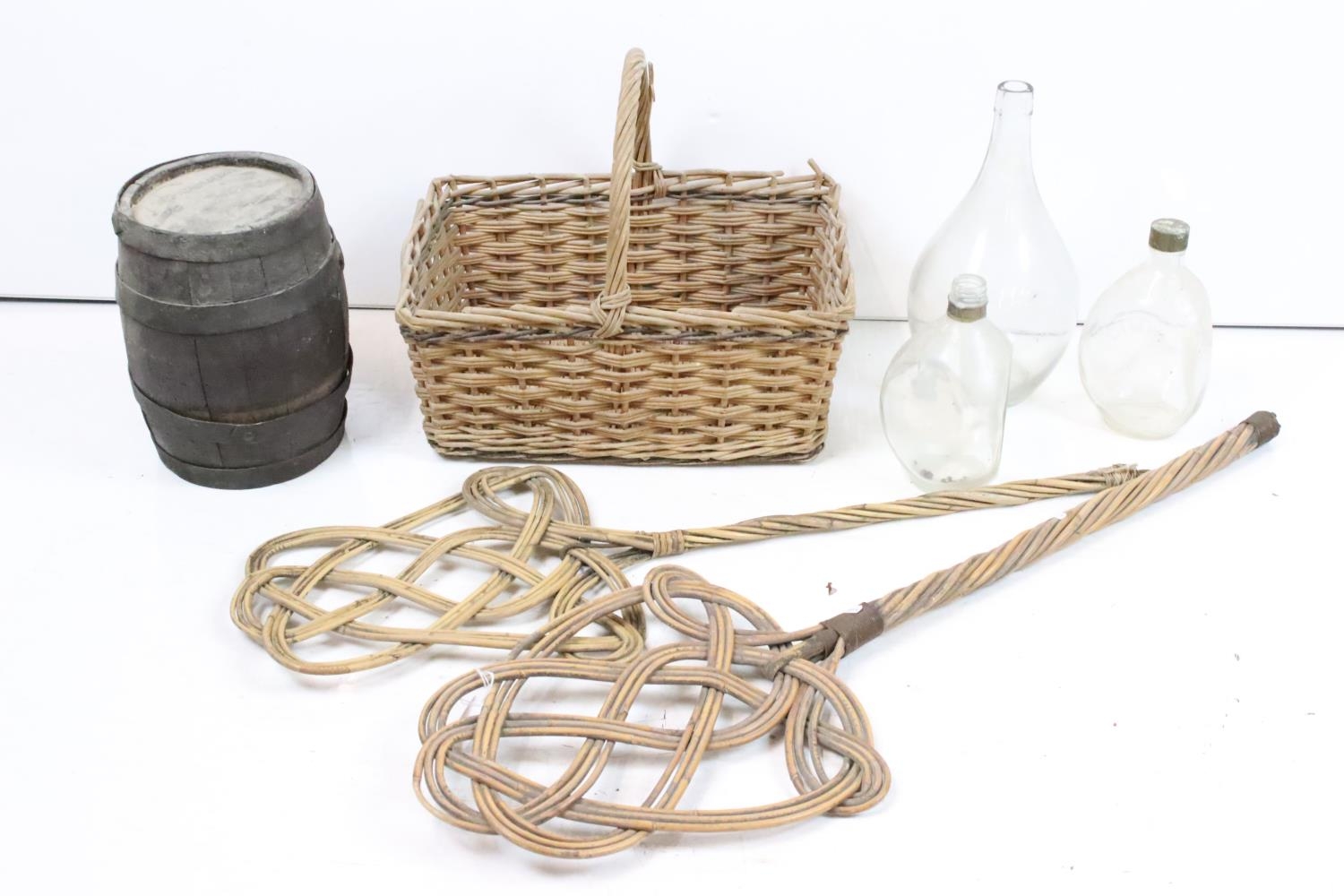 Vintage coopered wooden keg with cork stopper (approx 25.5cm high), together with a wicker basket, pair of wicker rug beaters, 2 x 'Dimple' glass bottles and a further glass bottle