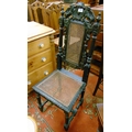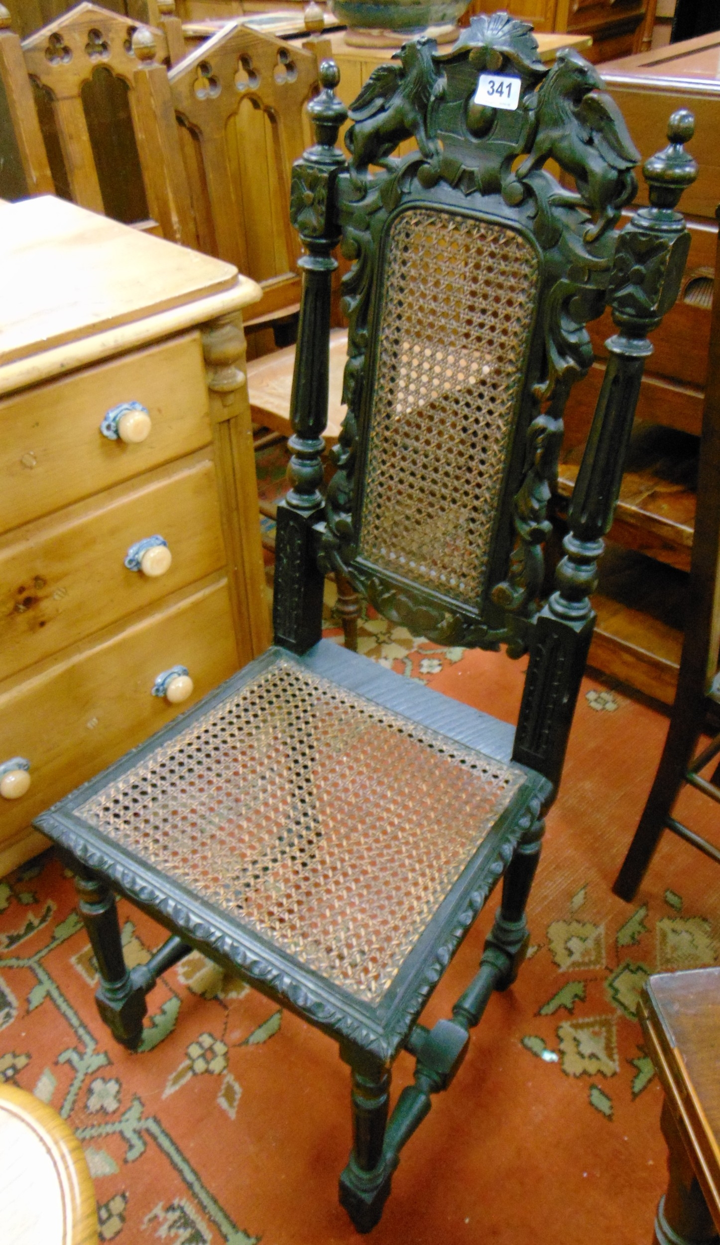 An oak hall chair, having cane back and seat, set on fluted turned supports.